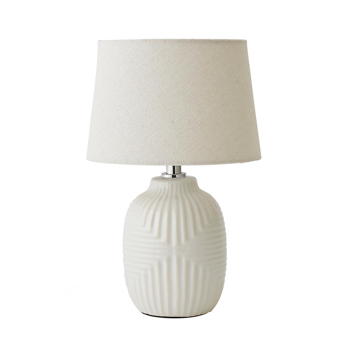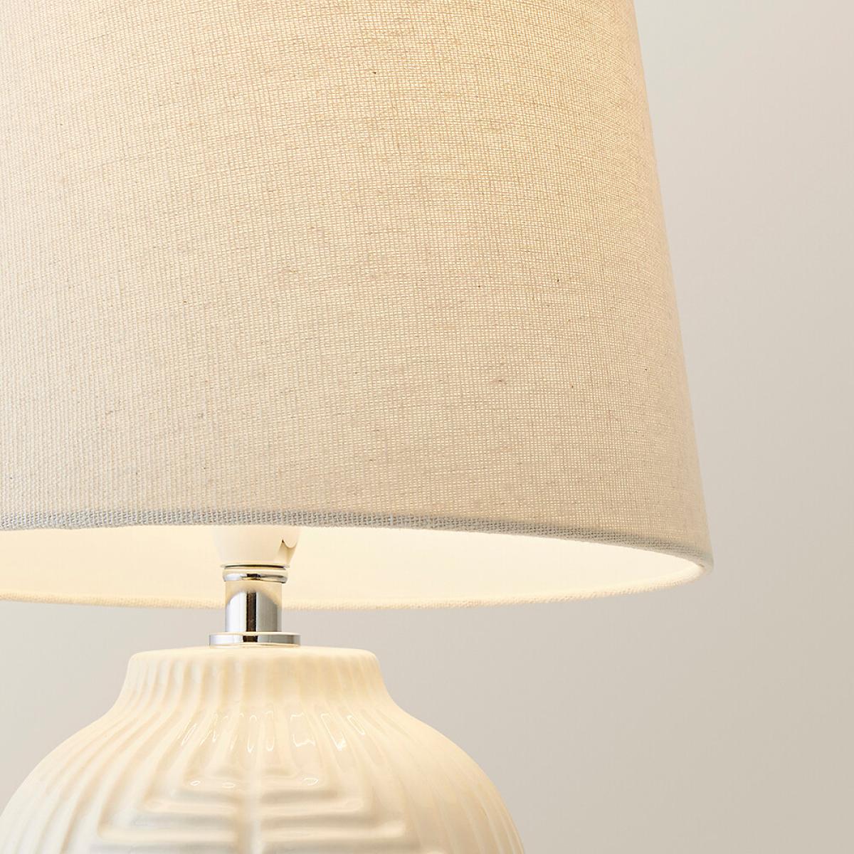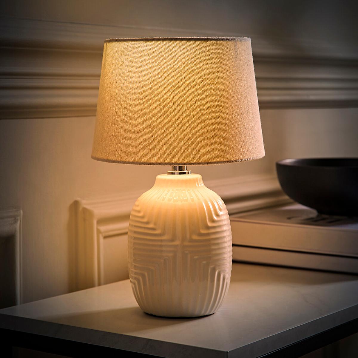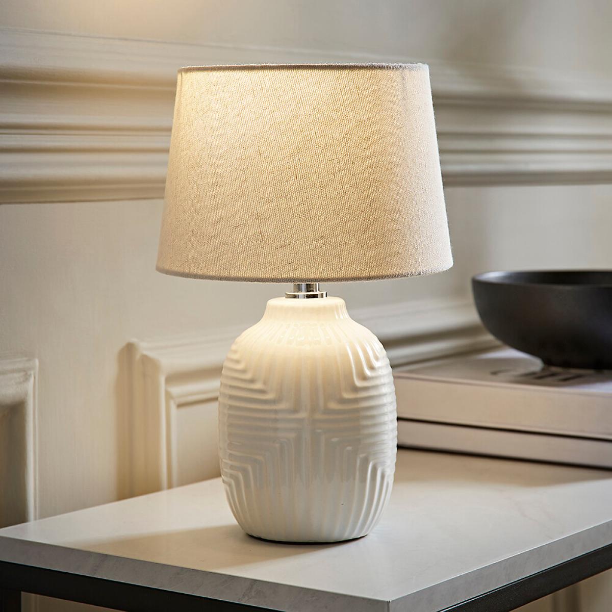 Introducing the table lamp that brings effortless style to any room! With its glossy white finish and geometric ribbed design, it's a real statement piece. The colour-matched fabric cable keeps things coordinated, while the brushed chrome cap offers a modern edge and levels up the quality. Topped with a soft linen shade, this lamp combines cosy lighting with contemporary flair. Available in small, medium, and large, it's the perfect choice for any space looking for a little extra glow.