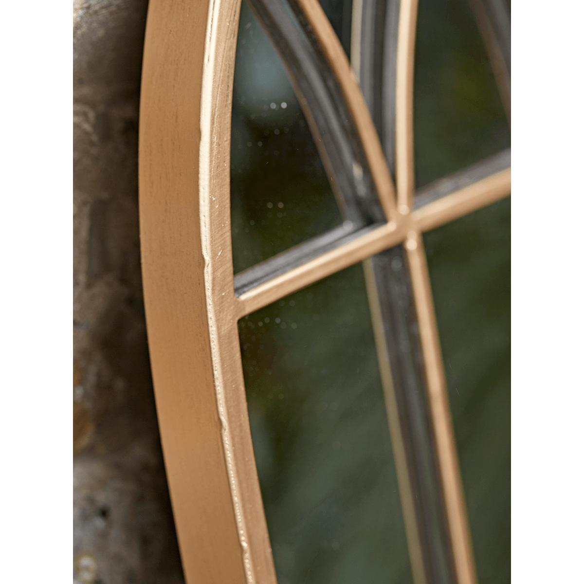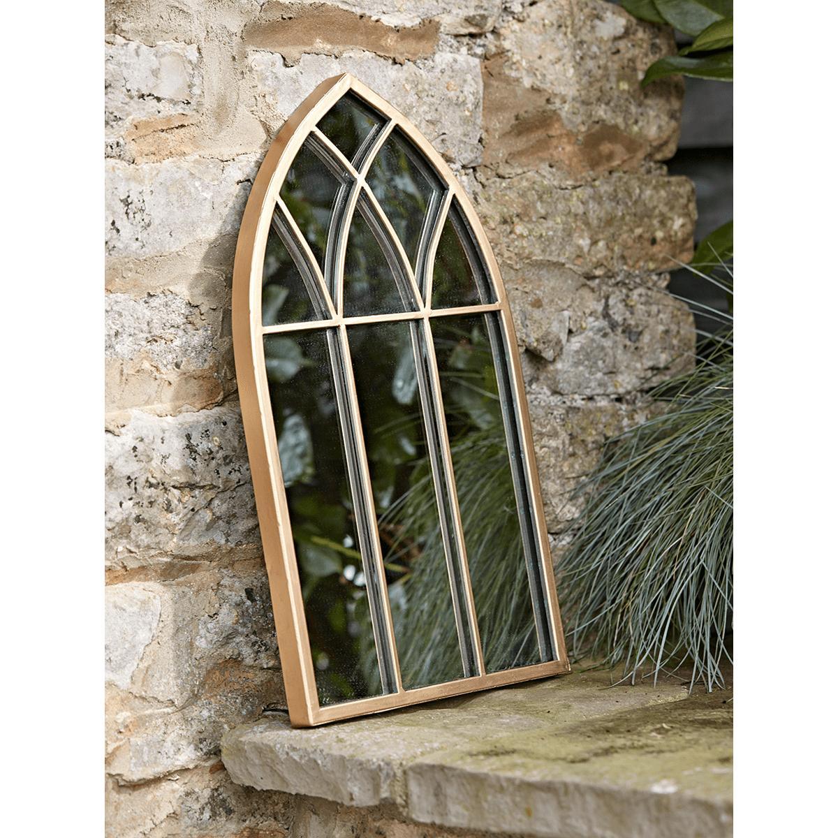 Inspired by gothic arches, add new dimension to your outdoor space with our small window mirror. Made from gold finished metal our mirror is suitable for outdoor use and with a lightly antiqued finish will weather over time to exude a rustic charm. Prop against the house or hang on a garden wall to brighten up even the smallest of spaces.