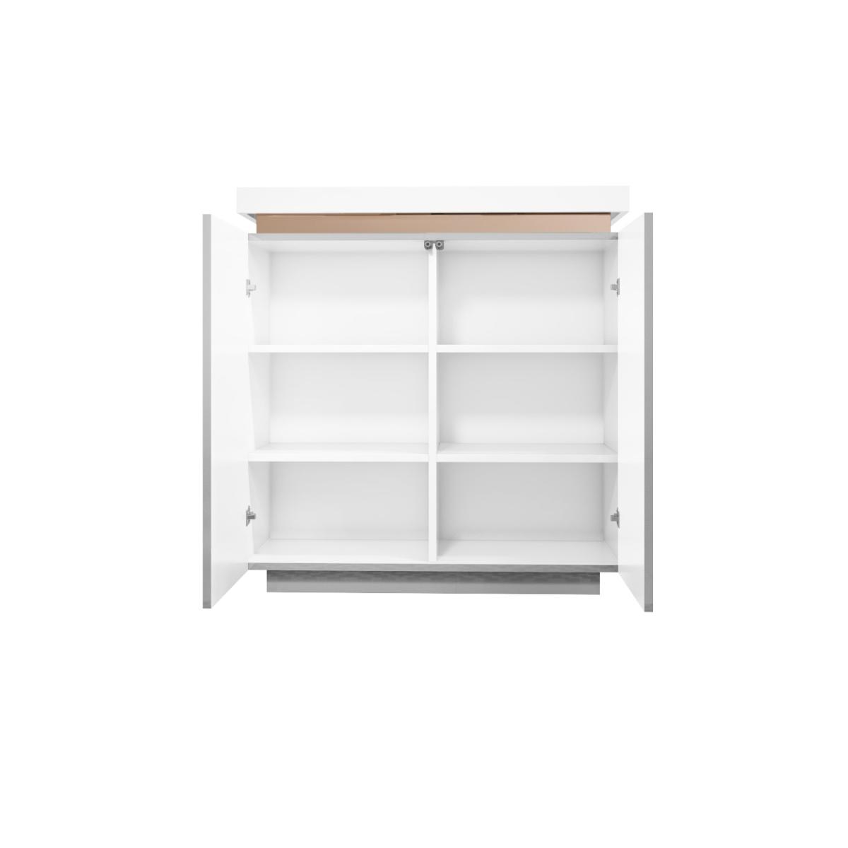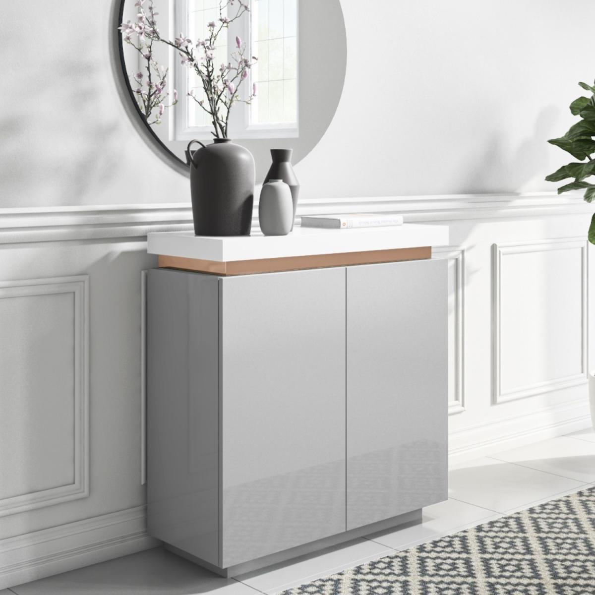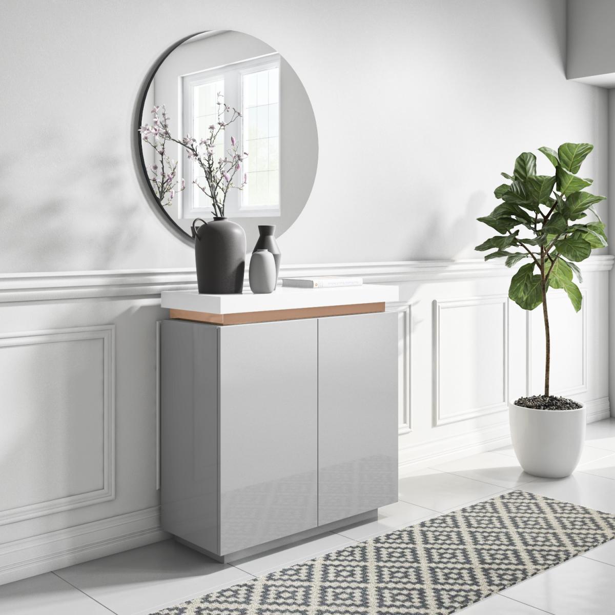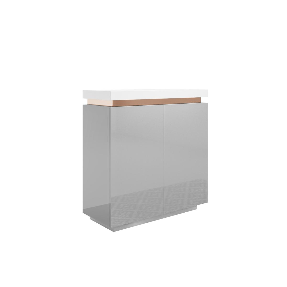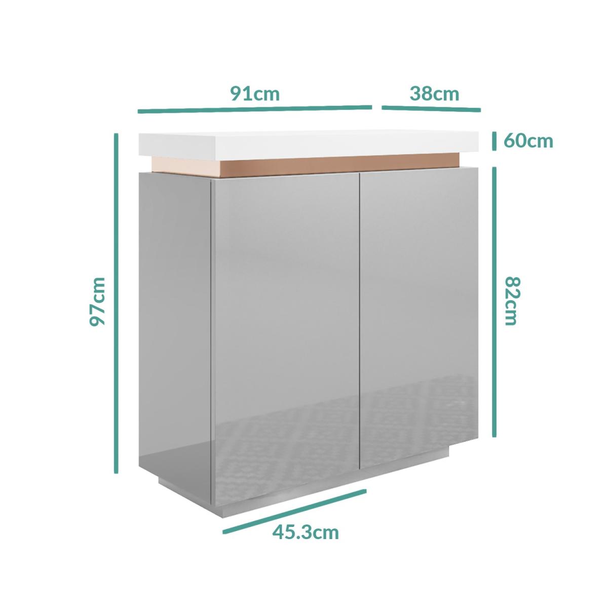 Features we love Creates an instant focal point with its eye-catching contemporary design. The unique brass inlay strip against the white and grey makes a luxurious contrast. Two-door cupboard with six compartments offer plenty of storage. Can be used as a shoe cabinet placed in the hallway as projection is only 38cm. Its sleek clean gloss finish gives it a natural shine enhancing the look of light and space. Matches pieces available in the Vivian range of furniture Need to know. Dimensions. H97 x W91 x D38 cm Number of doors. 2 Colour. White grey and brass Finish. Gloss Material. Wood (combination) and brass (inlay) For use. Indoors Weight. 26kg Assembly required. Yes.