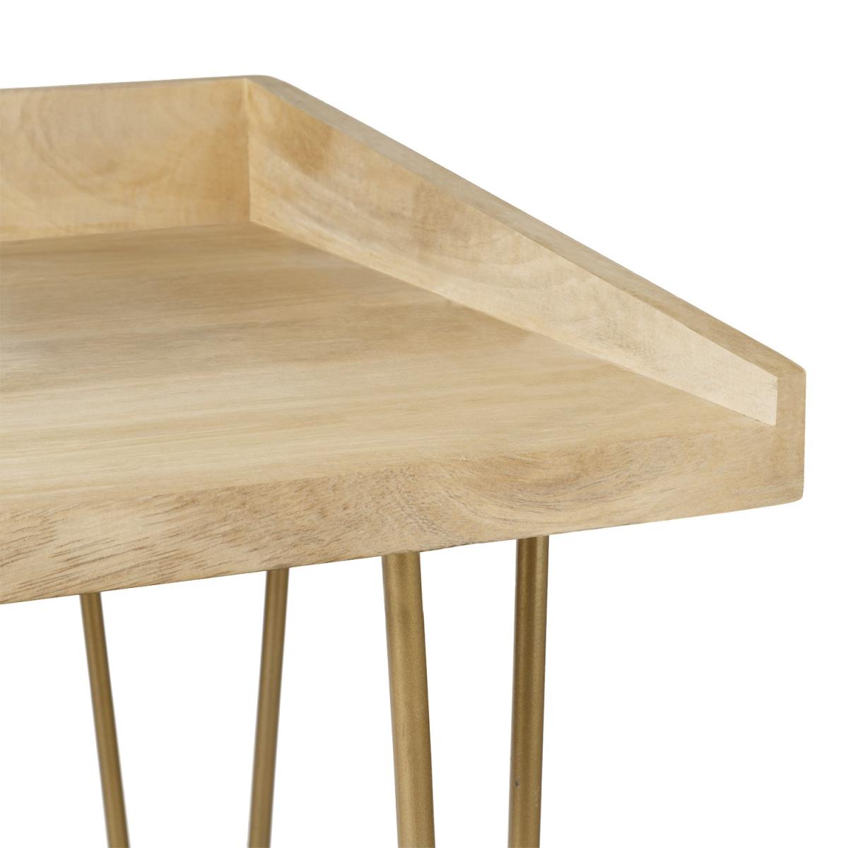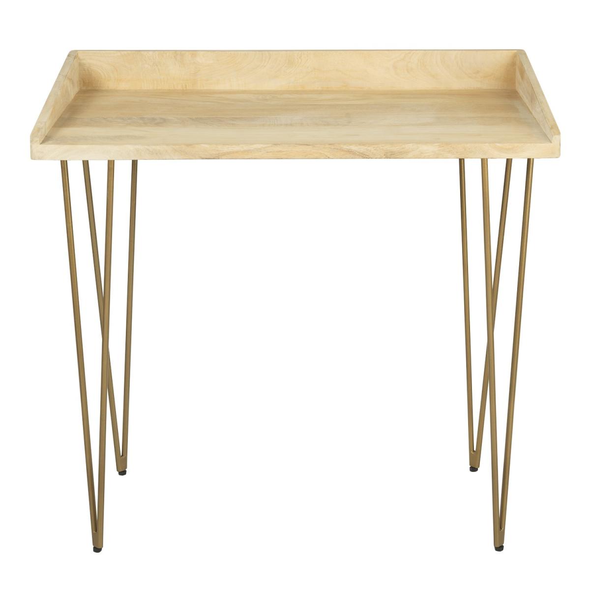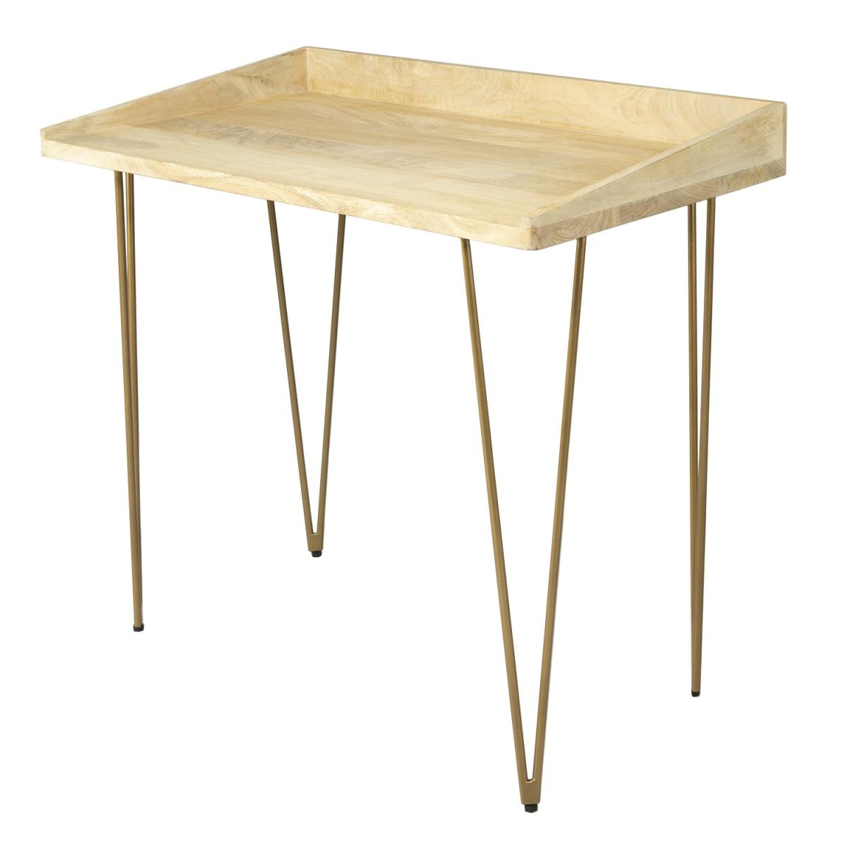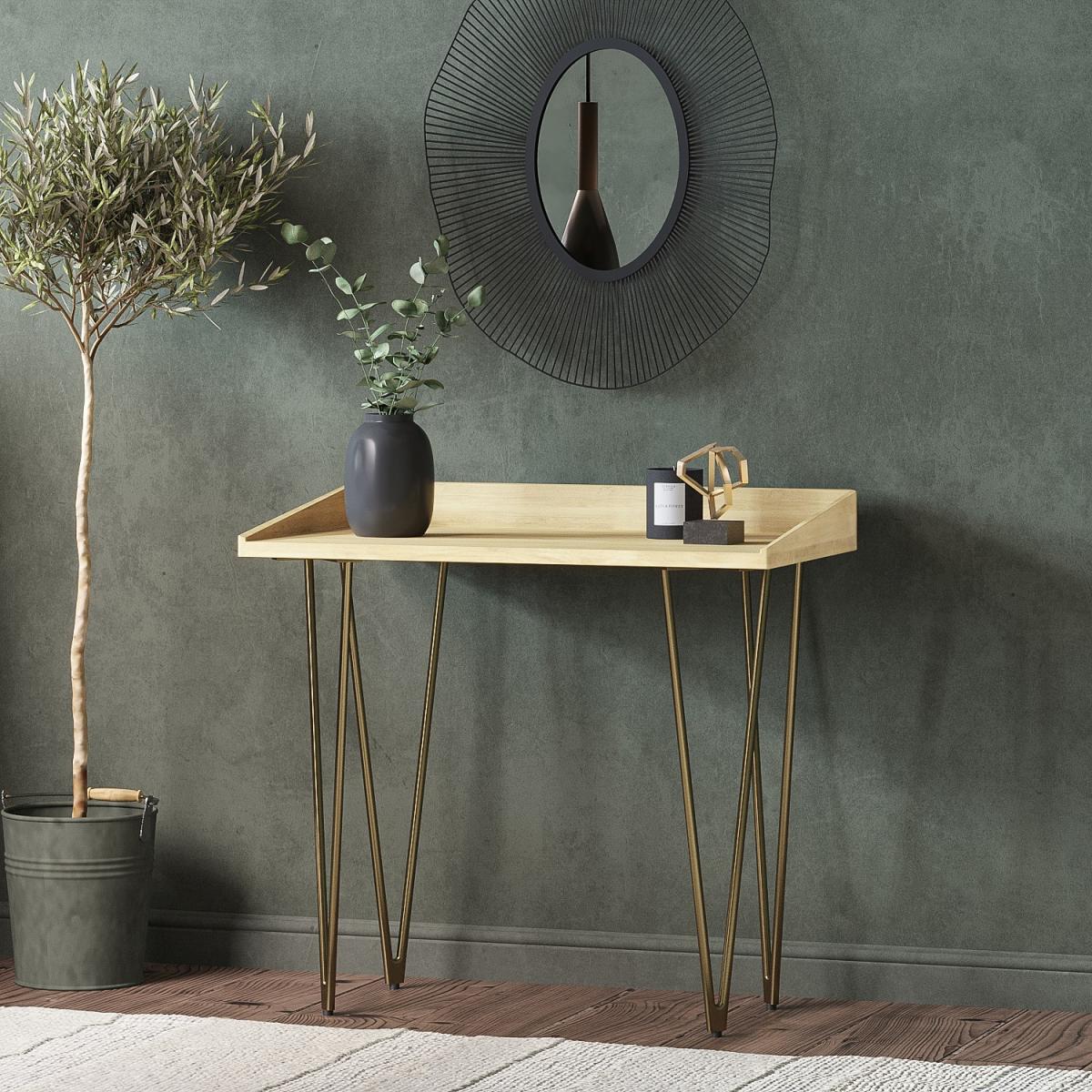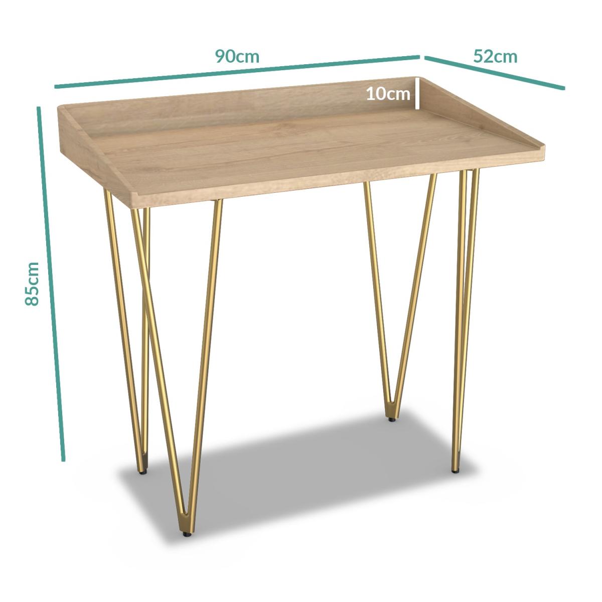 Features we love Modern on-trend design; it'll add an instant style fix to any home or office space. Expertly handcrafted making it truly unique and individual to you. Gold metal hairpin legs contrast beautifully with the natural light wood tabletop Distinctive slim iron hairpin legs create an illusion of space in your chosen space. Crafted from solid mango wood and iron it's sturdy and built to last All about me. Work or study in style on this stunning Inari desk. With raised edges helping to keep your stationery and loose pens put. It makes a versatile addition to any home or office used as a desk or even a console table in the hallway. Handcrafted from mango wood it boasts a gorgeous woodgrain with a natural finish so no two pieces are the same. The sleek eye-catching gold hairpin legs complete the look while also creating an illusion of space. There's minimal assembly required; it's just a case of fixing the legs in place. Need to know. Dimensions. H85 x W90 x D52 cm Packed Dimensions. H25 x W98 x D60 cm Colour. Gold and natural Finish. Stained matt and powder coated (legs) Material. Mango wood and iron (legs) Weight. 15kg Assembly required. Yes.