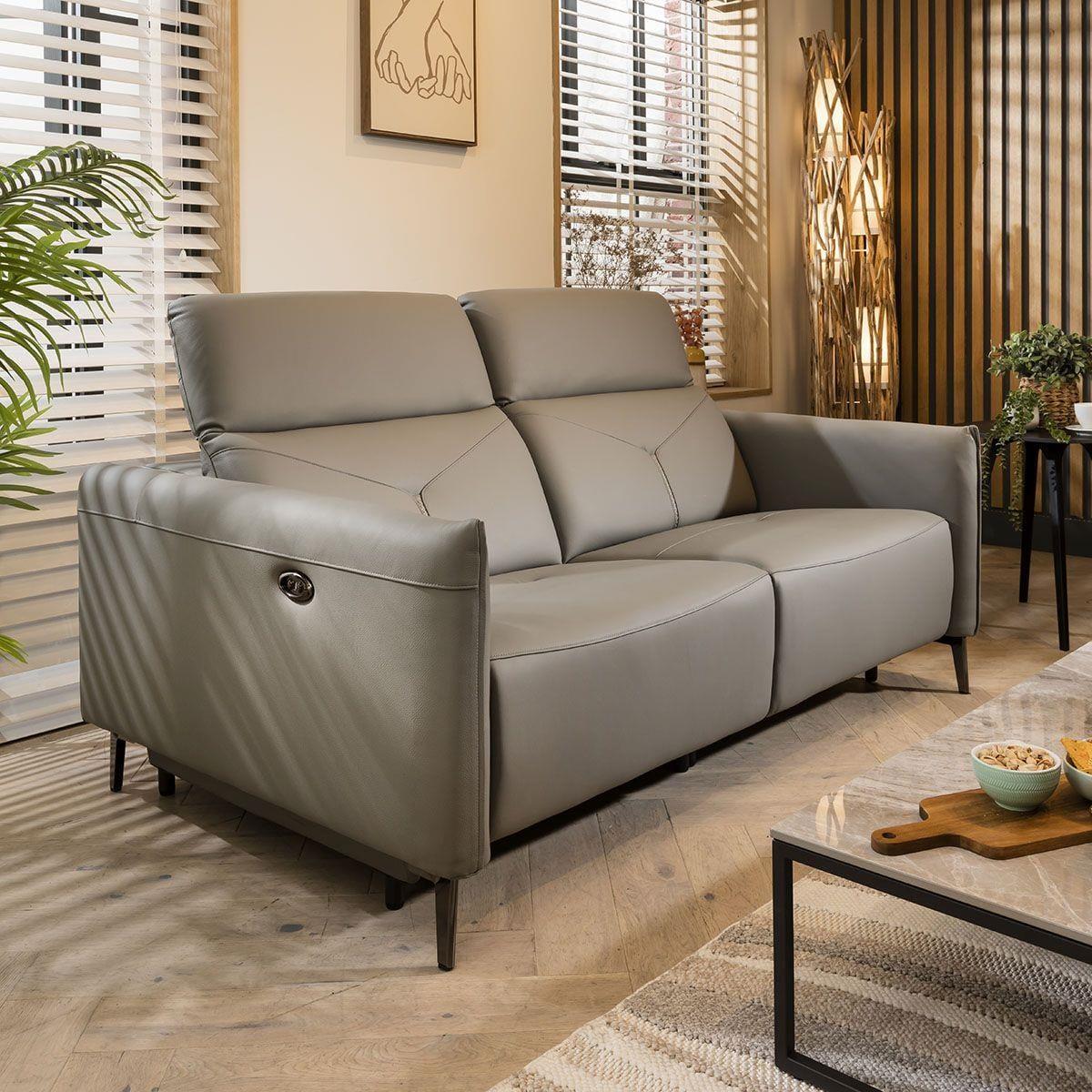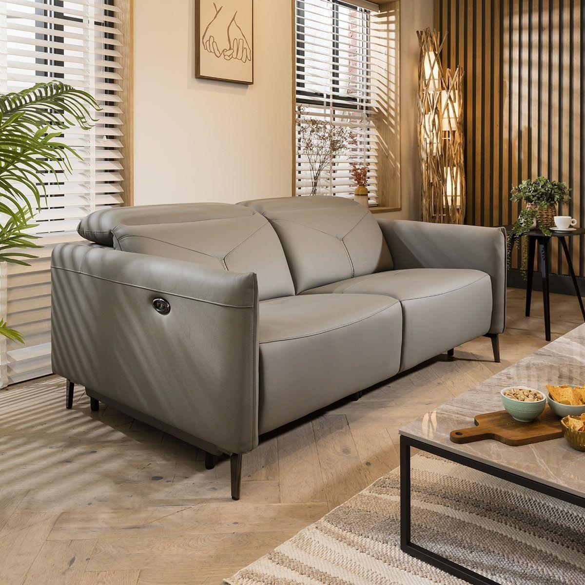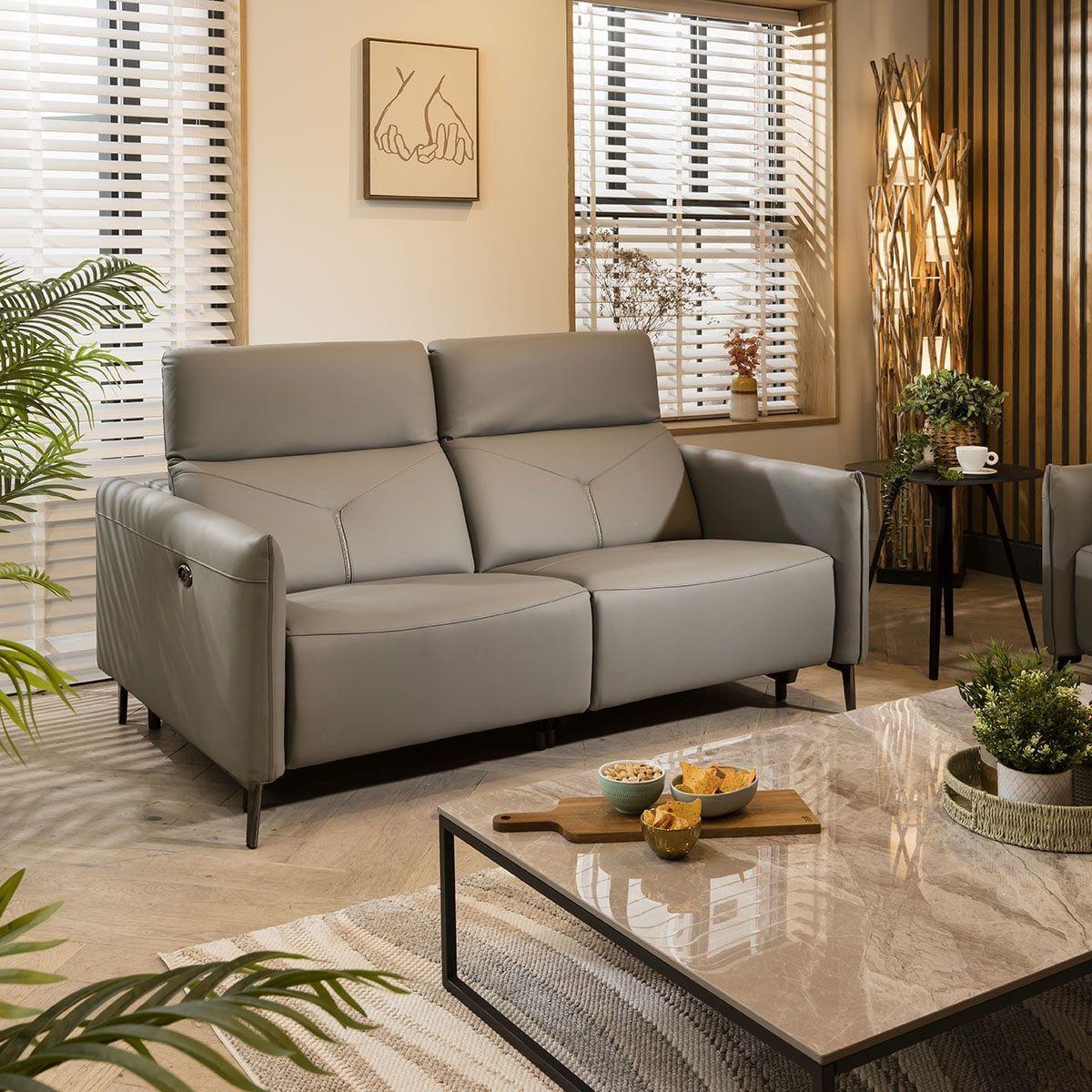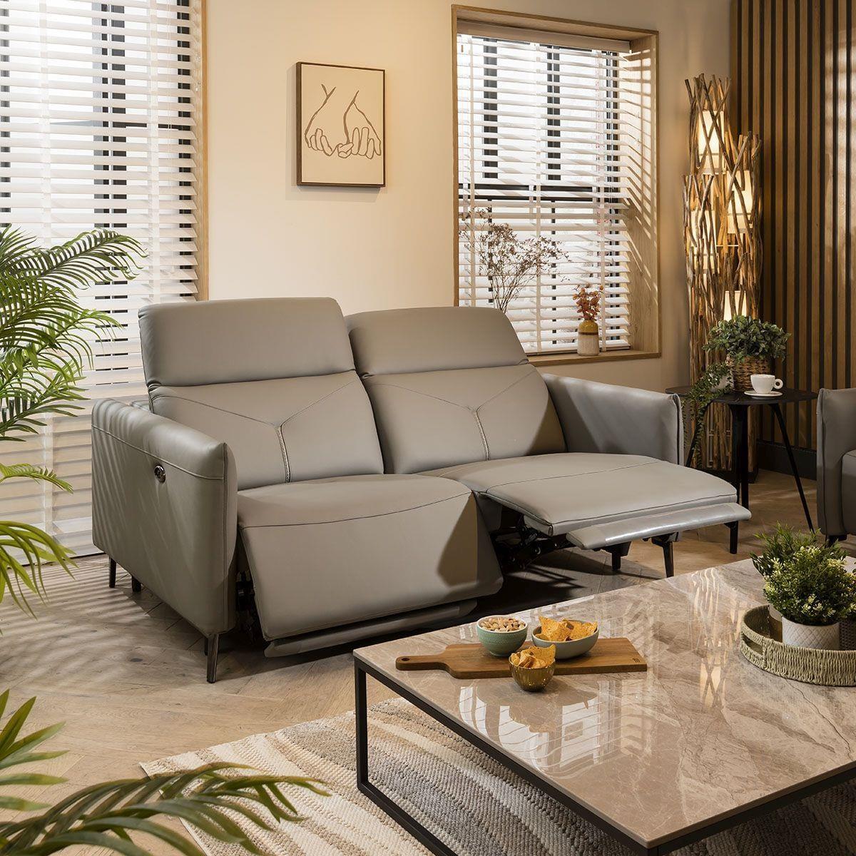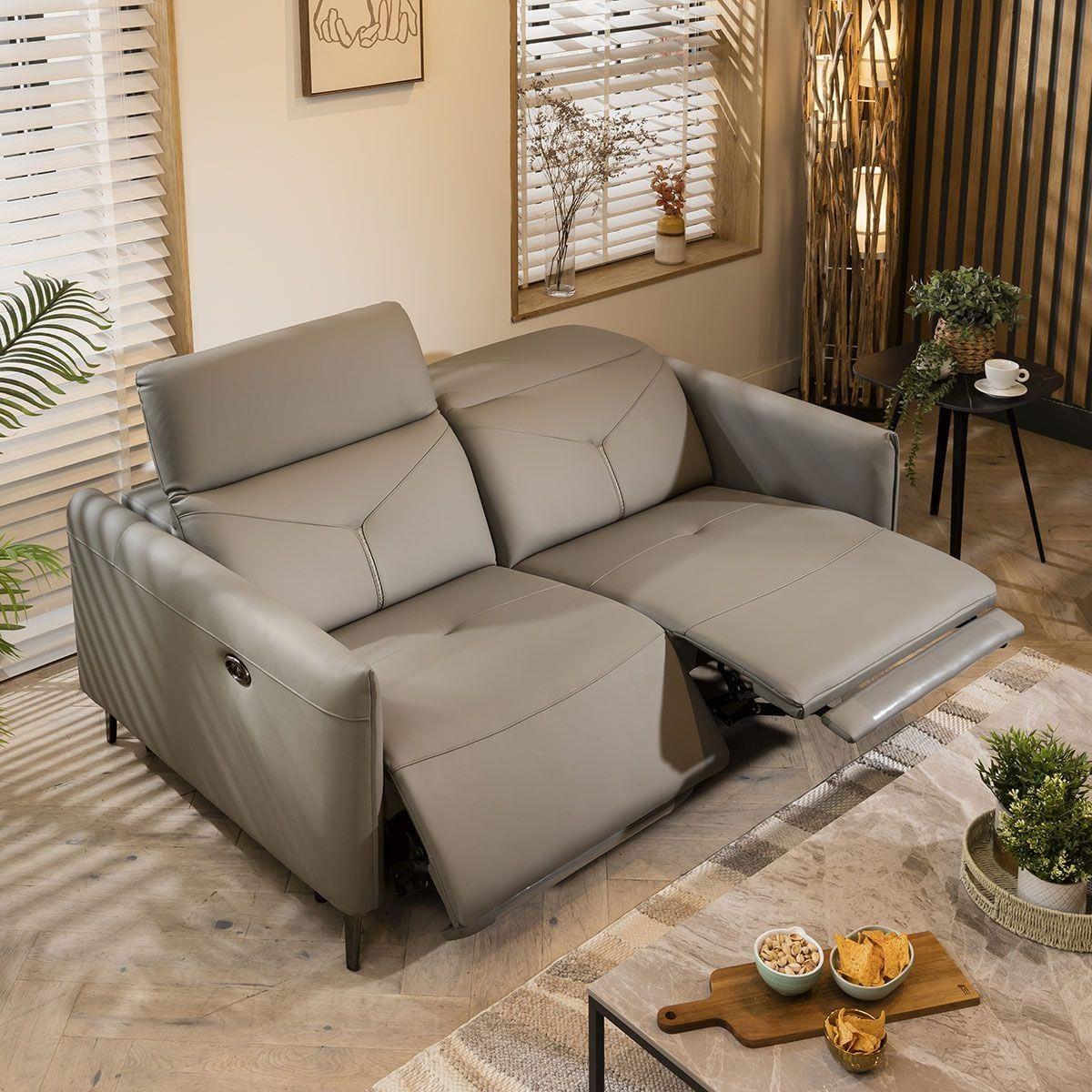 Get relaxation at the touch of a button with this modern grey 2-seater leather sofa - the epitome of luxury and comfort. With modern design and gunmetal legs, the leather reclining sofa is perfect for contemporary spaces. Simple controls on the side of the electric recliner sofa offer effortless recliner comfort. The sofa is not only comfortable but also convenient. The 3.5m power cable ensures that you can place the sofa wherever you want in your living room, without worrying about the proximity of a power source. The high back design and modern stitching detail add a touch of elegance to your space. With amazing build quality, this sofa is sure to be the centerpiece of your home. The genuine leather used on the seats and arms of this sofa is of the highest quality, ensuring durability and longevity. Premium faux leather is used on the outer-arms and back, this material is easy to clean and durable. The rich grey color gives the sofa a classic, sophisticated look that complements any decor. The gunmetal legs provide stability and a sleek finish, elevating the overall design of the sofa. Our premium leather, rich grey 2-seater recliner sofa is the ultimate choice for those who value comfort, convenience, and style. With its modern design, high-quality materials, and exceptional build quality, it is sure to impress. So why settle for anything less? Upgrade your living space today with our luxurious and expertly crafted sofa. W160cm D105cm H75cm This sofa requires some assembly - each seat is modular and they connect together. The legs also need to be attached to the sofa Genuine leather on the seats & arms. UKFR faux leather on outer-arms and back