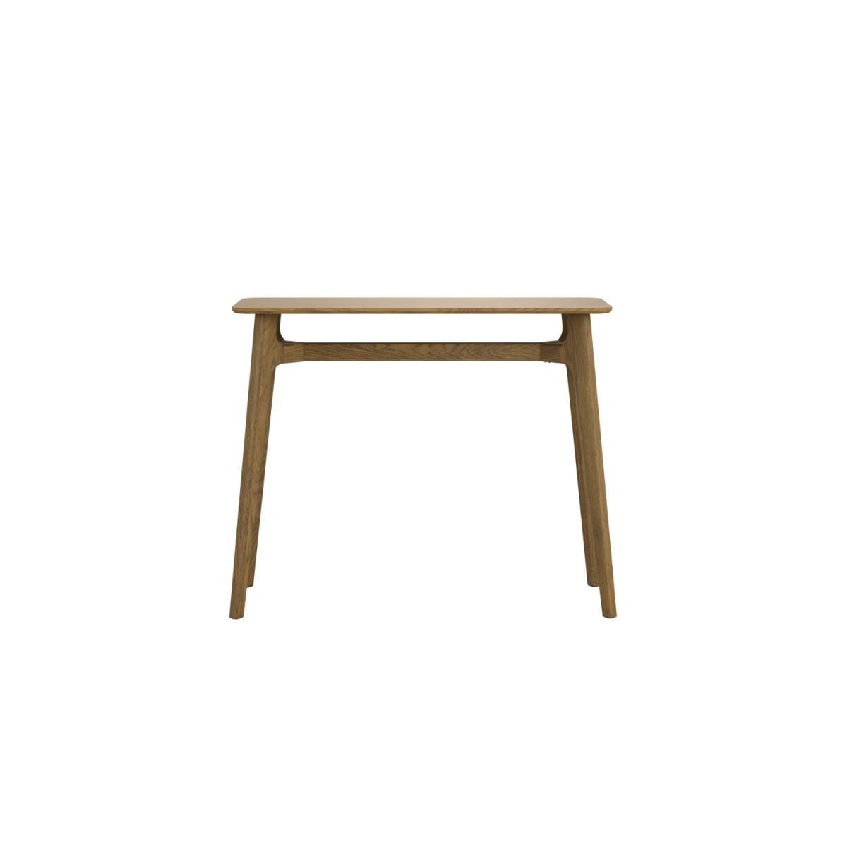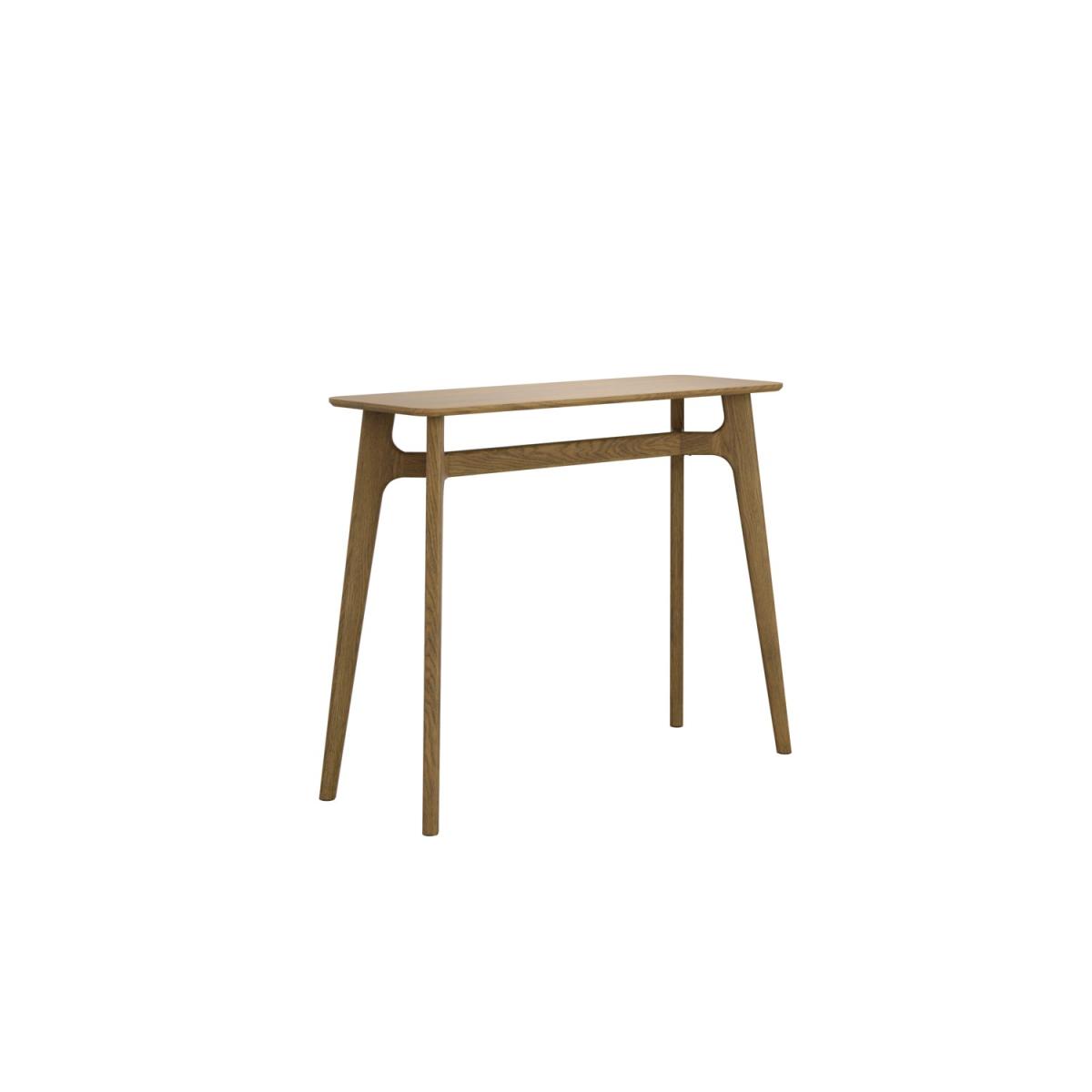 Adds a sophisticated and timeless touch to any space, combining rich tones with a modern aesthetic. Crafted with oak veneer legs, this console is as durable as it is beautiful. The sturdy structure ensures stability and long-term use. Ideal for various spaces in your home, such as entryways, living rooms, or hallways, offering both function and style. Designed for hassle-free assembly, making it a practical addition to your home with minimal effort. Combines modern design with the practicality of extra storage or display space. The Kitt Console Table combines style and functionality with its sleek smoked wooden frame and elegant oak veneer finishes. Its versatile design allows it to seamlessly fit into any space, whether in your hallway, living room, or entryway. The natural wood tones bring warmth and sophistication to your home, while its practical surface provides ample space for display or storage. Easy to assemble, this console table effortlessly enhances your space with minimal effort, offering both modern design and everyday functionality. Dimensions:W100 x D35 x H80.5 cm Material:Oak Veneer Finish: Matte Colour: Brown Assembly required: Yes Weight: 9kg Maximum supported weight: 20kg Packed dimensions: W112 x D42 x H13 cm