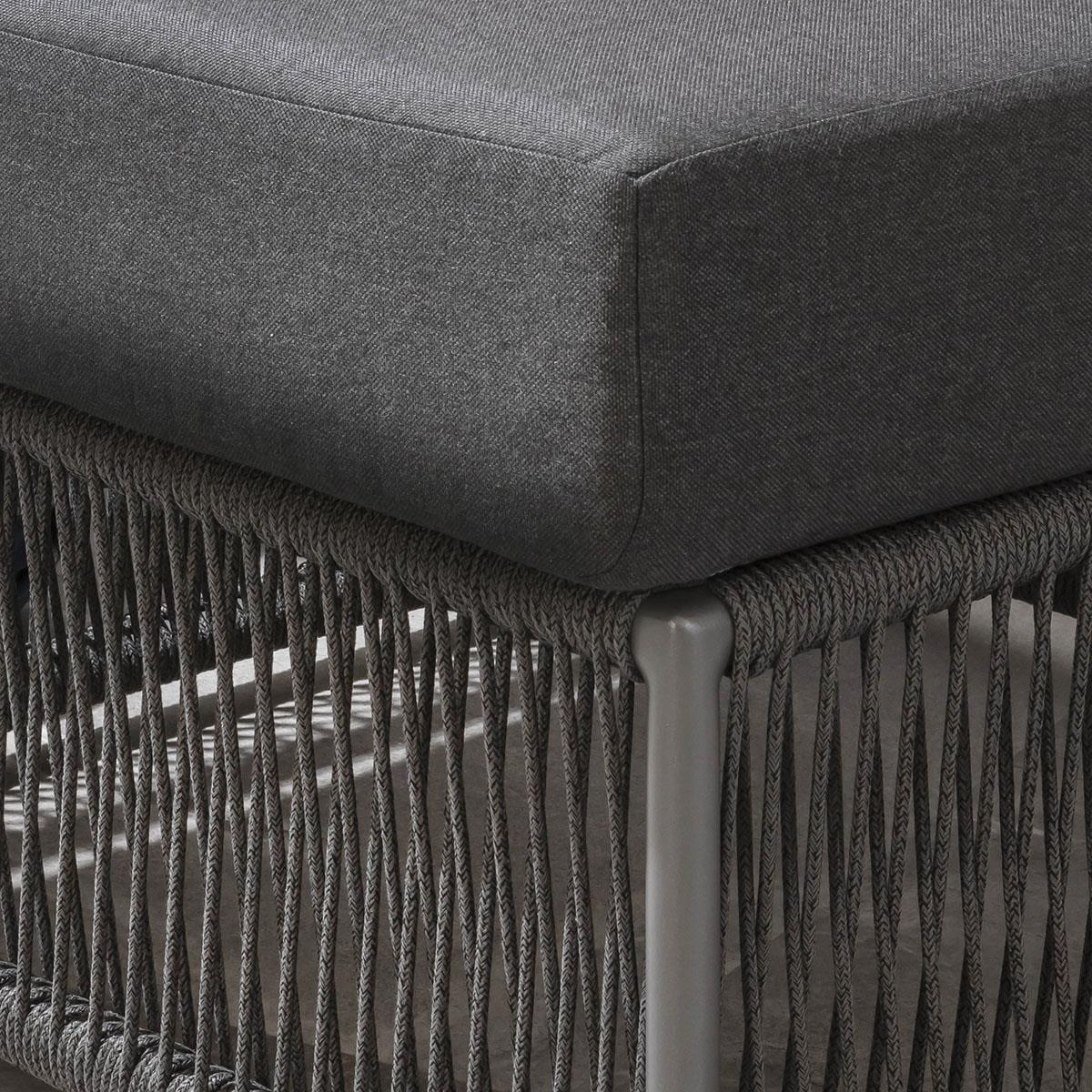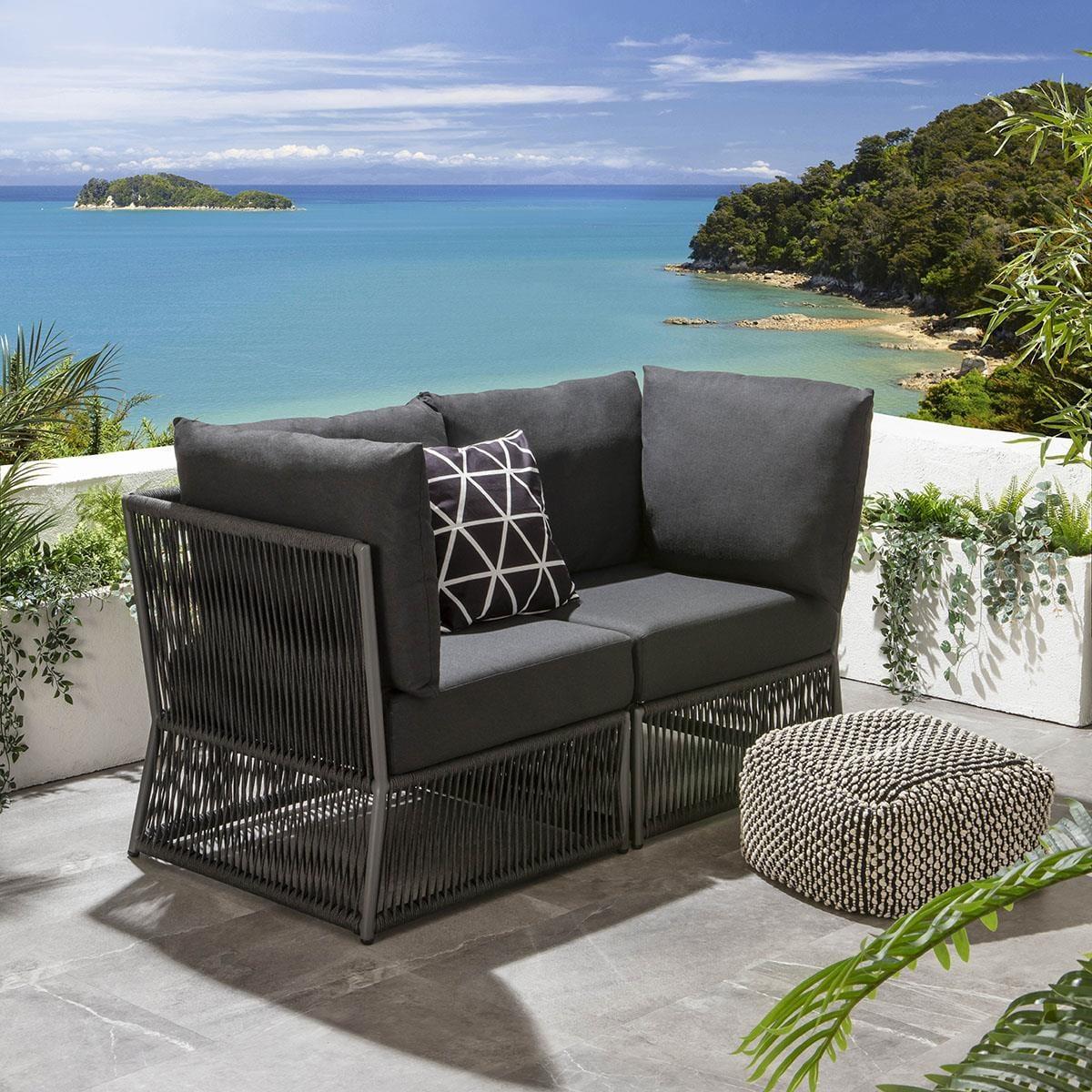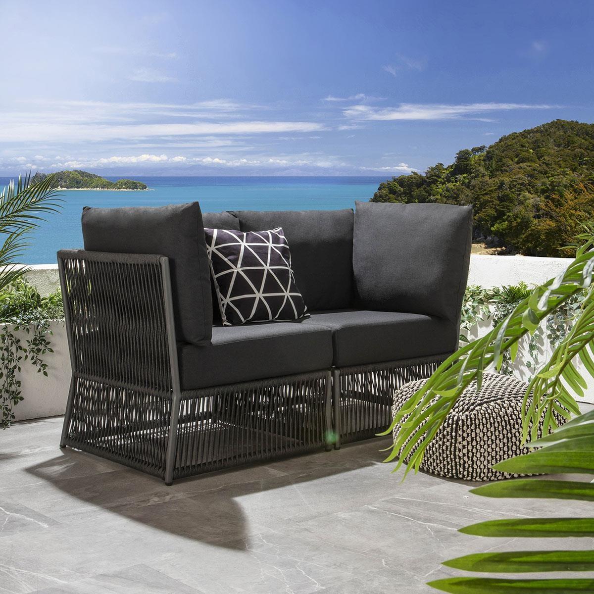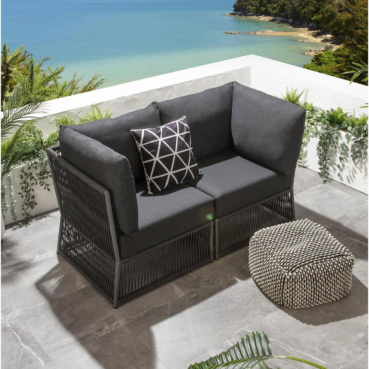 Crafted with a simple yet sturdy aluminum frame, the Cole small 2 seater garden sofa set showcases a modern charcoal outdoor rope weave design. Super-thick cushions, upholstered in a premium grey fabric, ensure the utmost comfort. The patio sofa, measuring 148cm x 74cm. This modular design, based on two key elements a corner and a middle section, provides endless configuration possibilities. The corner sections feature a slightly larger size compared to the middle sections, a deliberate choice to accommodate the ergonomically shaped backrest design. The modules, each approximately 74cm, simplify the planning process for any outdoor space. The footstool's cushion can be removed, revealing a durable marble-effect ceramic top, adding a touch of elegance to your outdoor space. These cushions are made from high-grade foam covered in charcoal grey fabric, offering unbeatable comfort that seamlessly coordinates with the outdoor rope weave design. With a comfortable seat height of 45cm, the cushions feature convenient zips for easy removal and cleaning. For longevity, we recommend storing the cushions when not in use. Unbox, connect the sections effortlessly using the provided connectors, and enjoy your stylish garden retreat no assembly required. Elevate your outdoor living with the Cole modern garden sofa, designed for both aesthetic appeal and adaptable comfort. W148cm D74cm H75cm 2 Piece Garden Sofa Set Weather covers are included