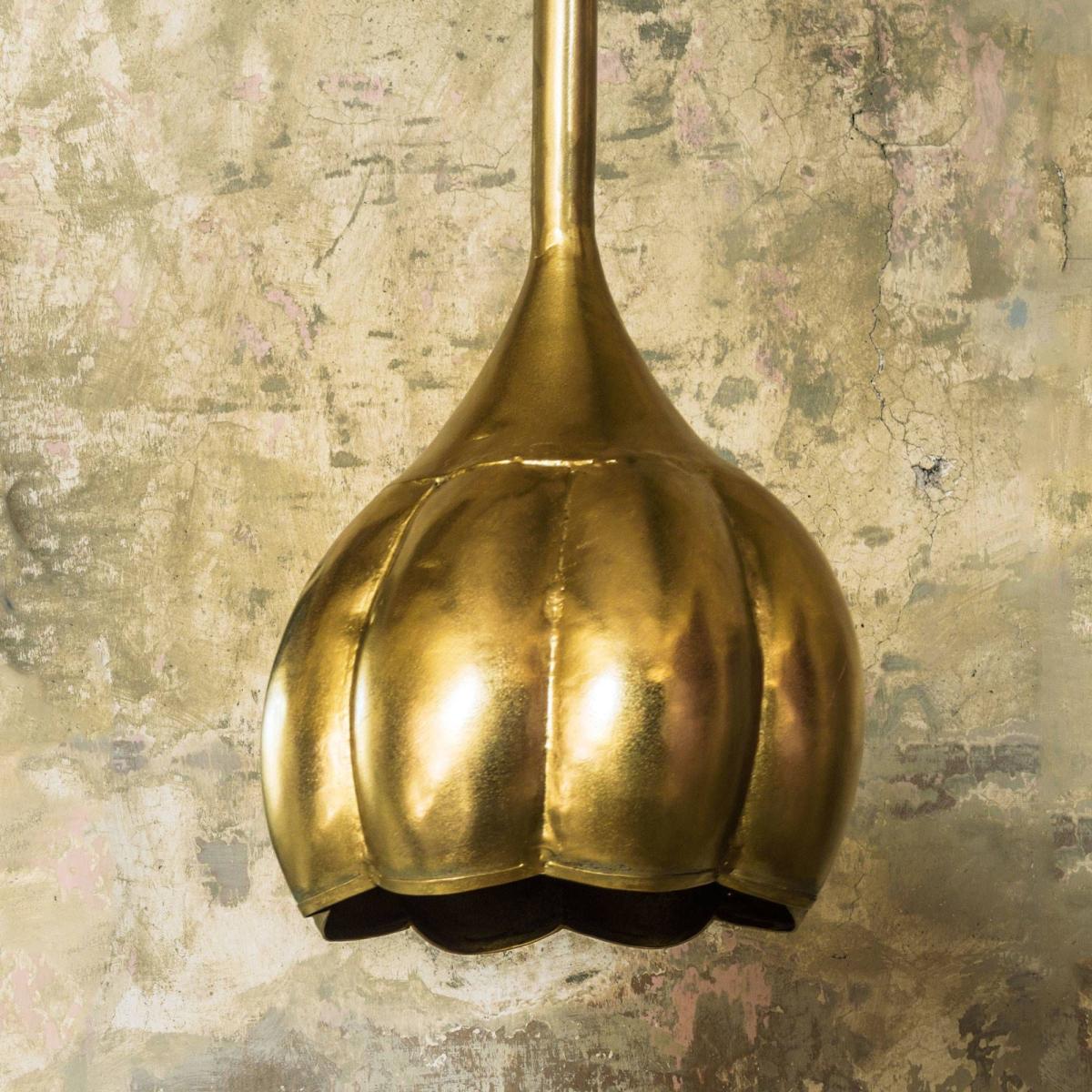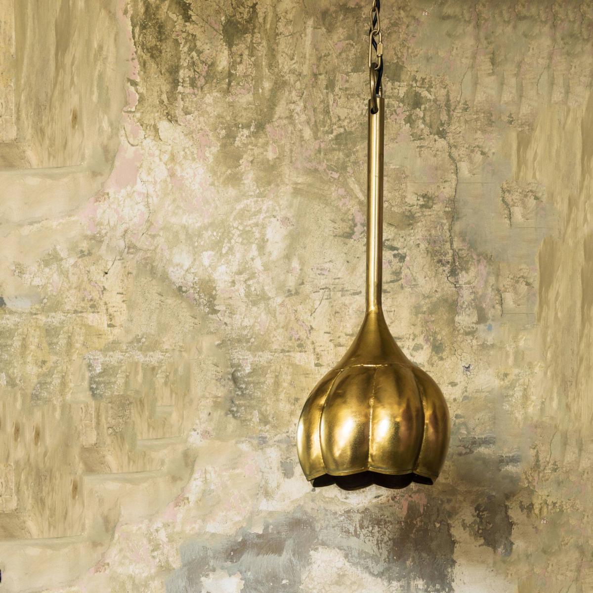 A distinct ceiling pendant with an art deco twist, featuring a rustic brass-plated finish and an exuberantly curved shape.