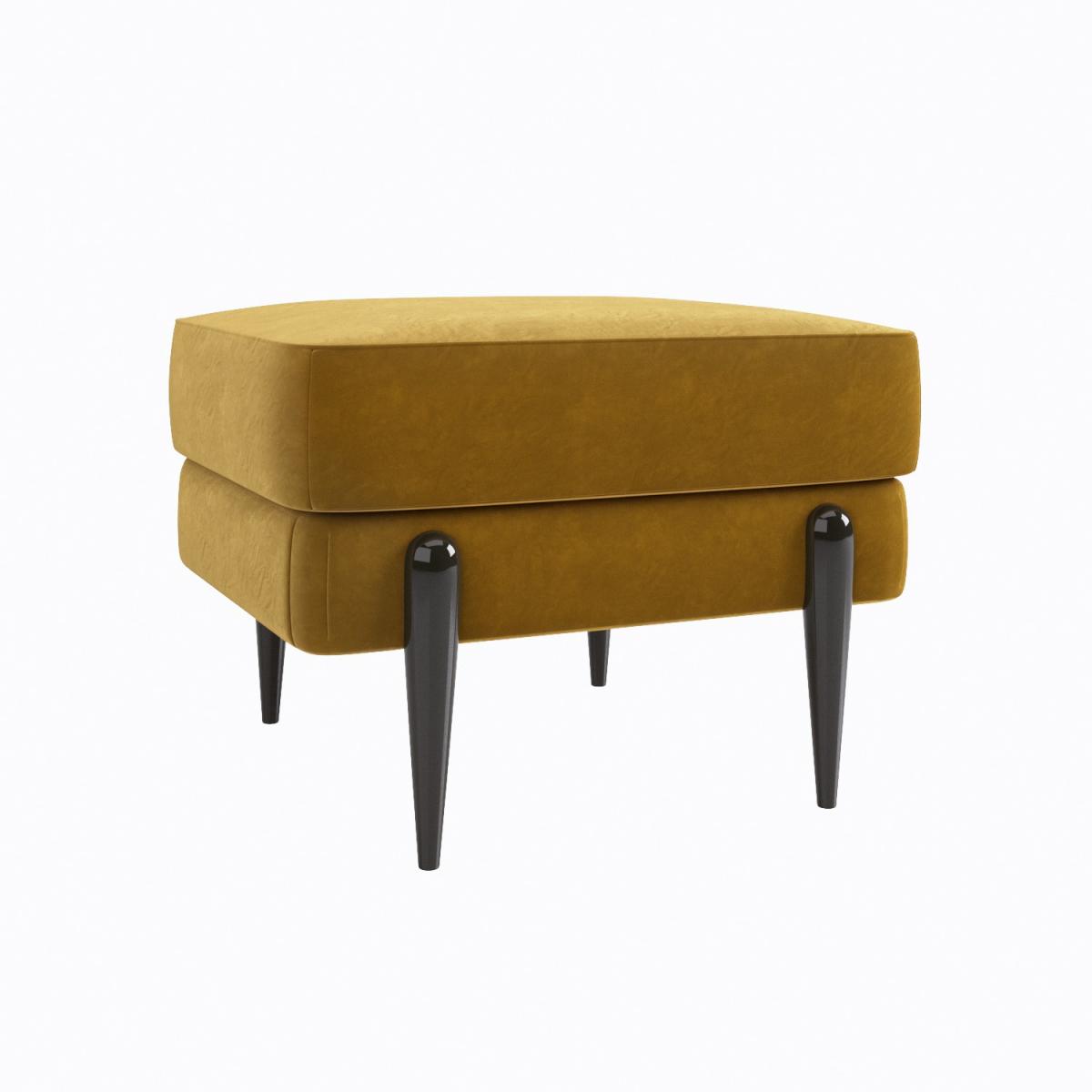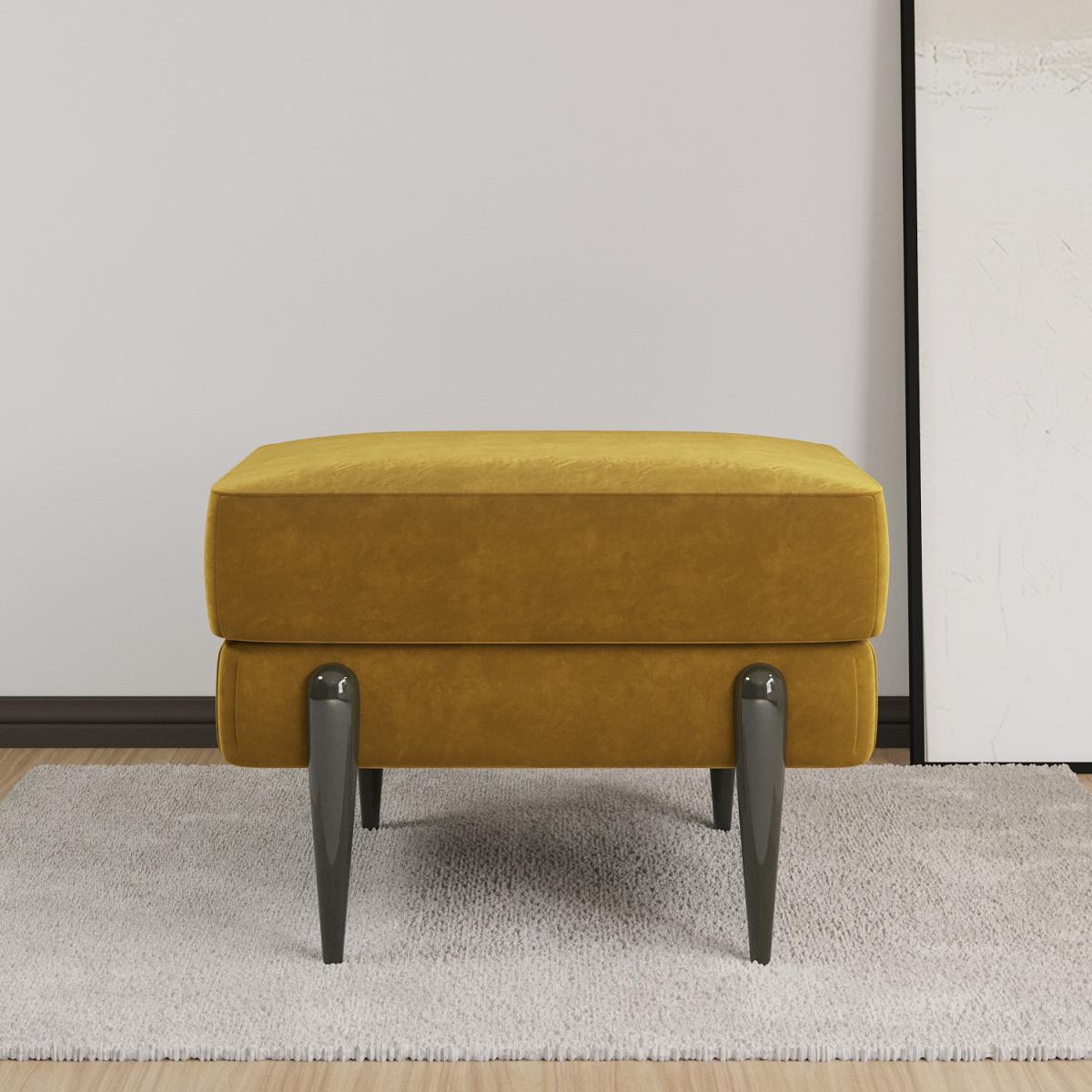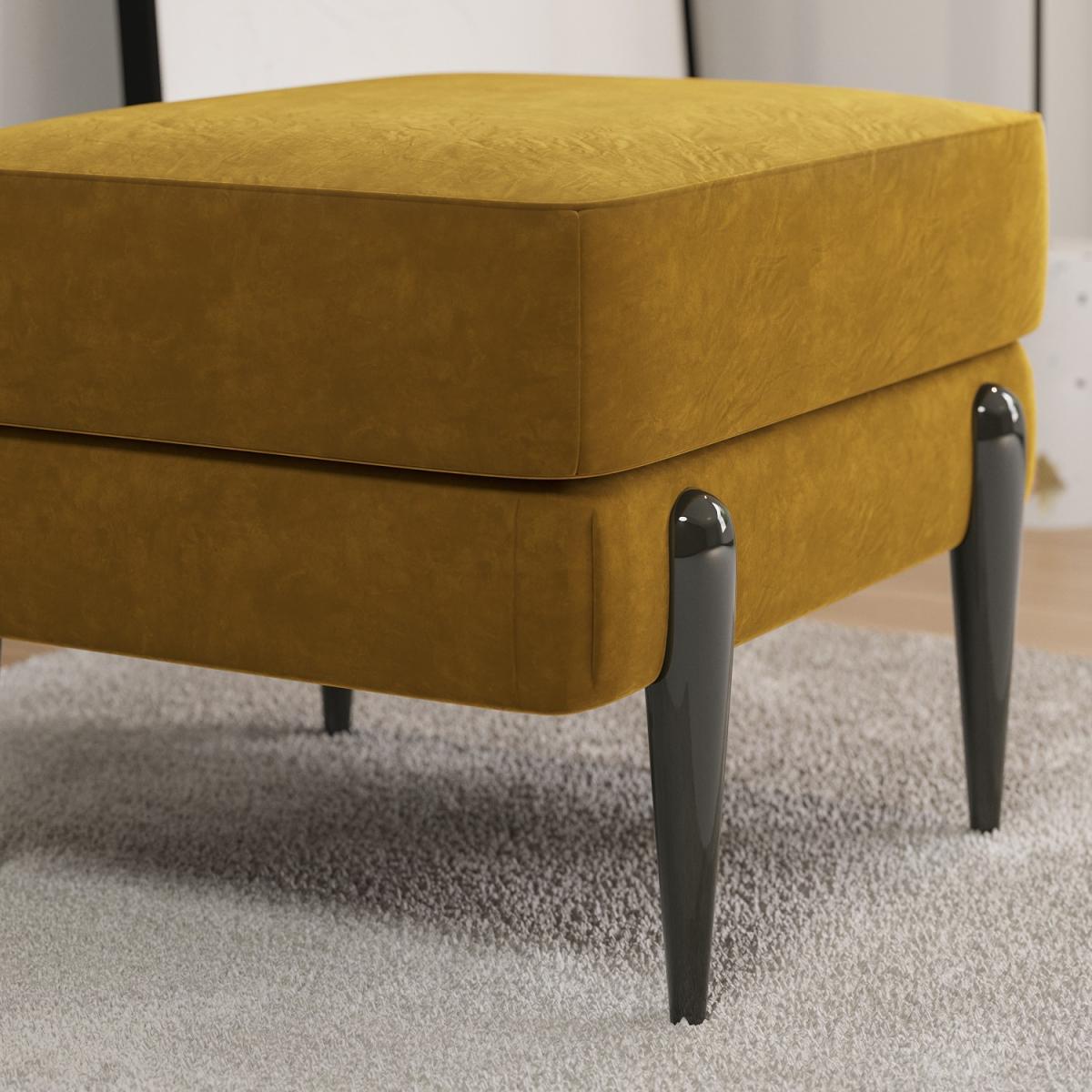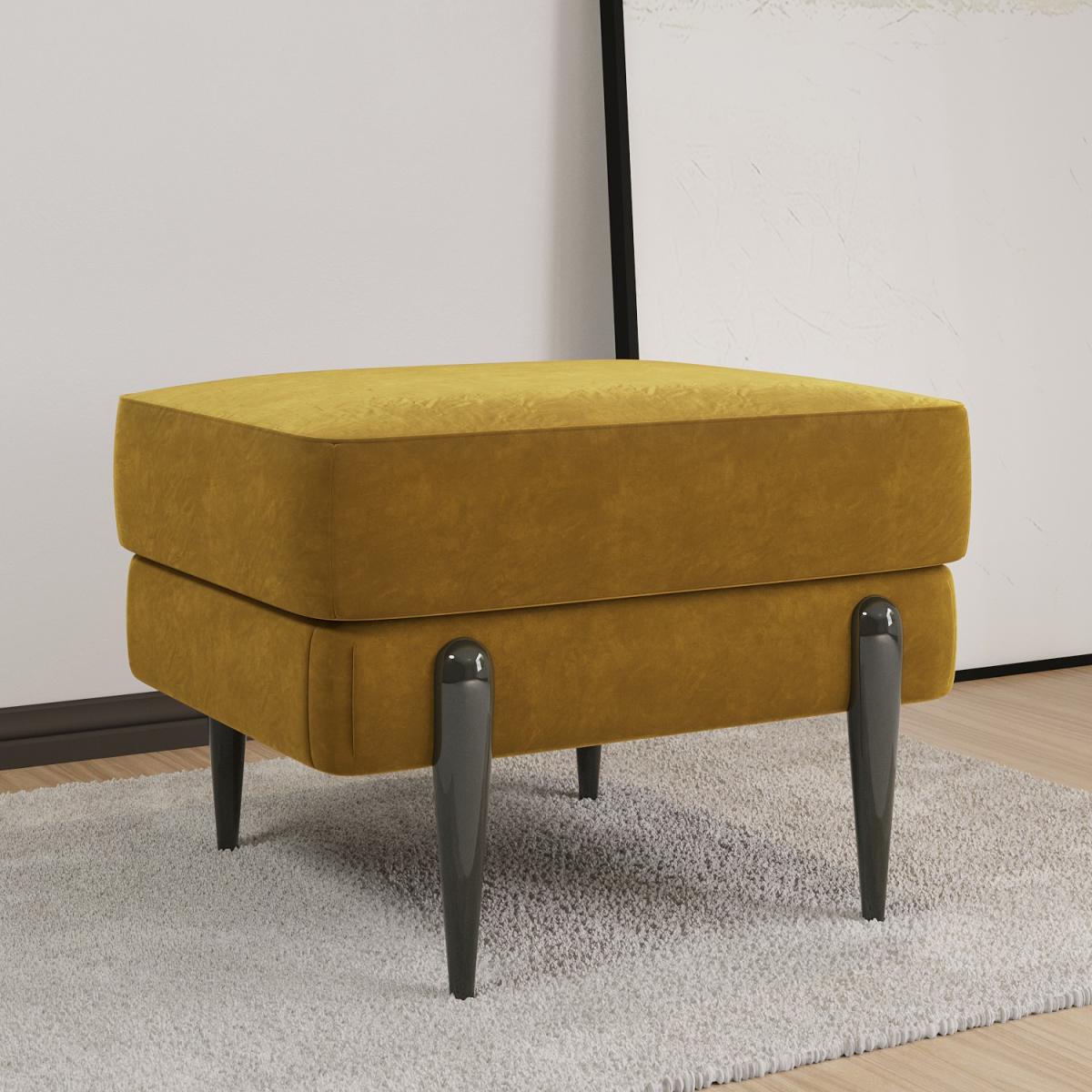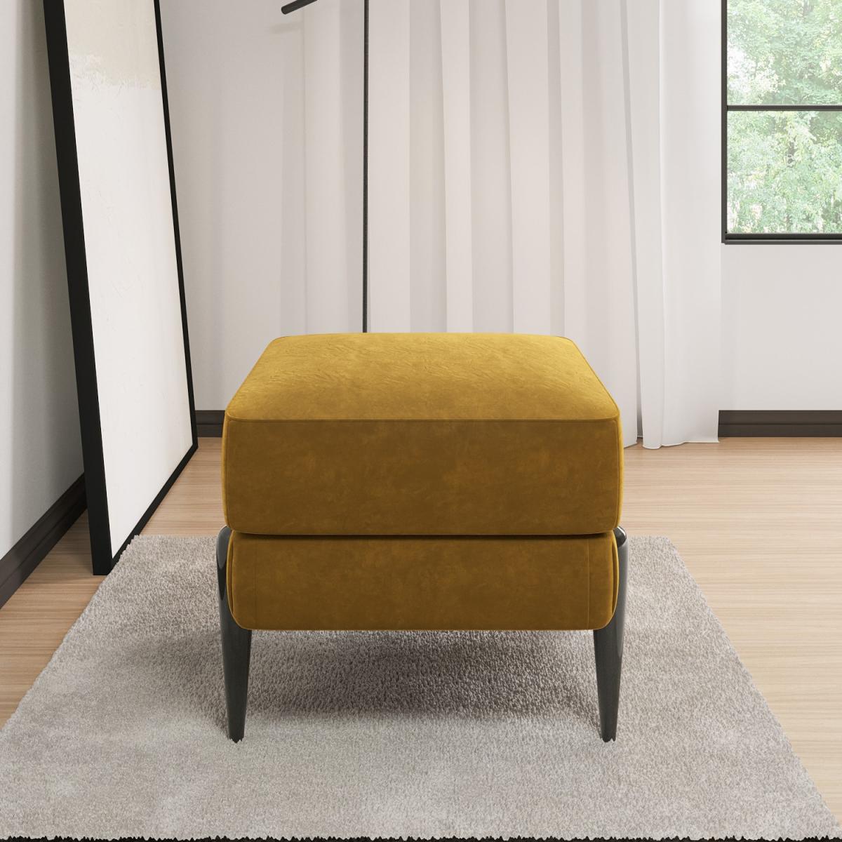 All about me. The Rosie footstool boasts mustard velvet upholstery that adds a pop of colour to any interior style. Its versatile too; put your feet up use as an extra seat for guests or display a drinks tray on top. Pair with the matching Rosie furniture for the perfect look. Need to know. Dimensions. W62 x D56 x H48 cm Packaging dimensions. W64 x D58 x H32 cm Weight. 9 kg Maximum supported weight. 110 kg Colour. Mustard black legs Finish. Upholstered Material. Velvet fabric metal legs Filling. Foam Frame. Strong plywood and eucalyptus wood Assembly required. Yes - just attach the legs.