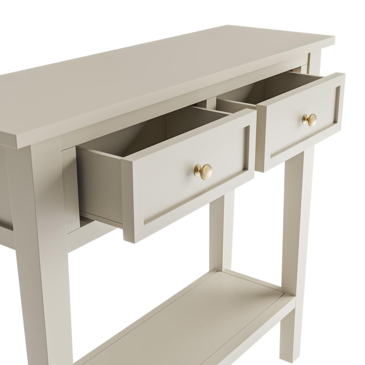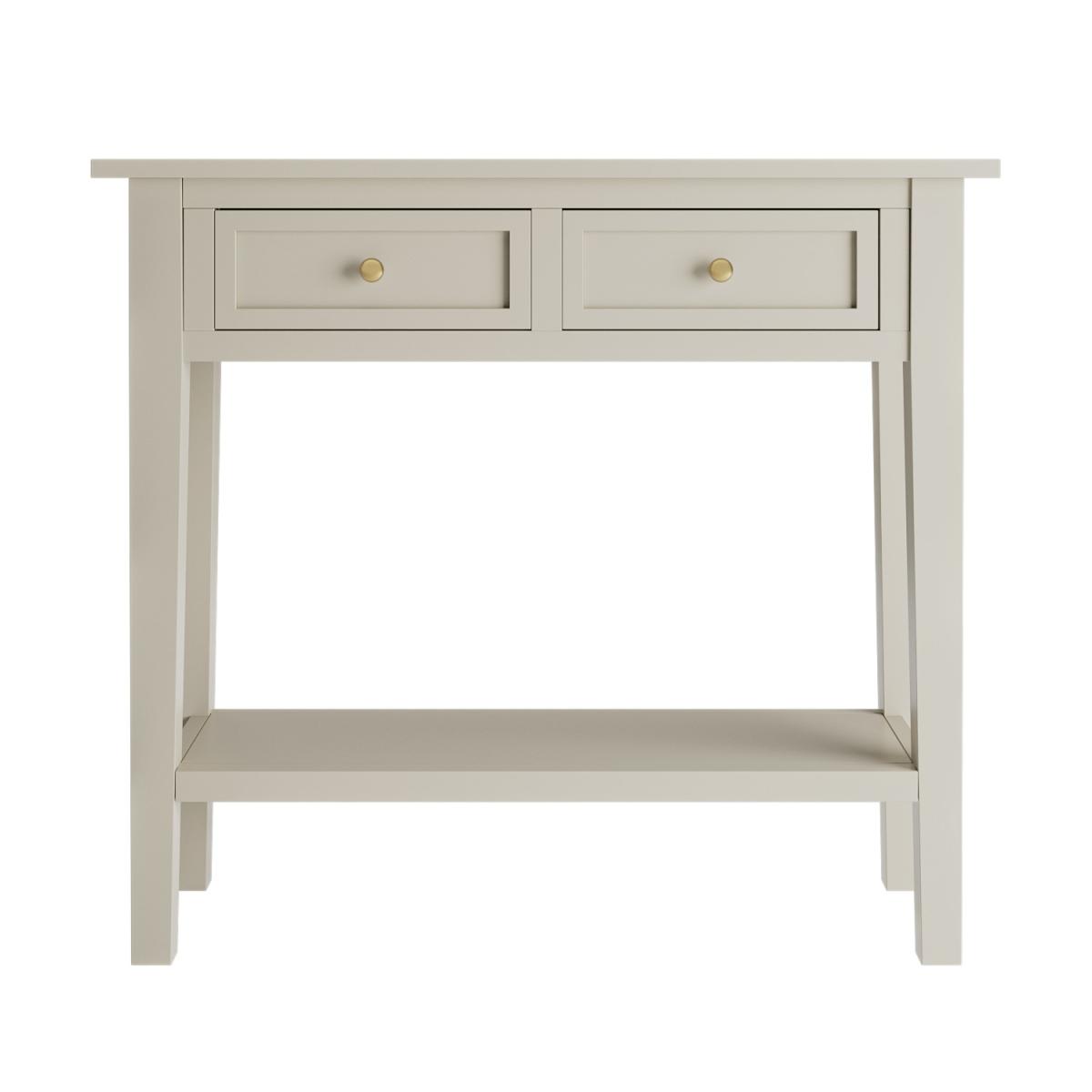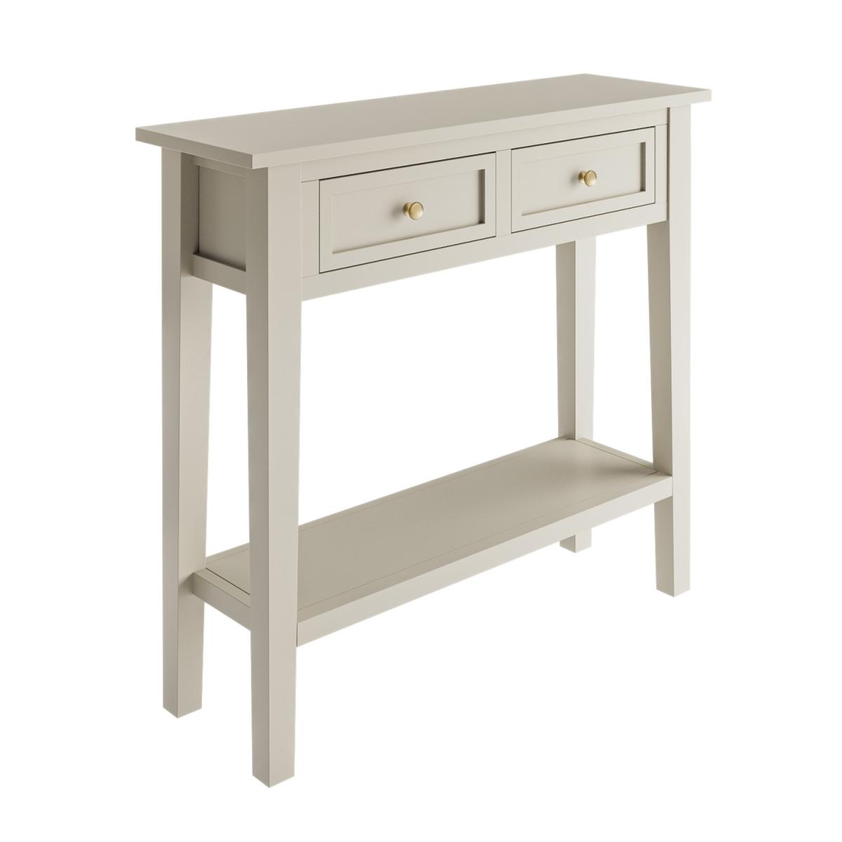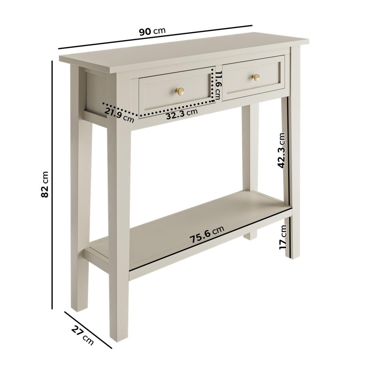 All about me Maximise your space, and discover the perfect finishing touch for any hallway. This narrow console table has been beautifully finished in a sleek beige hue with two elegant handles, to complement most room themes and colour palettes. Pick and choose how or where you store your items across three levels of convenient storage; on the top, concealed behind drawers or on the lower shelf. In your product's packaging, we provide 2 colour options for your 3 delicate handles. During assembly, you can choose between silver or gold, the perfect way to cater to any decor. Need to know Dimensions: H82 x W90 x D27 cm Drawer Dimensions:H11.6 x W32.2 x D21.9 cm Package dimensions: H43.5 x W97 x D34 cm Product weight: 13kg Maximum load weight: 140kg Material: Acacia and MDF wood combination Finish: Beige Drawers: 2 Assembly required: Yes