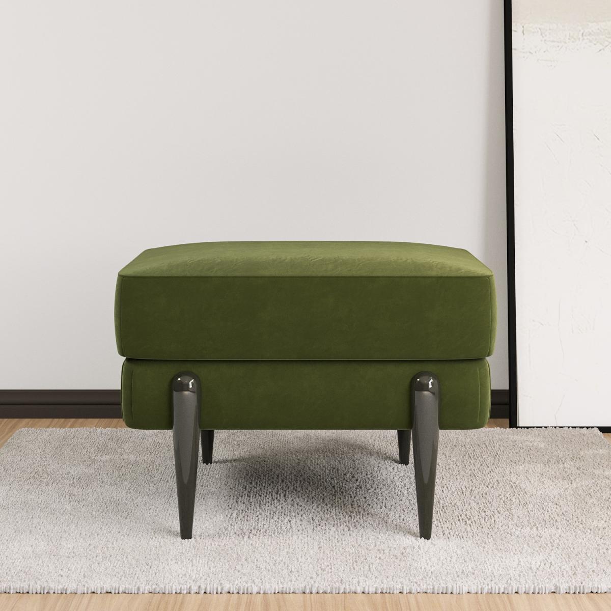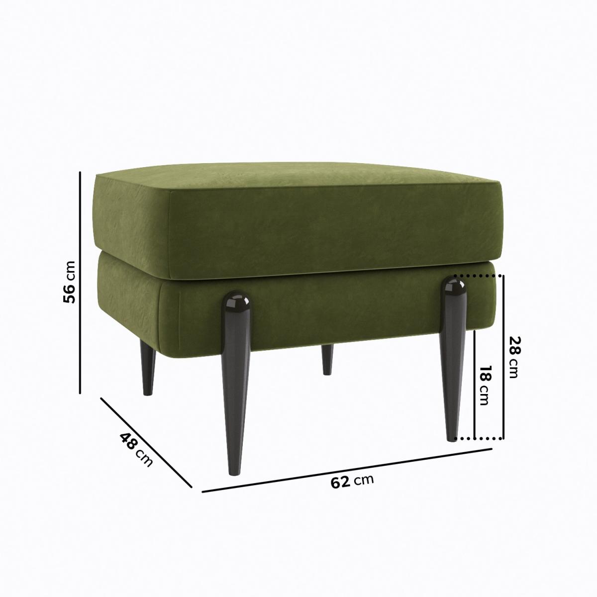 All about me. The Rosie footstool boasts olive green velvet upholstery that adds a pop of colour to any interior style. Its versatile too; put your feet up use as an extra seat for guests or display a drinks tray on top. Pair with the matching Rosie furniture for the perfect look. Need to know. Dimensions. W62 x D56 x H48 cm Packaging dimensions. W64 x D58 x H32 cm Weight. 9 kg Maximum supported weight. 110 kg Colour. Olive green black legs Finish. Upholstered Material. Velvet fabric metal legs Filling. Foam Frame. Strong plywood and eucalyptus wood Assembly required. Yes - just attach the legs.