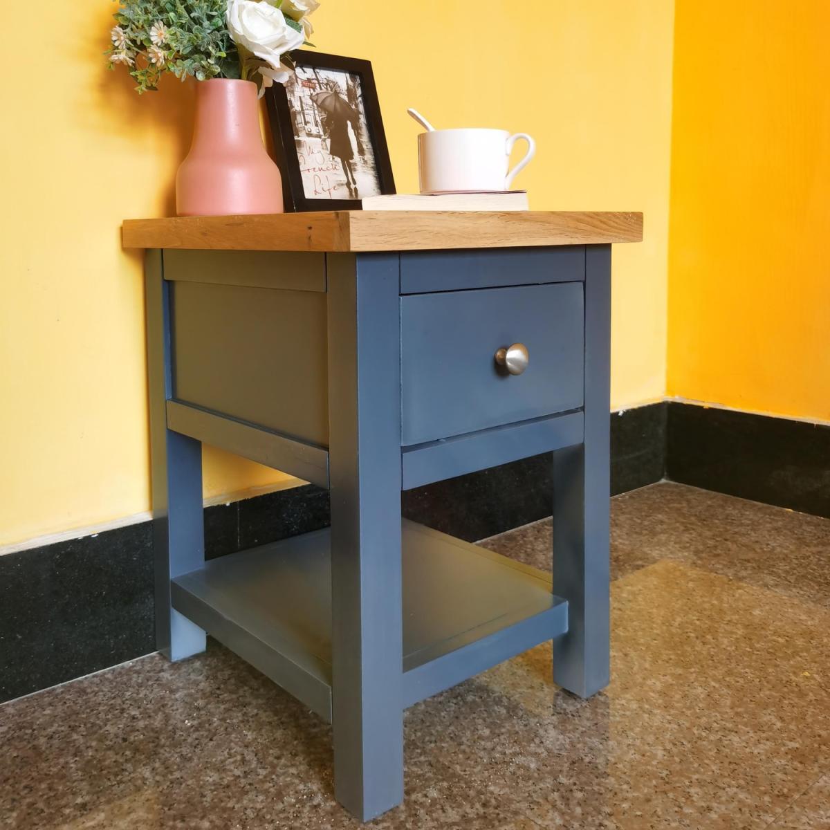 Small Painted Oak Compact Side Table with Drawer and Shelf - Blue