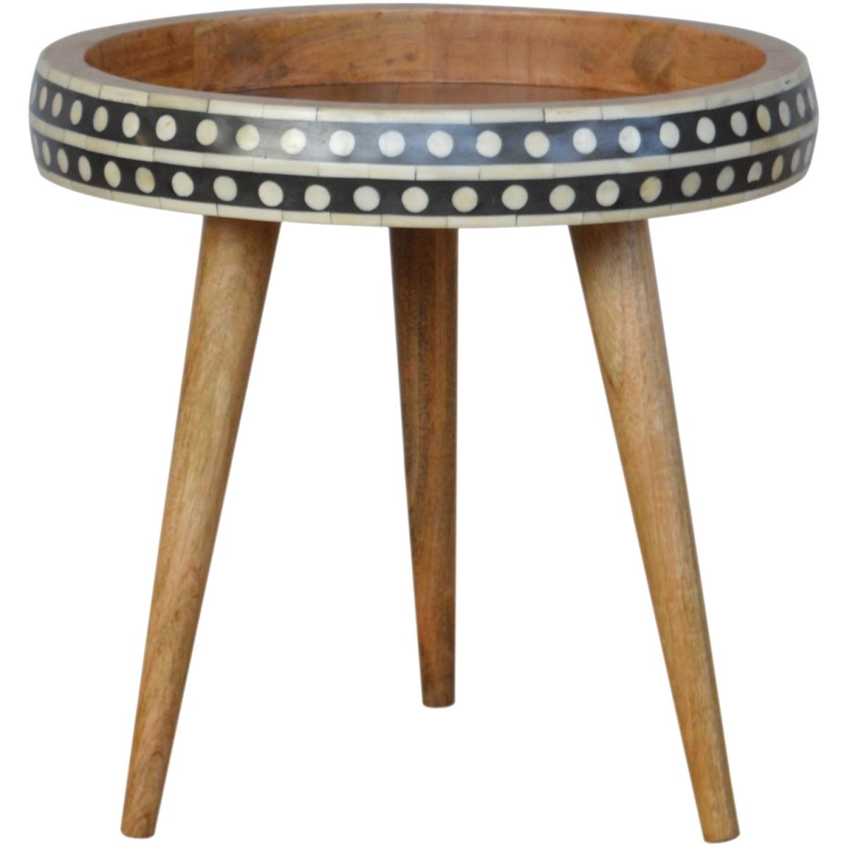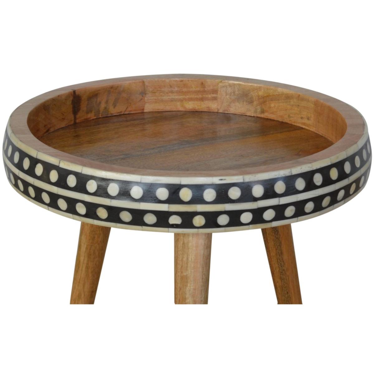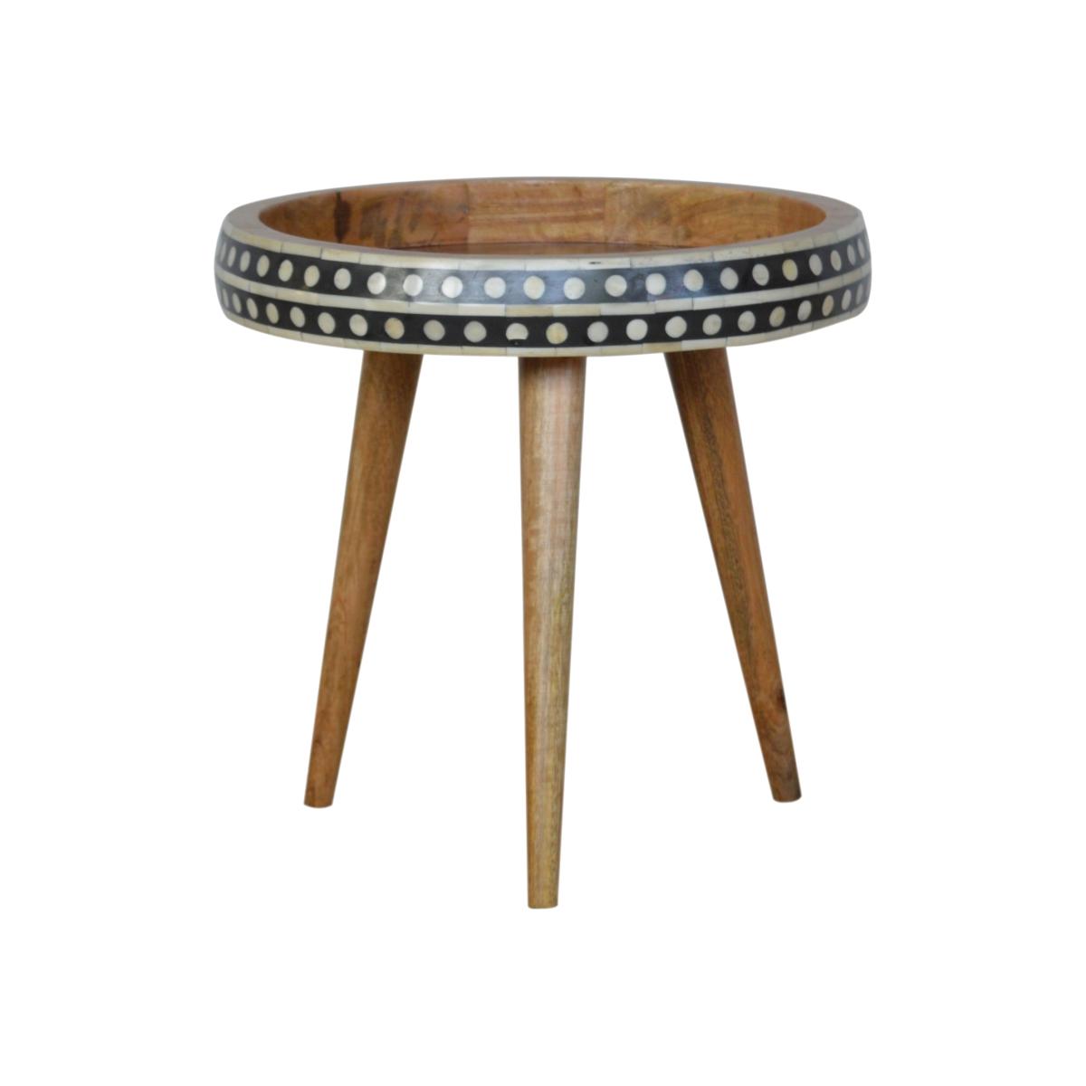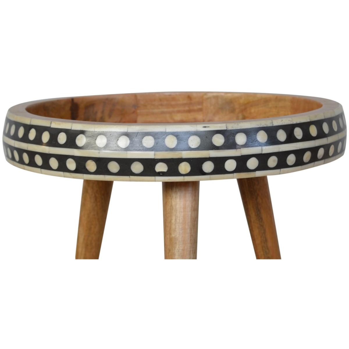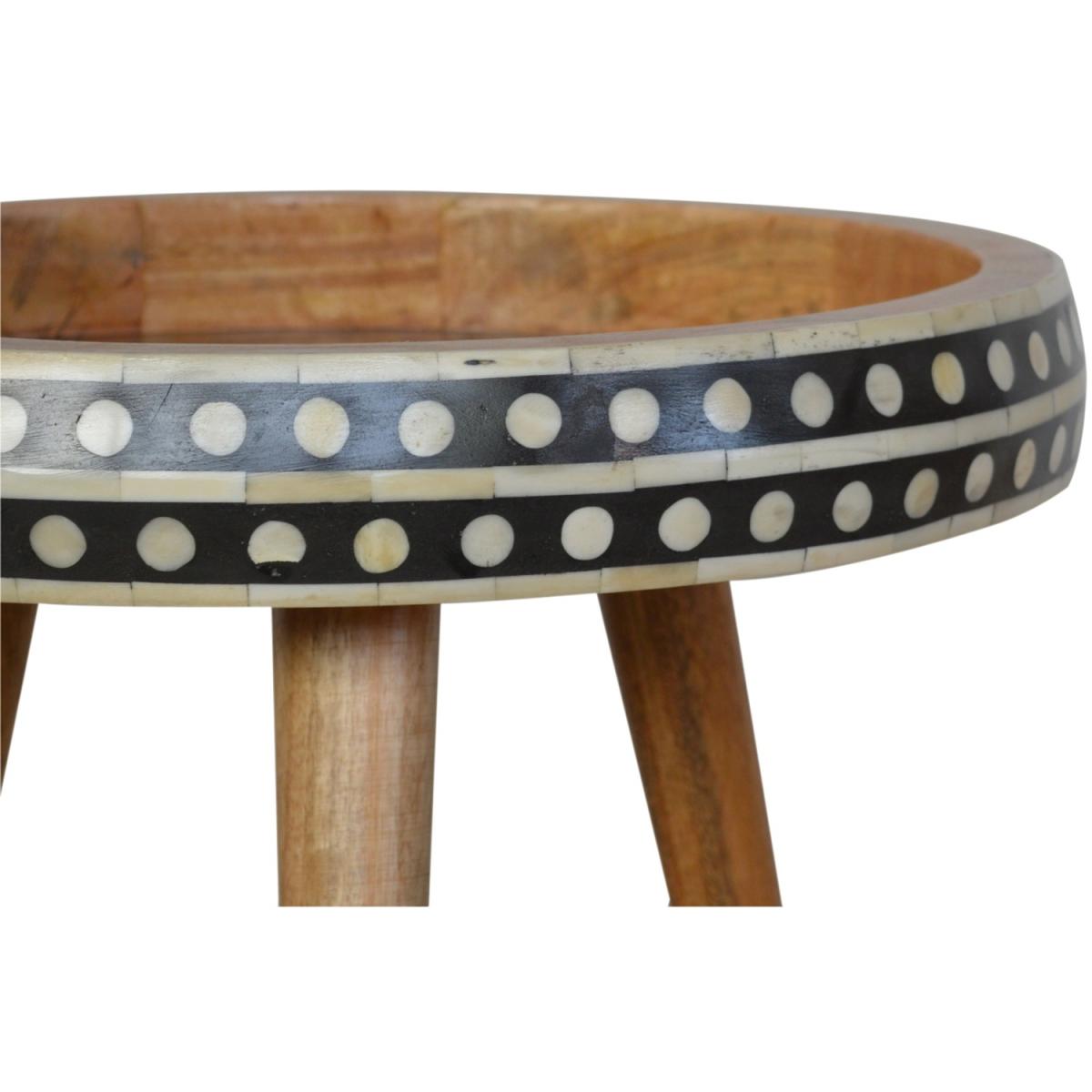 This solid wood table has made from 100 mango wood in a fine oak-ish finish. The no-fuss finish reveals the beautiful grain of the fruit wood mango wood which this piece of furniture is made of. This tripod table stands on Scandinavian-style legs and features a black and white pattern on the edges.