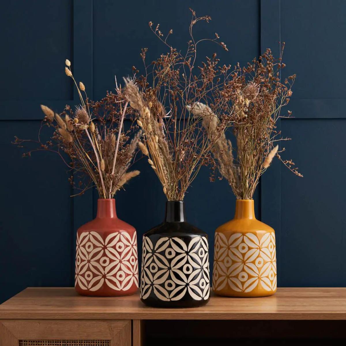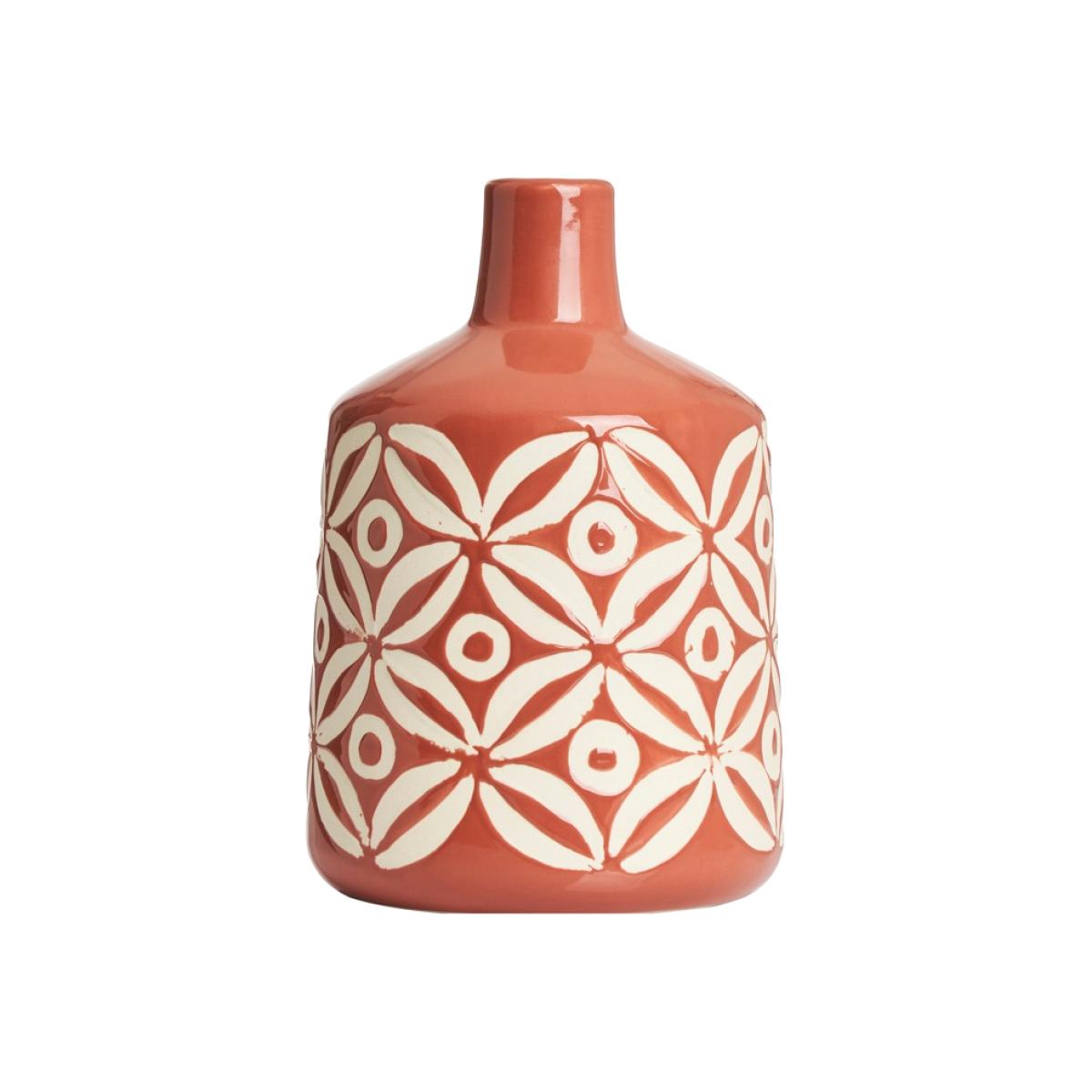 Enhance your interior with our Small Petal Pattern Ceramic Vase in Terracotta, a charming piece that adds warmth and character to any space. The symmetrical petal pattern beautifully complements the earthy terracotta hue, creating a captivating visual appeal. Its smaller size makes it versatile for displaying small bouquets or as an accent piece on its own on a sideboard or table.