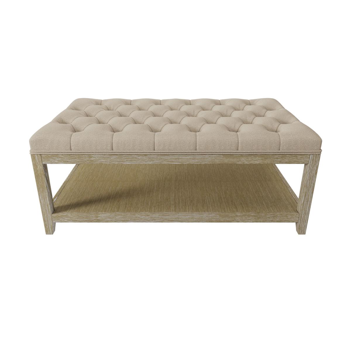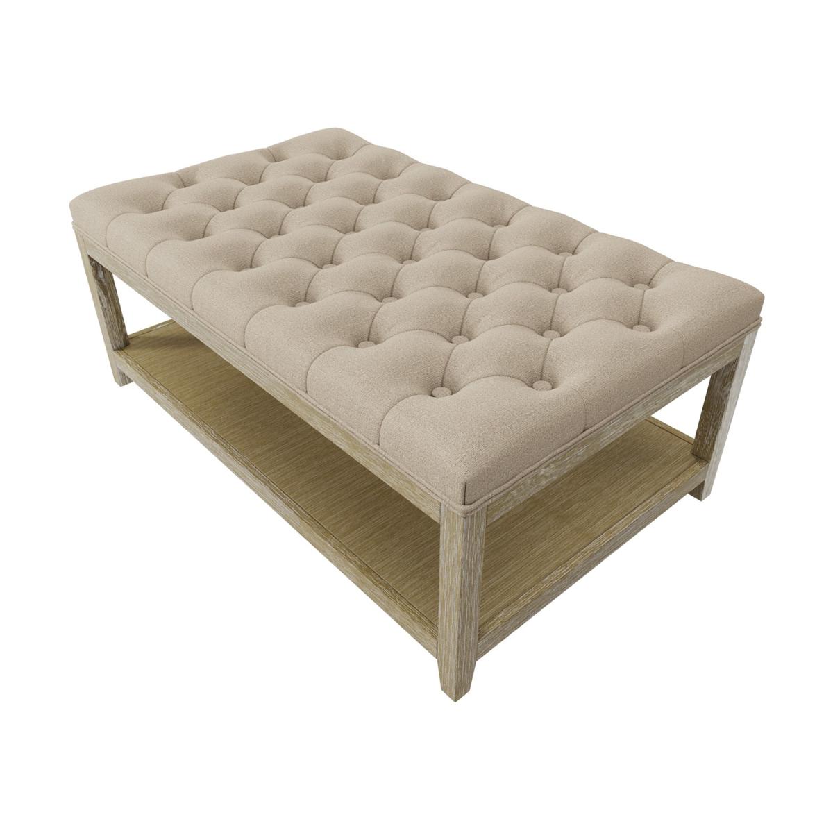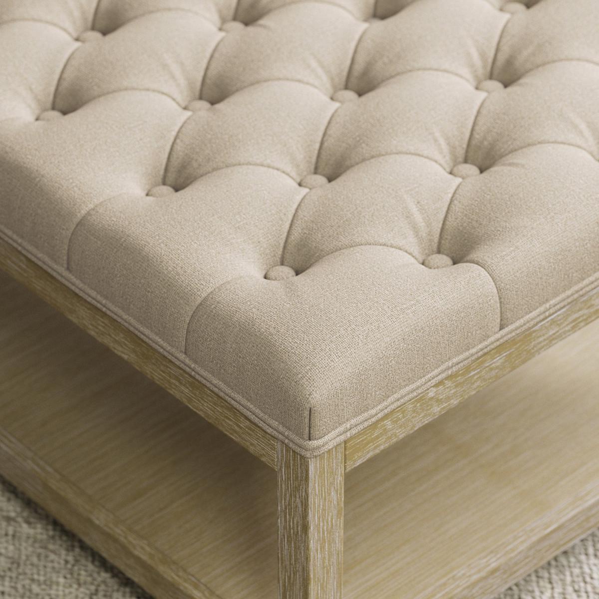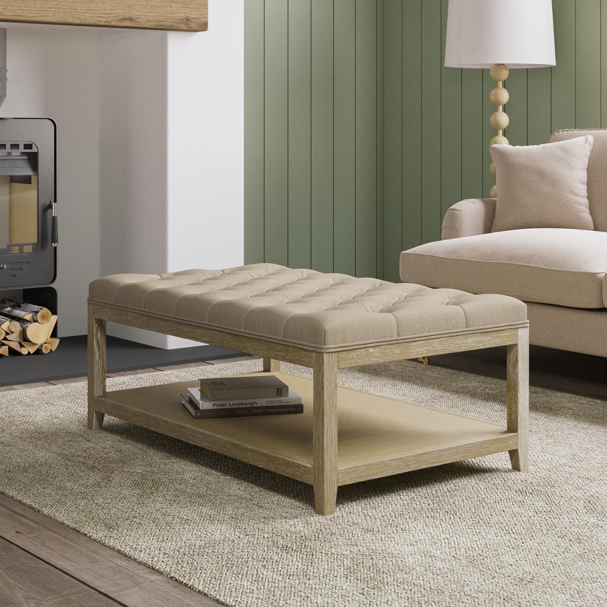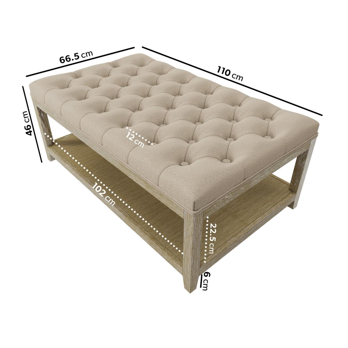 All about me. Add an elegant touch to your home with this luxurious coffee table. The open shelf is perfect for storing living room clutter for a minimal look to your space. Plus thanks to the plump upholstered button-tufted top not only is it used as a table with a tray placed on top it makes an ideal footrest to rest your legs. Made of strong plywood and rubberwood its solid build means you can use it to sit on too. Need to know. Dimensions. W110 x D66.5 x H46 cm Open shelf dimensions. W102 x D66.5 x H22.5 cm Button-tufted width apart. 12cm Product weight. 17.3kg Max supported weight. 120kg Colour. Beige and neutral brown Finish. Wire brushed timber whitewash and upholstered Material. Plywood solid rubberwood (legs) foam (filling) woven fabric (upholstery) For use. Indoors Assembly required. Yes.