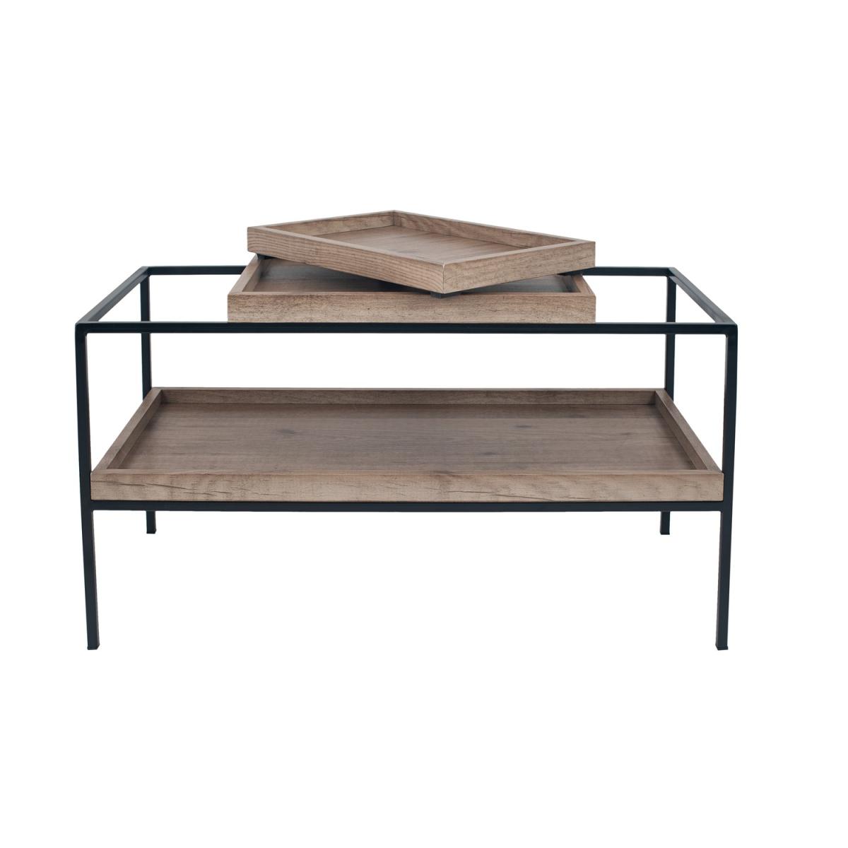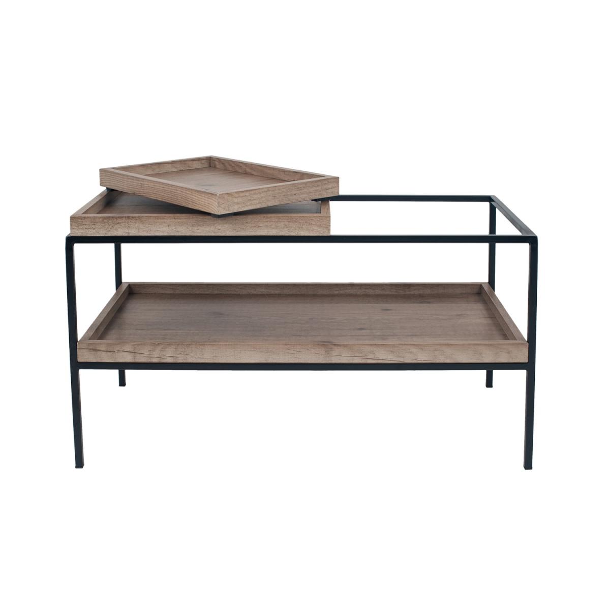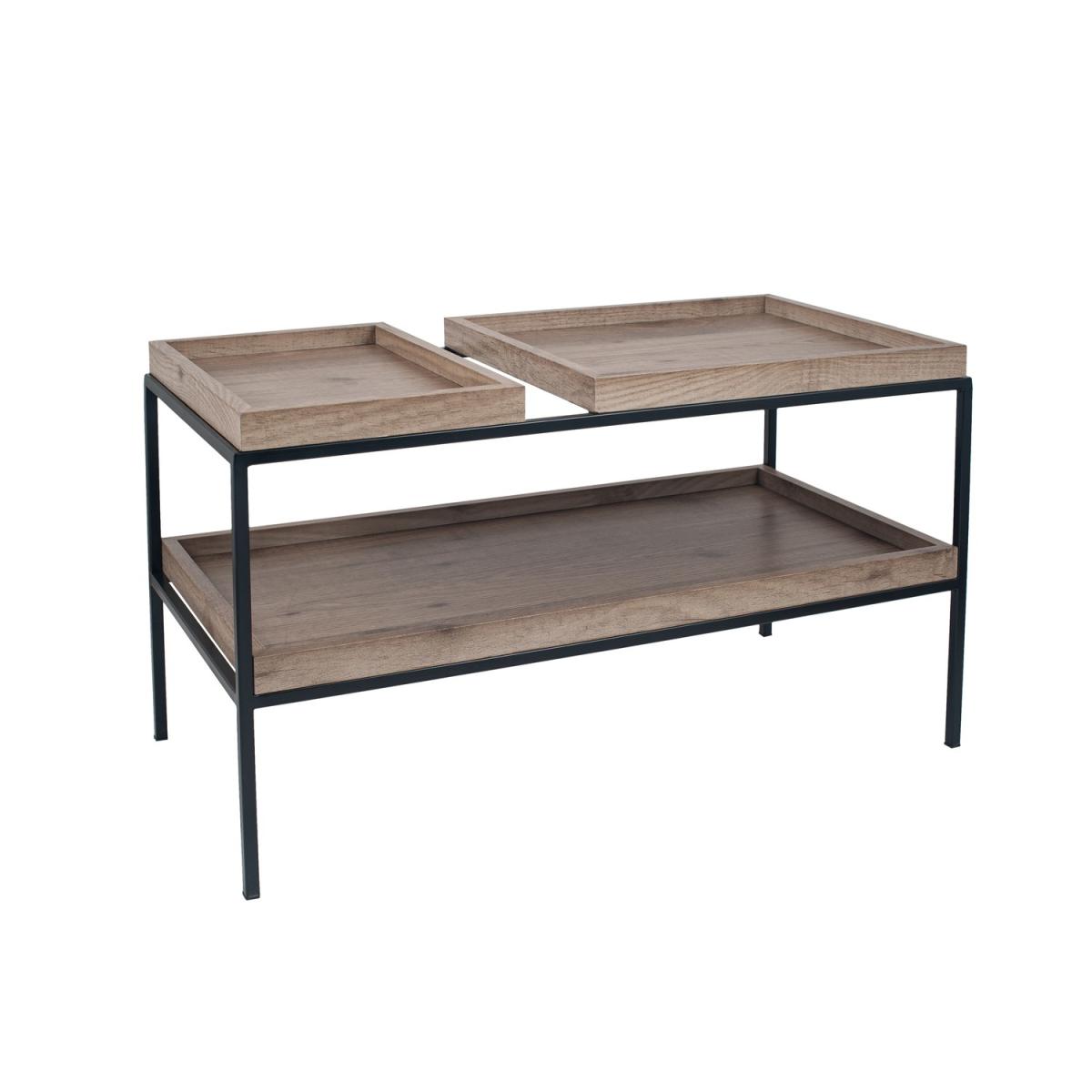 Dimensions:H45 x W80 x D40 cm This 2-shelf coffee table is both functional and stylish with its black metal frame and natural wood effect surfaces. The lower shelf is fixed while the 2 tray shelves are removable, making for a versatile coffee table that will suit all your storage needs. Features: Wood effect surfaces Sturdy black metal frame Fixed lower shelf with 2 removable tray shelves The perfect place to place your coffee cup while you relax in your living room Matching items available in the range No assembly required