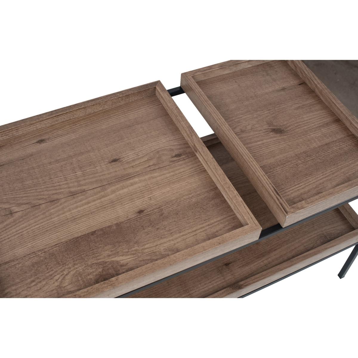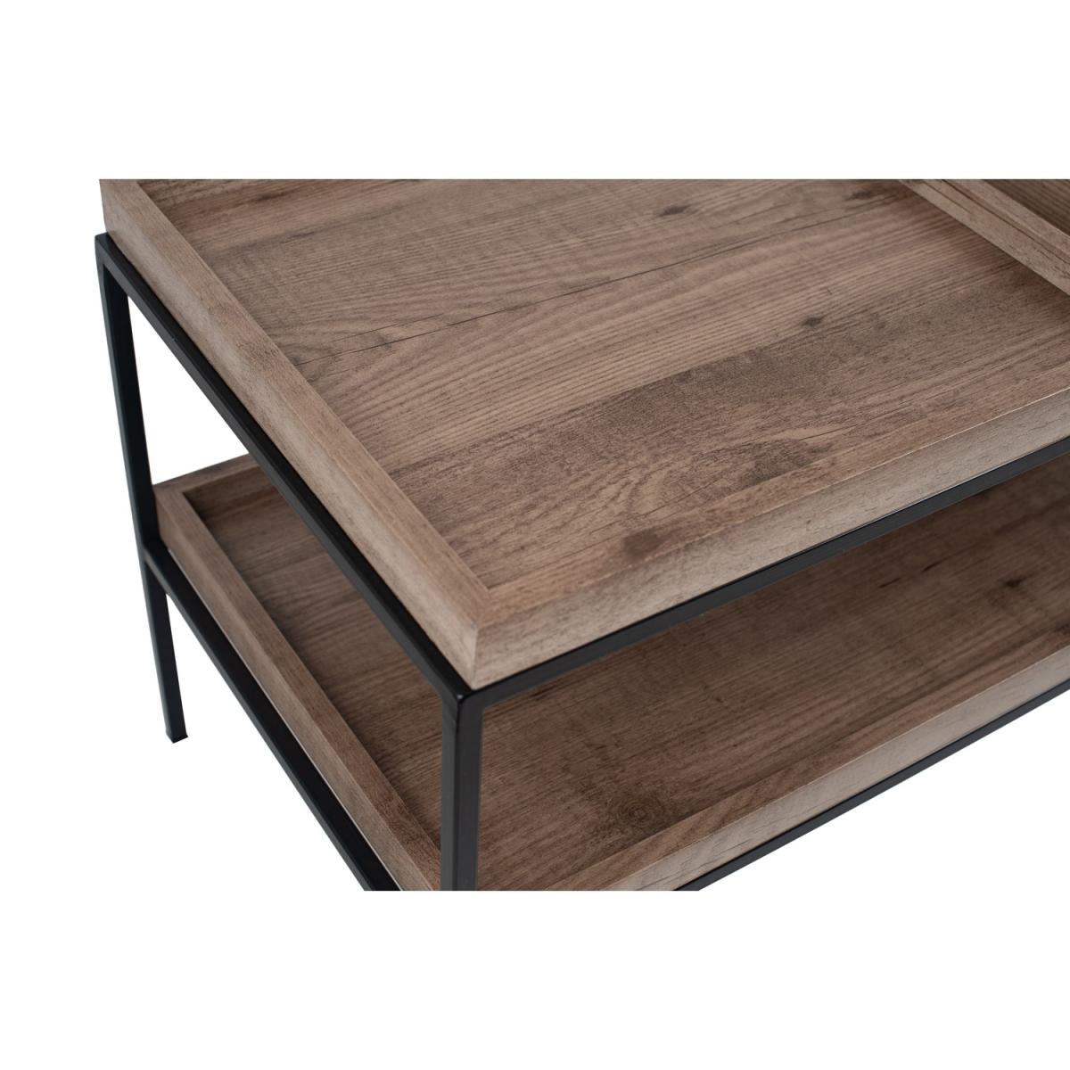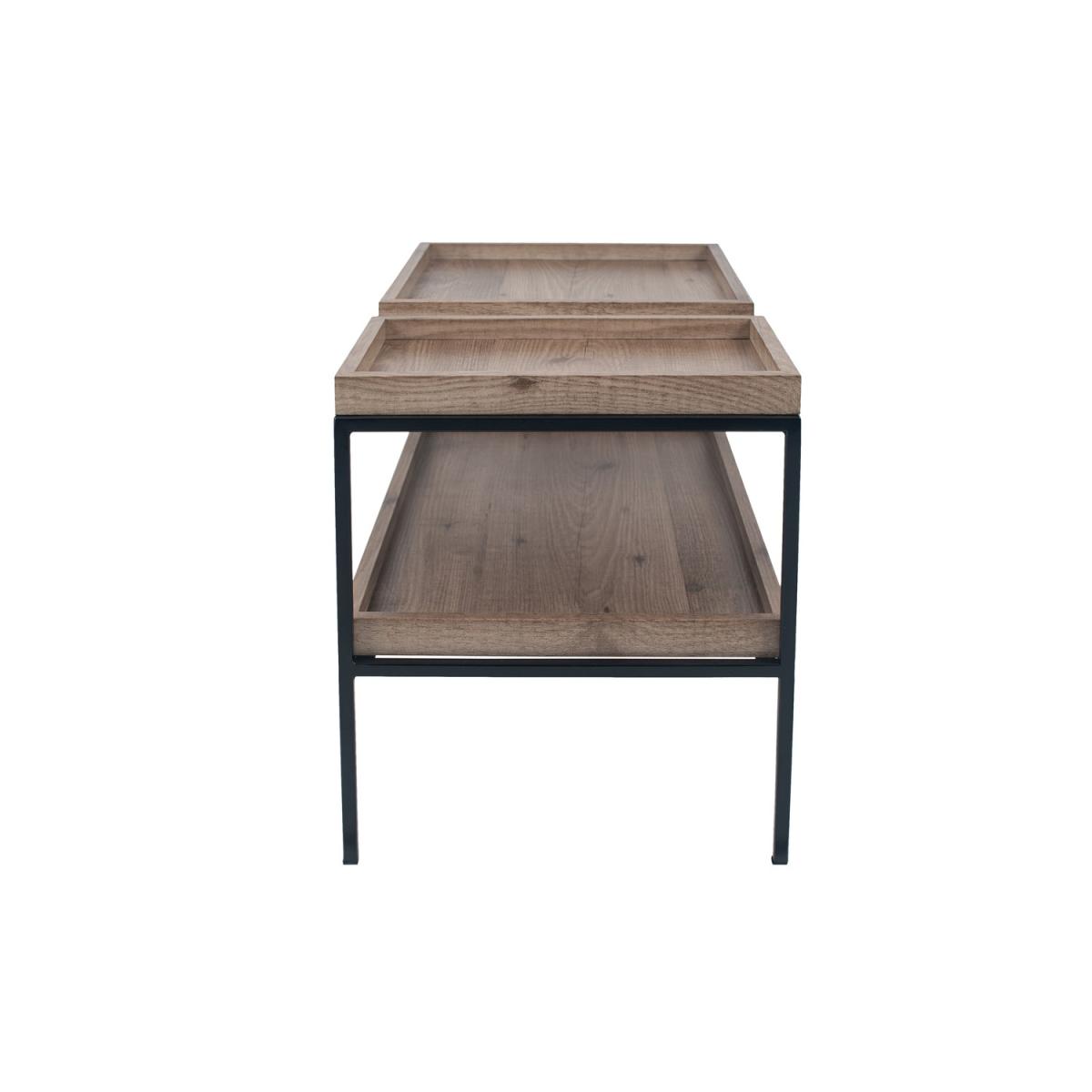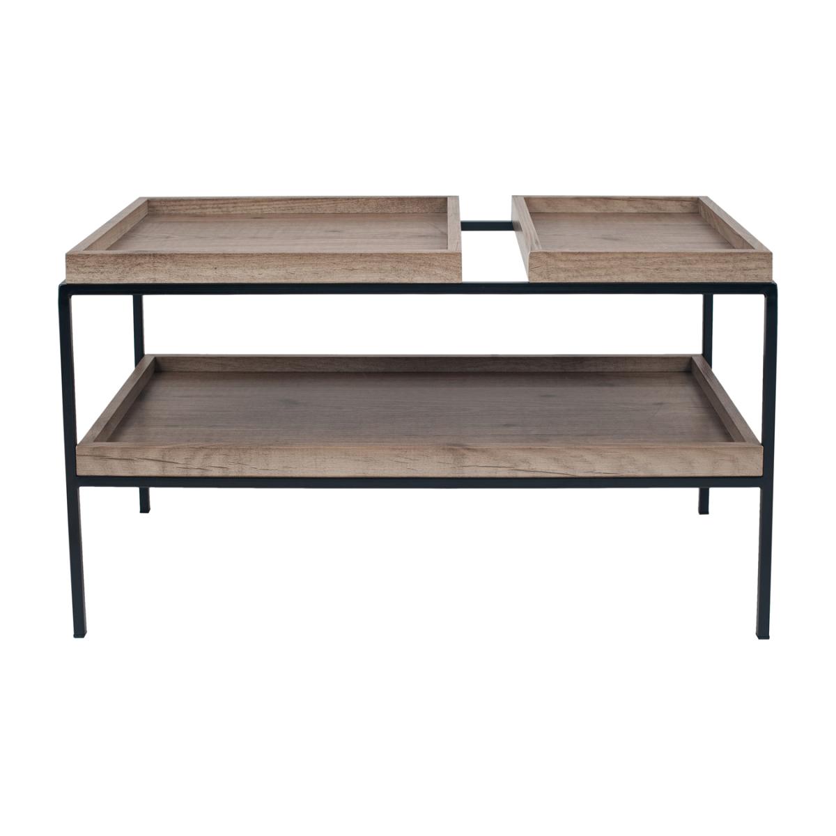 Dimensions:H45 x W80 x D40 cm This 2-shelf coffee table is both functional and stylish with its black metal frame and natural wood effect surfaces. The lower shelf is fixed while the 2 tray shelves are removable, making for a versatile coffee table that will suit all your storage needs. Features: Wood effect surfaces Sturdy black metal frame Fixed lower shelf with 2 removable tray shelves The perfect place to place your coffee cup while you relax in your living room Matching items available in the range No assembly required