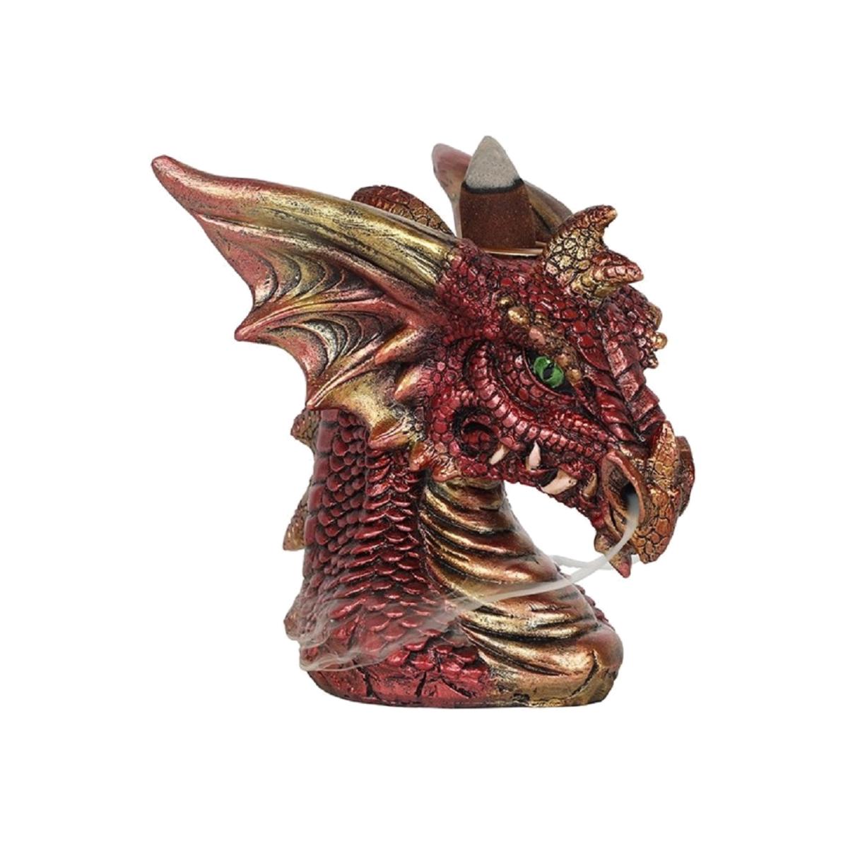This small red and gold dragon head creates an intricate and beautifully captivating backflow incense burner. Place a backflow incense cone on the dragon's head and watch the swirls of smoke cascade through its nose.