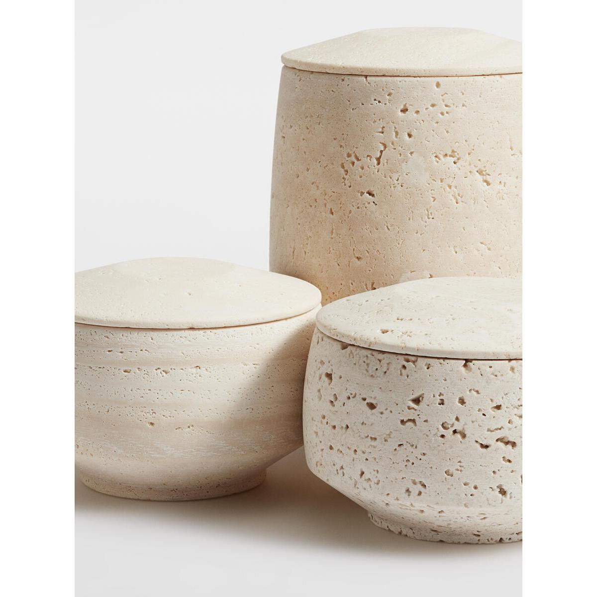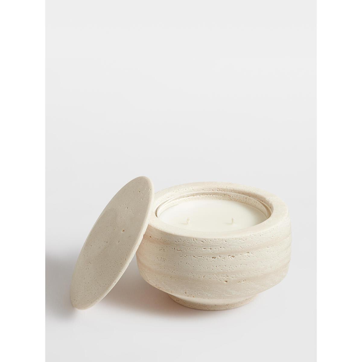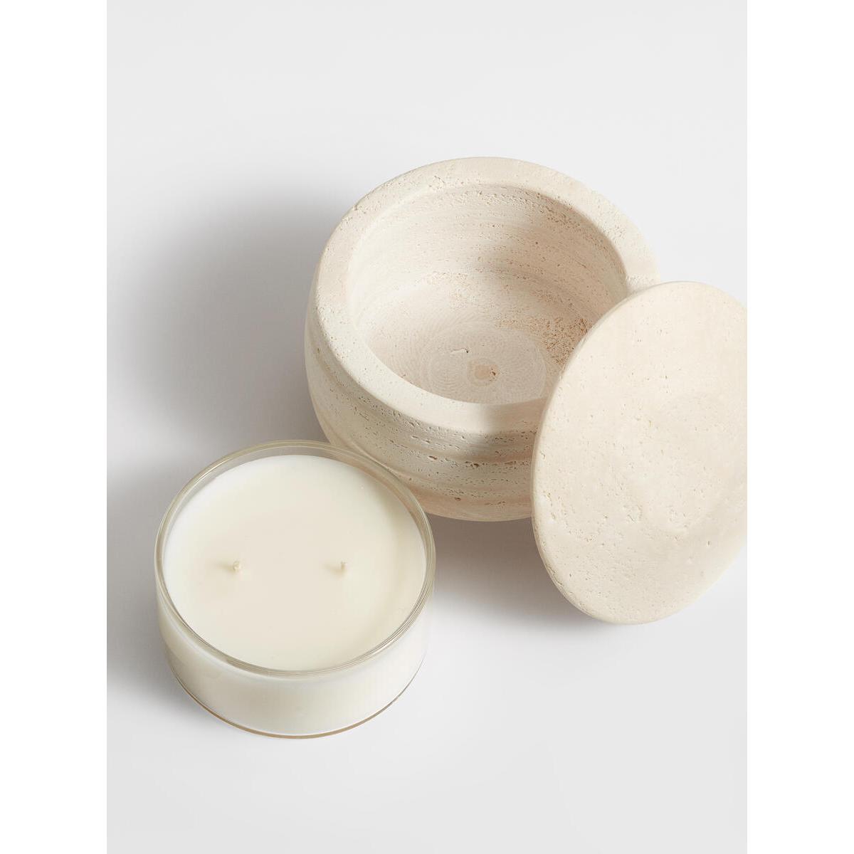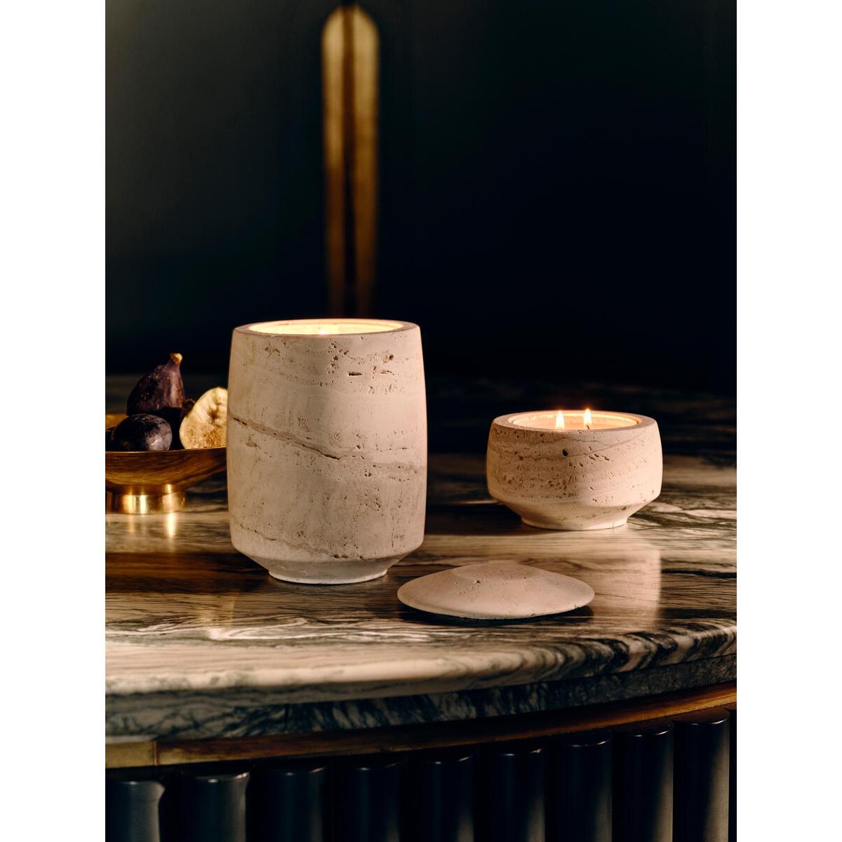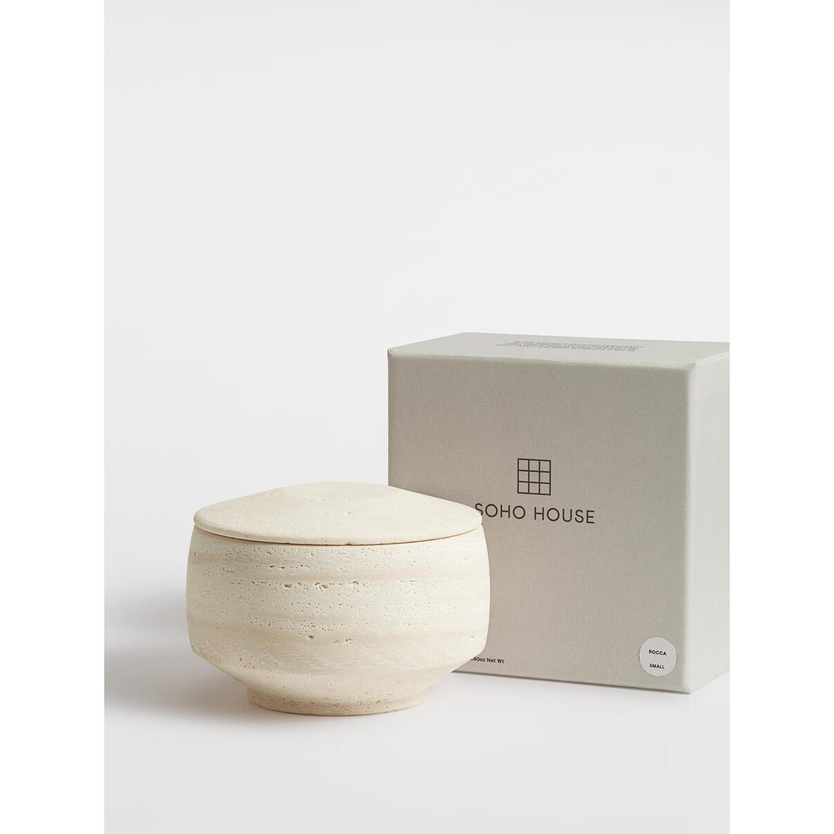 Crafted from travertine, a natural material, our Rocca candle is filled with our Fig Verde fragrance, infused with Green Figs, Dried Fruit and Rose Petals to recall evening strolls around the courtyard garden at Soho House Istanbul. Due to the nature of the stone, every piece will vary, making each one unique. The removeable glass liner makes it easy to reuse this vessel and bring the coastal surroundings of Soho Roc House into your home. Scent notes Top: Cassis Middle: Fig Base: Amber Small travertine candle Infused with our Fig Verde fragrance Travertine vessel with lid and glass liner Reuse as a trinket box Each vessel is unique and will vary due to the natural materials Bespoke fragrance created by an expert perfumer for Soho House Inspired by Soho Roc House