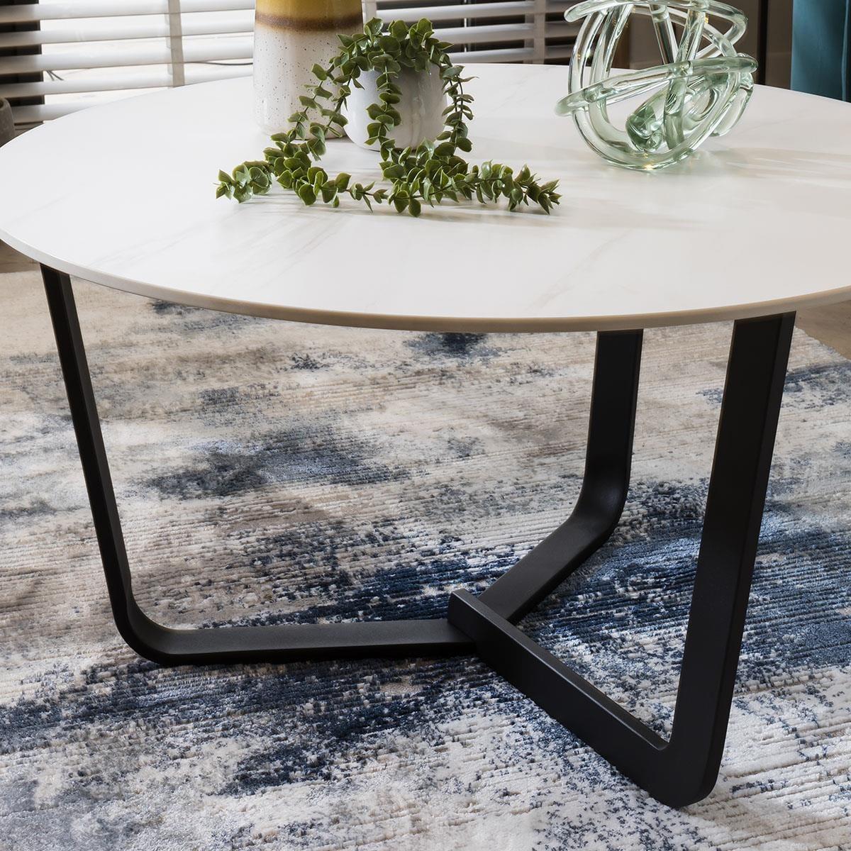 This Modern Round Coffee Table will fit effortlessly in modern and contemporary living rooms. It has been made with a luxury combination of premium white marble effect ceramic and a sleek black powder-coated metal base to create a stunning contrast. The coffee table’s minimalist design and crisp lines add a distinct contemporary, industrial-infused touch. The ceramic marble-effect table top is great for busy family homes. Ceramic is a worry-free material because it is sealed during the manufacturing process, it can withstand heat and sharp cuts, whereas marble table tops take a bit more care and maintenance. Discover the epitome of elegance with our premium coffee tables. Crafted with modern design, ceramic tops, and sturdy metal bases, they exude sophistication and durability, redefining your living space. Elevate your interior with these exquisite pieces, where style meets functionality effortlessly. W90cm D90cm H50cm Round White Marble Effect Coffee Table Premium White Ceramic Top