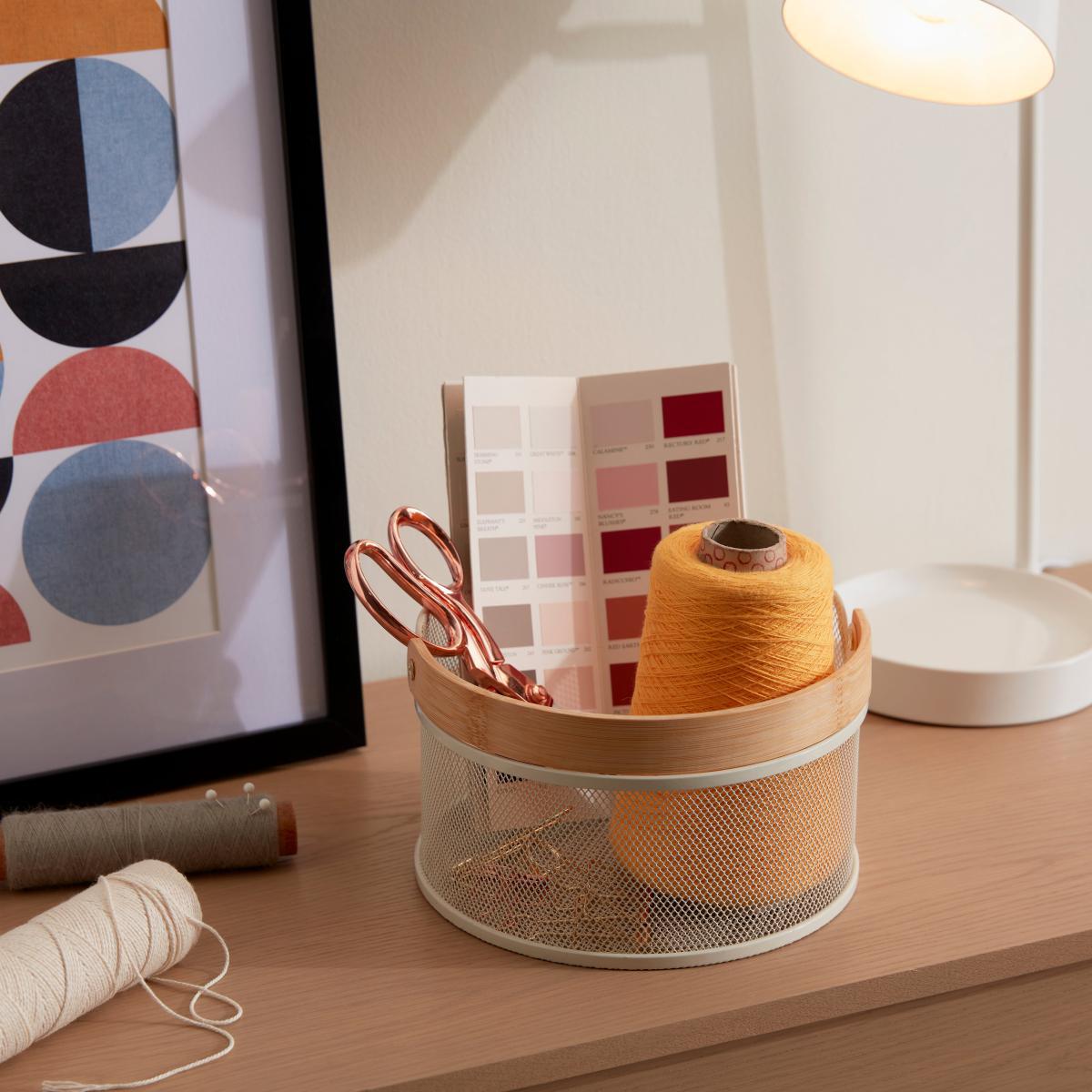 I love this small wire basket for its versatility and clean, minimalist look. It works particularly well in modern or Scandinavian interiors, adding a touch of functionality without clutter. It's perfect for organising small items like craft supplies, toiletries, or office essentials while keeping everything visible and accessible. Stylistically, it can be placed on a desk or open shelf for a neat, organised vibe. Practical tips include pairing it with colourful or textured items inside to add contrast or using it to contain loose essentials in a bathroom or bedroom for a tidy, streamlined appearance. Its simple white finish ensures it blends seamlessly with various colour schemes, making it a practical addition that’s both stylish and functional.