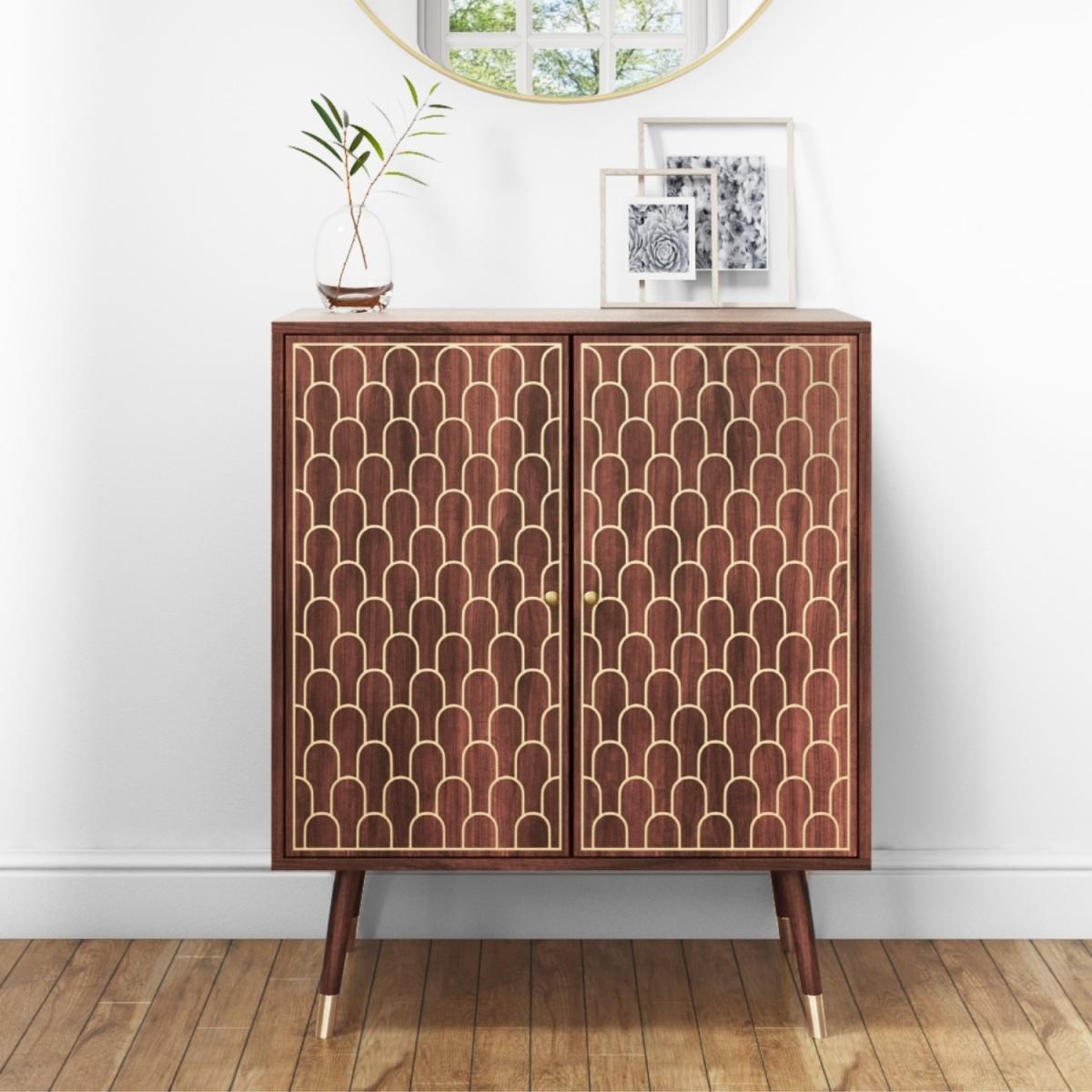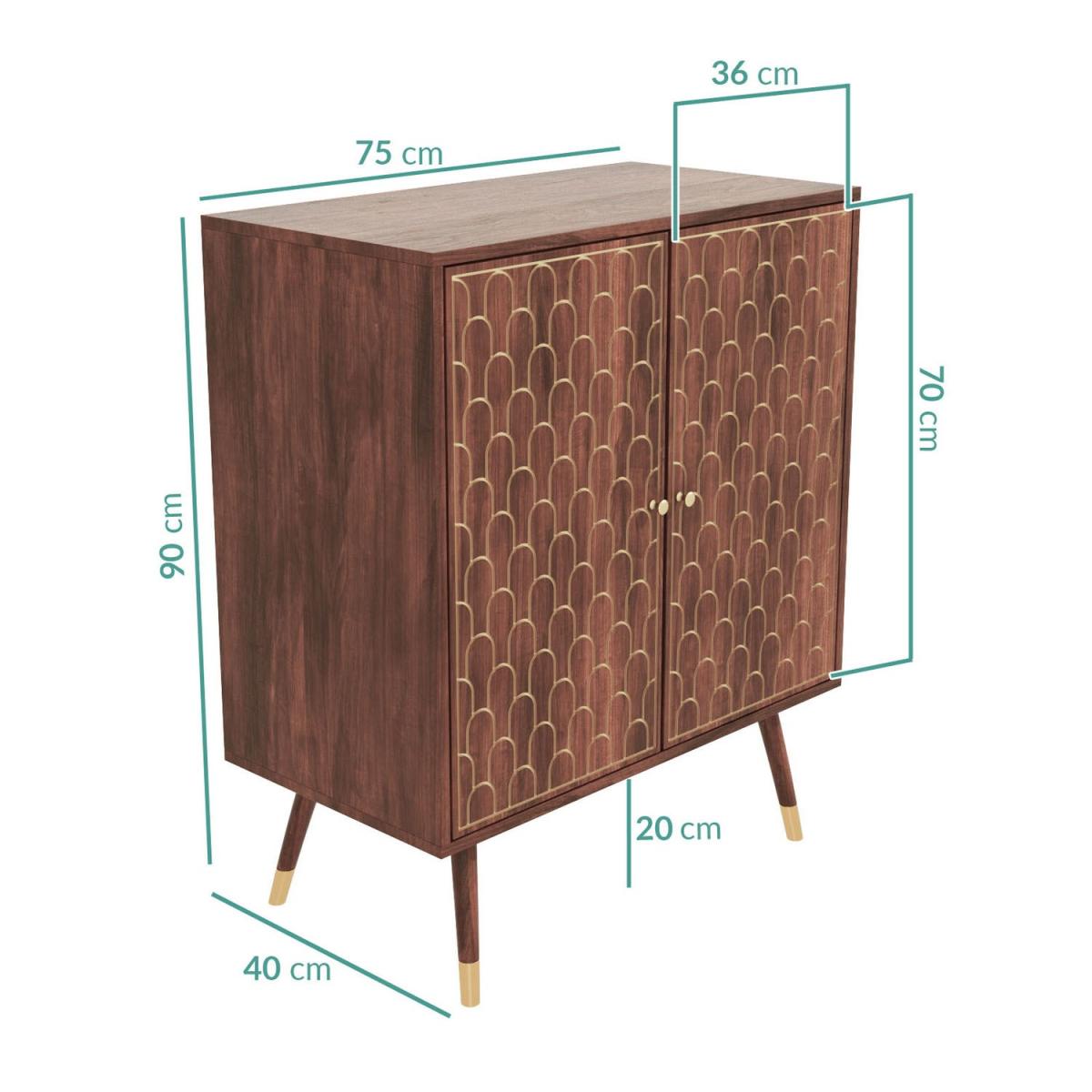 Features we love Solid mango wood sideboard with gold inlay design2 generous cupboards offer ample storage space. A stylish storage solution perfect for any room. Gold tipped legs give this piece a retro feel. Minimal assembly required simply attach the legs. All about me. With two large cupboards for storage this art deco inspired unit is not only stylish but practical too. Inlaid gold arches give the piece a premium feel and the gold handles complete the look. This sideboard is constructed from durable mango wood which is a more environmentally friendly wood. There is minimal assembly required simply just attach the legs and it’s ready to go. Discover the matching console table drinks cabinet and larger sideboard online too. Need to know. Dimensions. H90 x W75 x D40 cm Packaged dimensions. H76 x W84 x D49 cm Product weight. 22.7kg Finish. Dark chestnut finish on solid mango wood Material. Solid mango wood and; wood combination Assembly required. Yes simply attach the legs