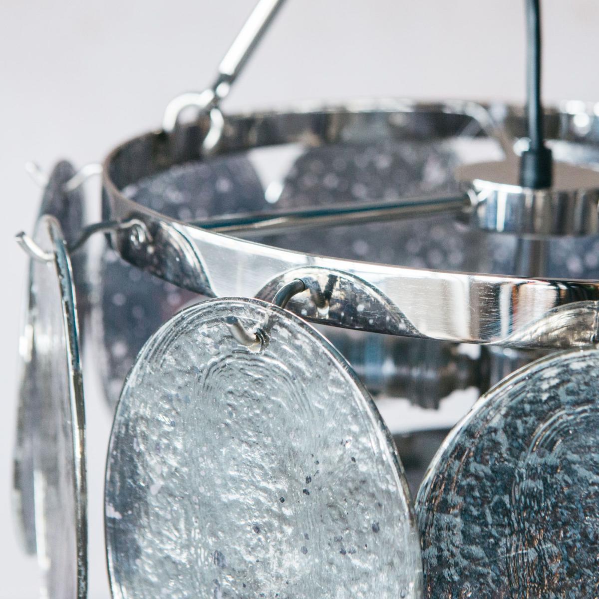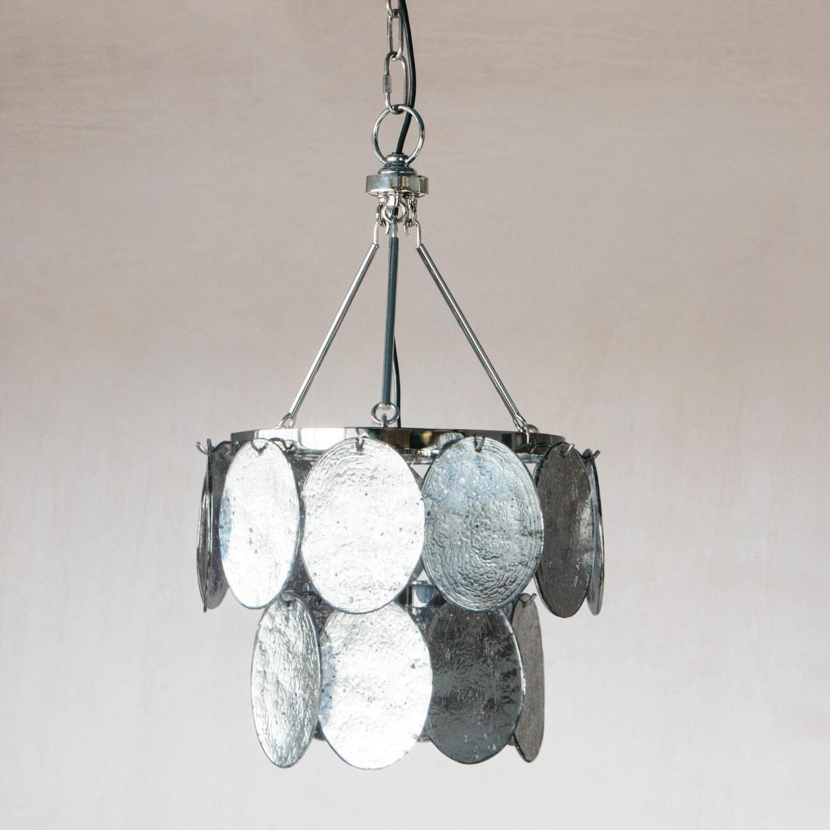 An eye-catching chandelier with a unique design featuring two tiers of mottled discs. Crafted from stainless steel, brass and glass this art deco-inspired chandelier will make a striking addition to your hallway, sitting room or dining room.