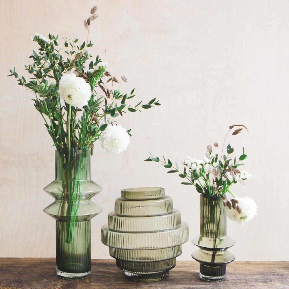The smaller partner to our large ribbed green vase, this unique angular design features a grooved surface and two large horizontal ridges. Reminiscent of 1960s coloured glass, this vase evokes a nostalgic aesthetic. Fill with blooms and use as an eclectic table centrepiece.