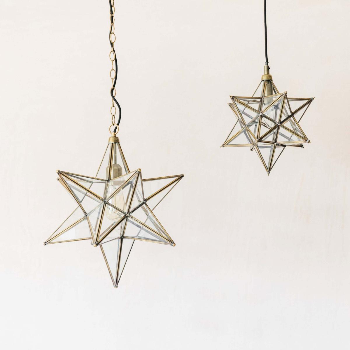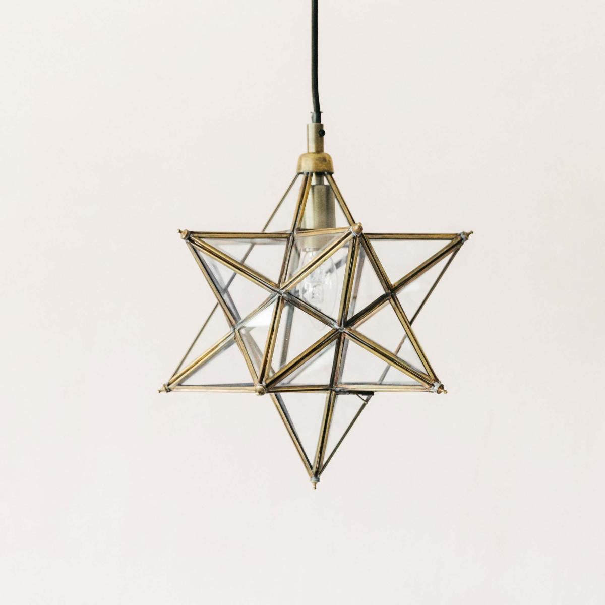 Add our celestial-inspired pendants to any room for a dramatic focal point. With a multi-faceted glass and iron frame in antiqued brass, and an adjustable cord.