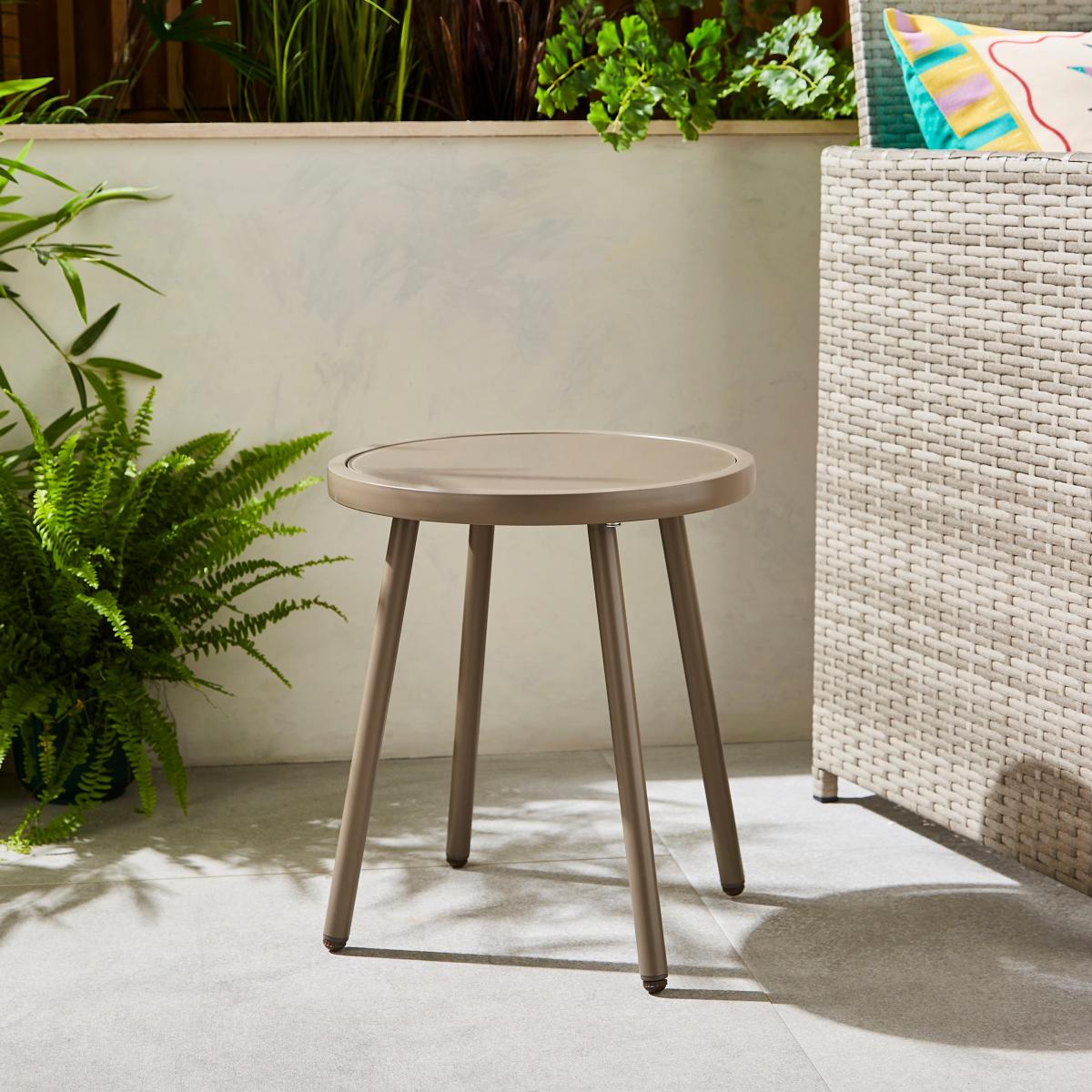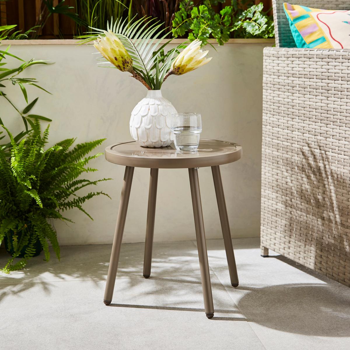 I’m a big fan of this little taupe bistro table for its understated versatility and easy-clean glass top. The muted taupe frame blends neatly into Scandinavian, coastal or contemporary schemes, while the glass surface keeps the look light and uncluttered. Styling-wise, it’s perfect as a café-style accent on a small balcony or tucked beside a sofa as a compact side table. Try pairing it with slender metal or wicker chairs, a simple ceramic vase and a folded patterned throw. Its neutral tone also makes it a handy plant stand to showcase a few pot favourites.
