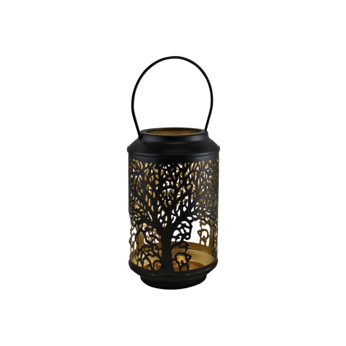 A beautiful candle lantern in black with a golden interior featuring our tree of life design cutout around the lantern. Will hold a tealight candle. The lantern is made of 100 iron and features a handle for carrying or hanging.