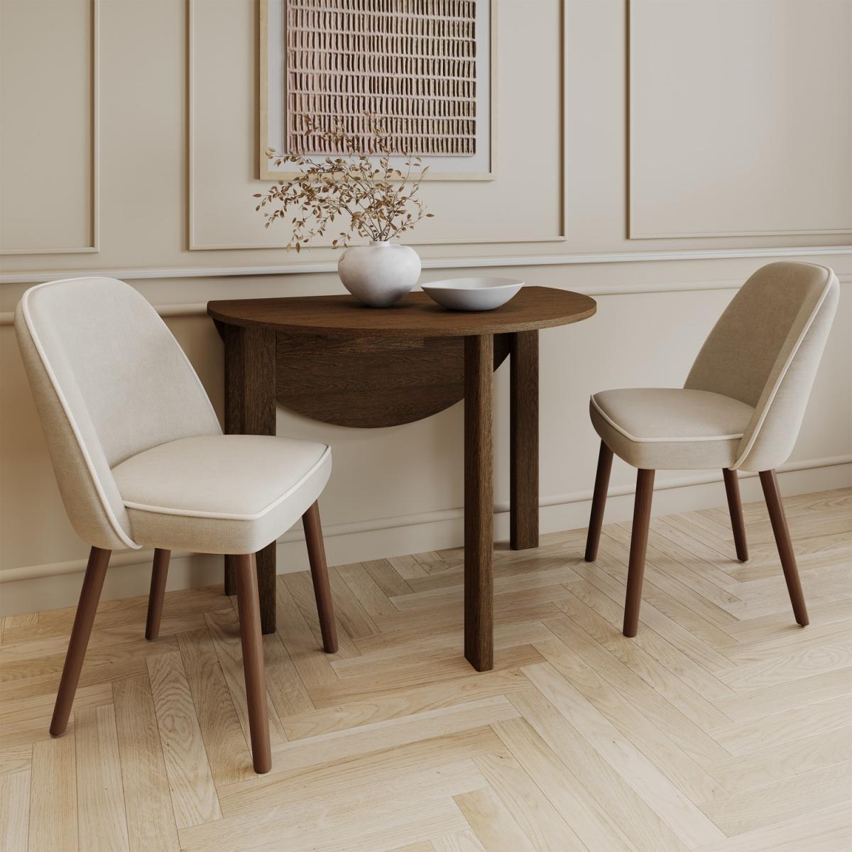 The Nell dining table is your go-to solution for small-space living. Its drop-leaf sides fold in or out in seconds, giving you flexibility whether you're dining solo or with guests. Blending mid-century influences with modern practicality, Nell’s solid oak legs and stained walnut veneer top bring retro character with a rich, warm finish that suits most interiors. Crafted with solid oak legs for a sturdy base, this table doesn't just look good, it stands up to daily use with ease. The Claudia chairs feature a soft and durable beige chenille upholstery that exudes understated luxury, the versatile neutral tone complements a wide range of dining tables and interior styles, ensuring a cohesive look. Go from compact console to full dining setup in a few easy moves. The twin drop-leaf design makes it easy to adjust based on your needs and space. Finished in a beautifully rich walnut stain, the Nell folding dining table combines elegant styling with real-world functionality. Its compact silhouette and clever foldaway design make it ideal for apartments, small kitchens, or anywhere you want style without compromise and paired with the Claudia Dining Chairs designed to blend seamlessly with modern or contemporary decor, these chairs combine timeless elegance with everyday comfort, making them the perfect addition to your dining space. Featuring mid-century modern design, solid walnut wood legs, and luxurious chenille upholstery ready to transform any dining area. These chairs bring a harmonious blend of comfort, durability, and sophistication to any home.