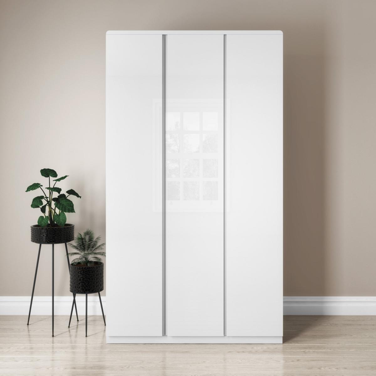 Features we love White high gloss triple 3-door wardrobe. Tall narrow proportions ensure the best use of space. Includes a hanging rail and six storage shelves. Modern and seamless design with integrated handles. From our Lyra space-saving bedroom furniture range All about me. The perfect piece for creating a contemporary abode this slim 3-door wardrobe makes a stylish addition to any bedroom. The white high gloss finish gives it a natural shine and coordinates well with any decor. The integrated handles which give it a seamless and modern look. The double doors open to a metal hanging rail with a shelf above and the third door opens to three storage shelves. That's six compartments perfect for storing all your clothes accessories and shoes. The full Lyra compact bedroom furniture collection is available to complete the look and comes in grey too. Need to know. Overall dimensions. W111 x D53 x H197 cm Colour. White Finish. High gloss Material. MDF Number of compartments. 6 (3 shleves and 1 hanging rail) Weight. 120kg Assembly required. Yes.