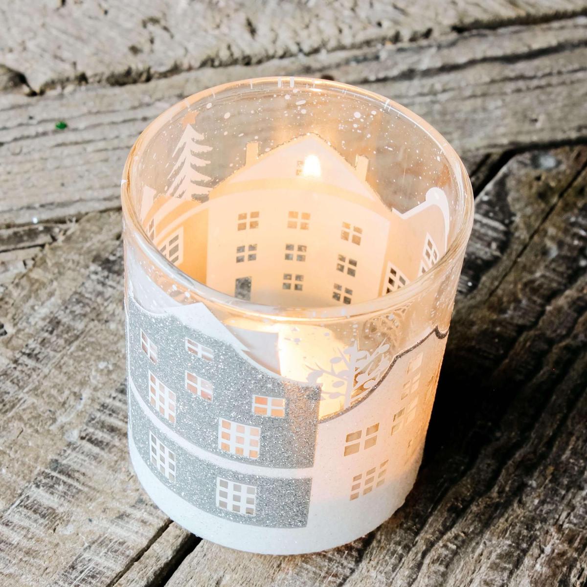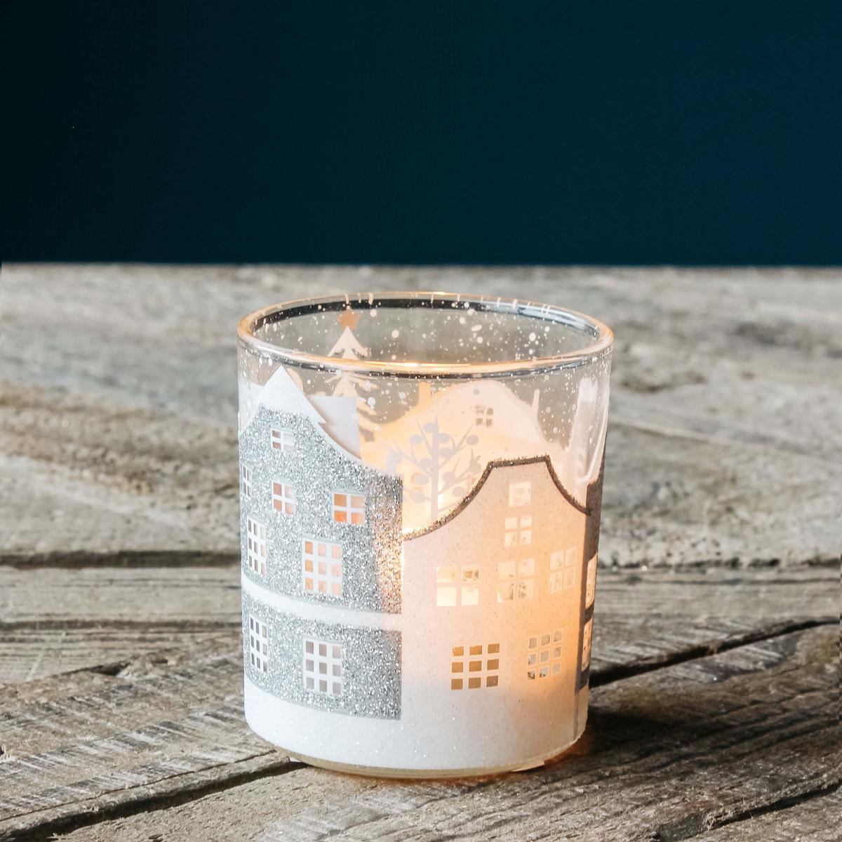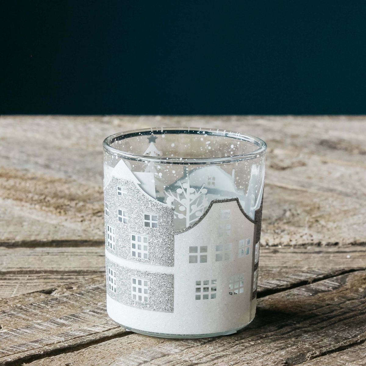 Light up your own home with festive candles placed in the snowy town of this tea light holder. H8 x Diameter 7cm. Made of glass. Due to the nature of the design, the pattern and finish may vary.