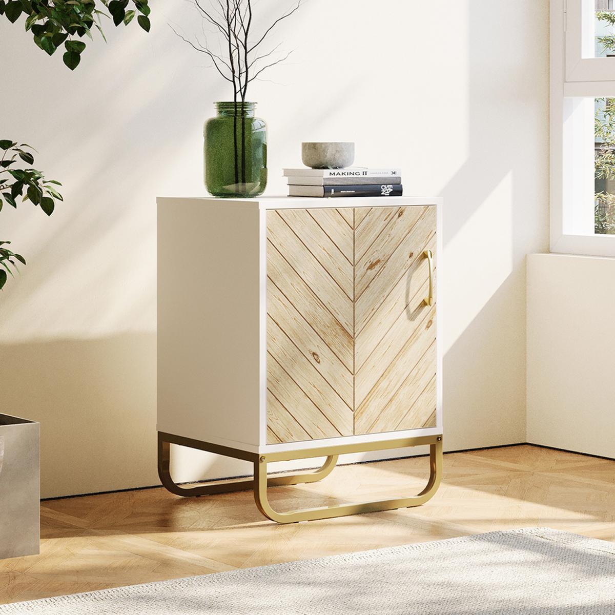 You'll be captivated by the timeless charm of this wooden door cabinet. With its white finish and unique wooden door, this cabinet serves as a standout piece in any room, breaking the monotony of conventional designs. Resting on a sturdy U-shaped metal base, it offers stability and style. Inside, built-in shelves provide organized storage for daily essentials. Made from premium MDF, it promises durability and resistance to deformation, ensuring it remains a long-lasting addition to your space.