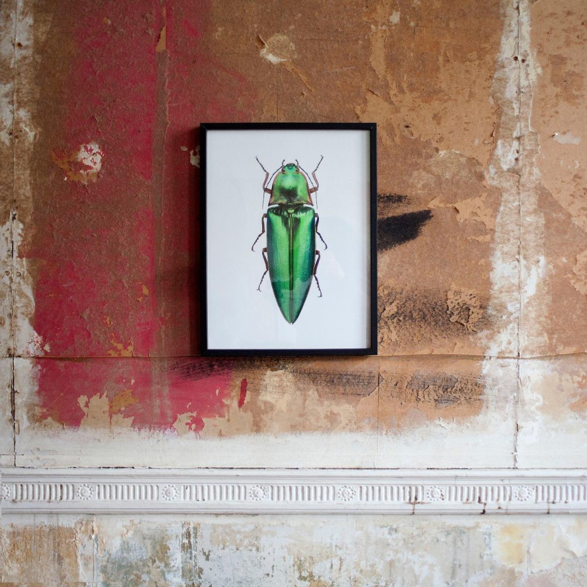 Displayed in a black wooden frame, our campsosternus aur print promises to add interest and intrigue to your walls. Influenced by Göran Liljeberg and his love for insects and other small creatures, this unique piece boasts vivid green tones, instantly brightening your interior space. H42 x W32 x D2cm. Includes black wooden frame.