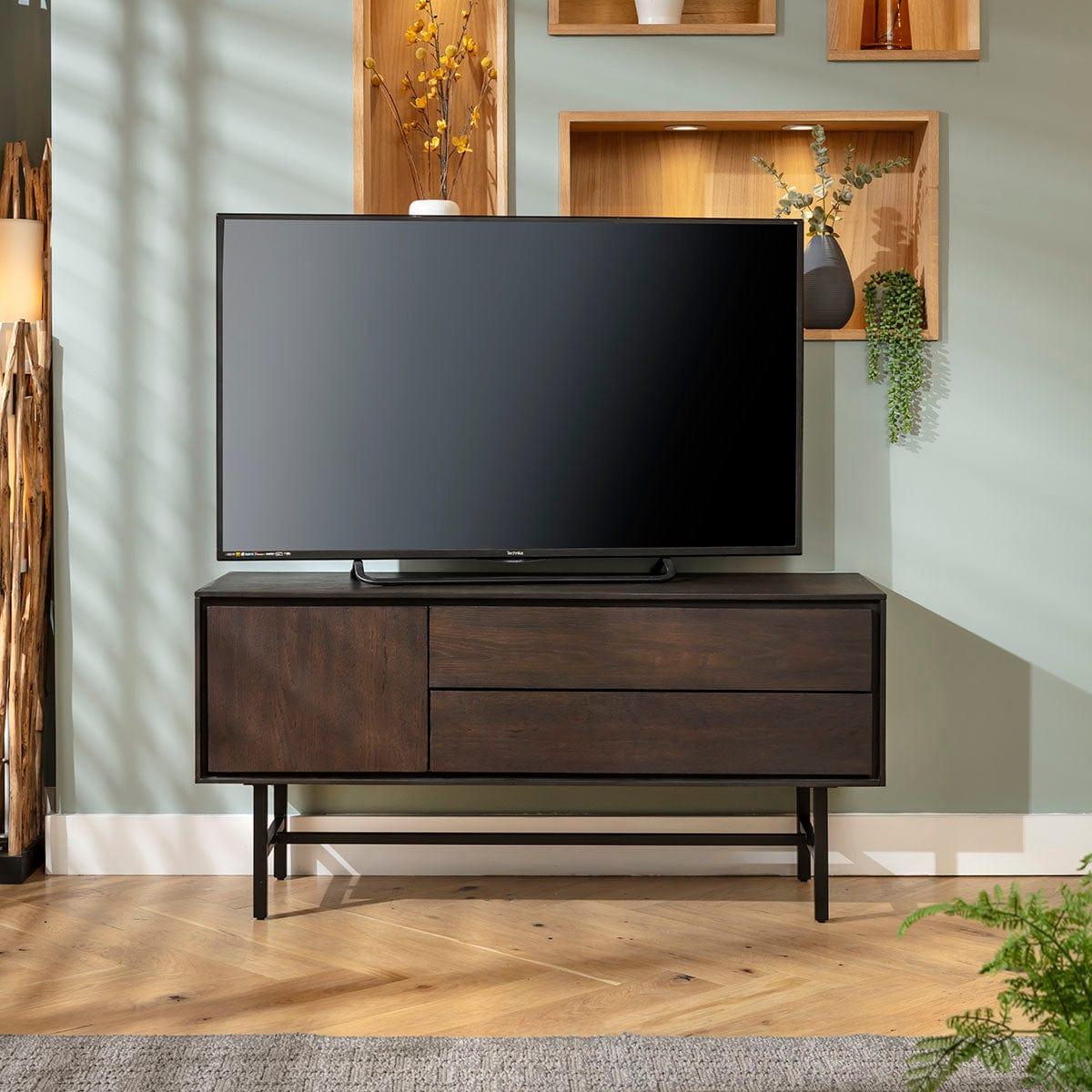 This versatile wooden TV unit combines modern style with practical storage, making it one of the most functional television stands available. Whether used as a freestanding media unit or wall mounted TV stand, this compact design works beautifully in small spaces. This is a premium dark wooden TV stand that doubles up as a wall hung TV cabinet - built to last. Crafted in high-quality dark wood, this 125cm wide TV cabinet delivers sleek modern appeal. At 42cm deep, it arrives preassembled - simply attach the included metal legs, or use the integrated French cleat wall mounting system for a floating effect. Standing 60cm tall with legs, or 35cm without, this stylish TV unit also pairs with other furniture from the Grado collection. This small TV stand maximises organisation with a 35cm wide, 35cm deep, 27cm high cupboard, a 72cm wide, 31cm deep, 8cm high drawer, and a 72cm wide, 34cm deep, 11cm high flap-door compartment. Designed for compact spaces, this wooden TV unit combines style and practicality, offering a media unit that feels spacious. W125cm D42cm H60cm French cleat wall hanging bracket included Supplied preassembled, you’ll simply attach the legs