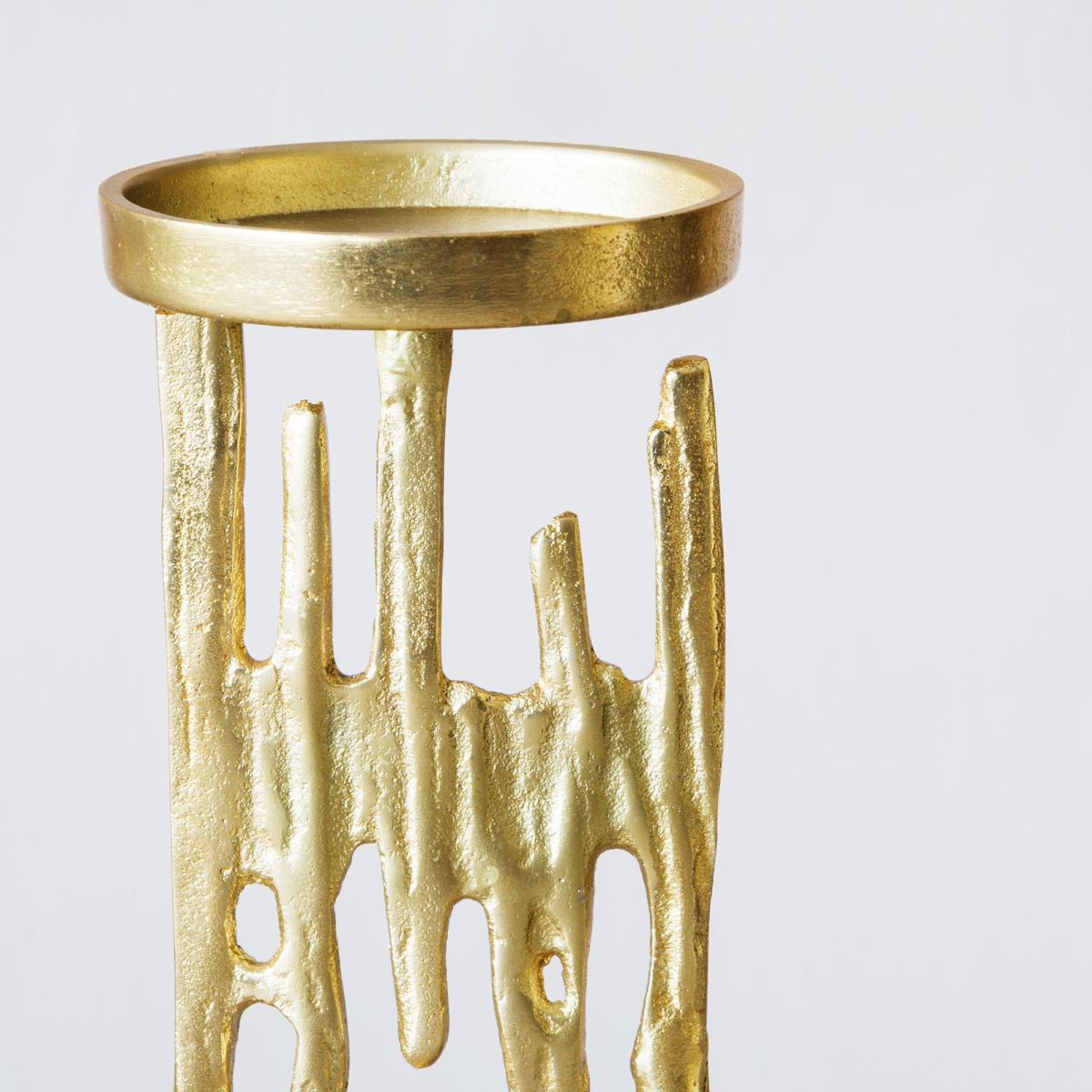 Golden candle holders with an electric lightning design to bring energy and flair to your dinner table or mantlepiece. Small (EDZ1005): H18 x W15. 5 x D10cm. Medium (EDZ1004): H30 x W15 x D10cm. Large (EDZ1003): H45 x W15 x D10cm. Made of recycled aluminium with a gold finish. Holds candles up to 9. 5cm in diameter. Due to the nature of the design, the colour and pattern may vary.