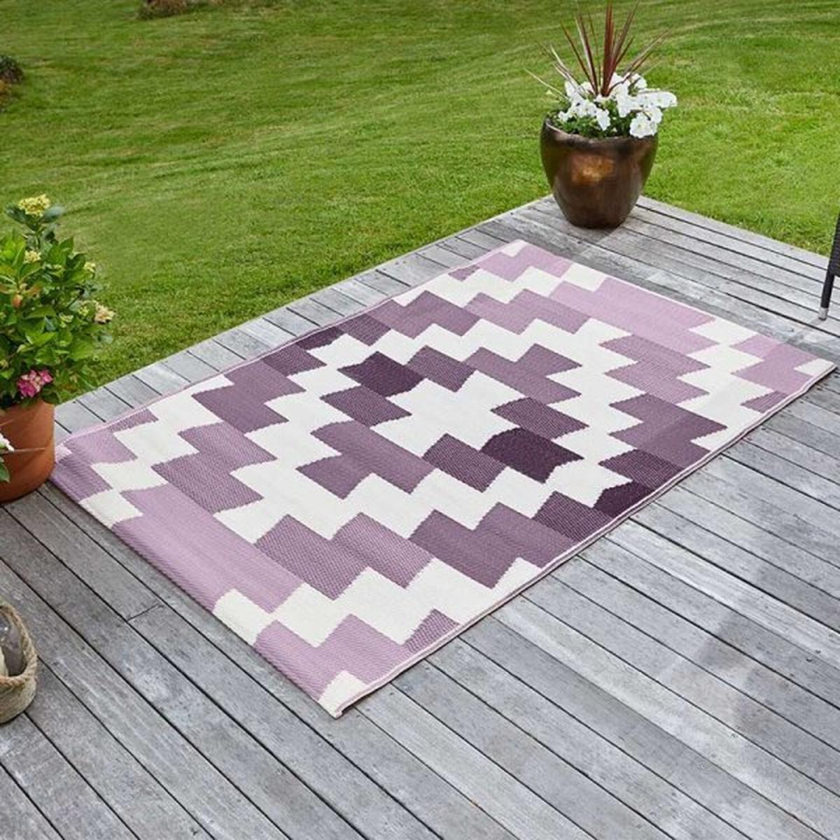 I love this outdoorsy mat because of its modern geometric pattern and neutral colour palette, making it versatile for various alfresco styles. It works particularly well in contemporary or Scandinavian garden setups, adding a touch of texture without overwhelming the space. For practical styling tips, pair it with sleek outdoor furniture and complement with cosy cushions or throws in similar muted tones to create a cohesive look. Its durability and low maintenance also make it ideal for outdoor use, helping to define a relaxed dining or lounging area while keeping things practical.