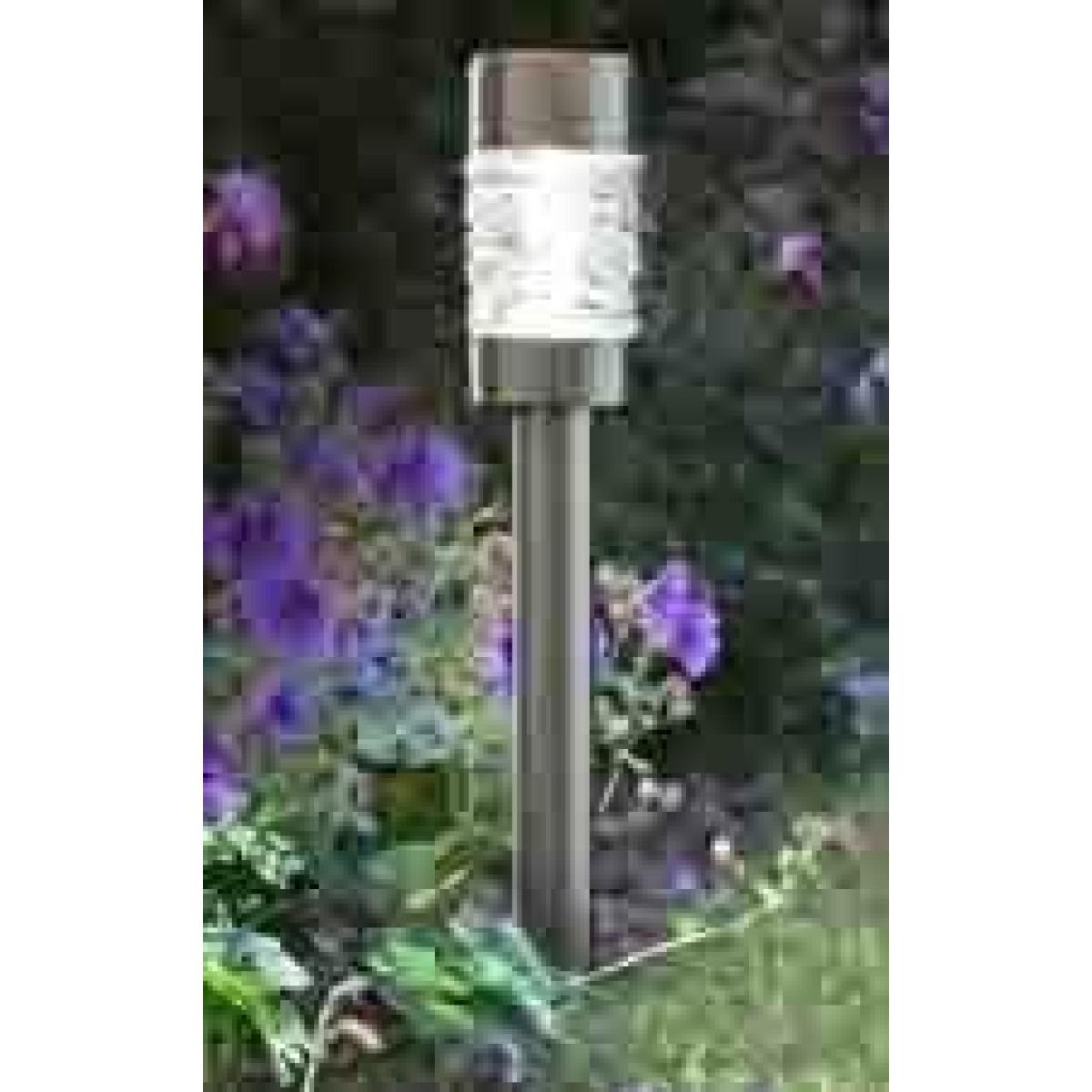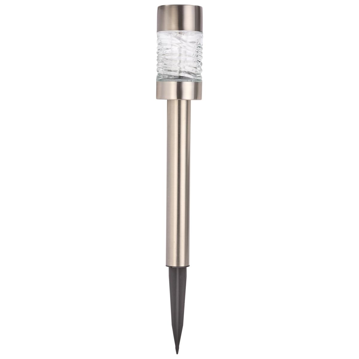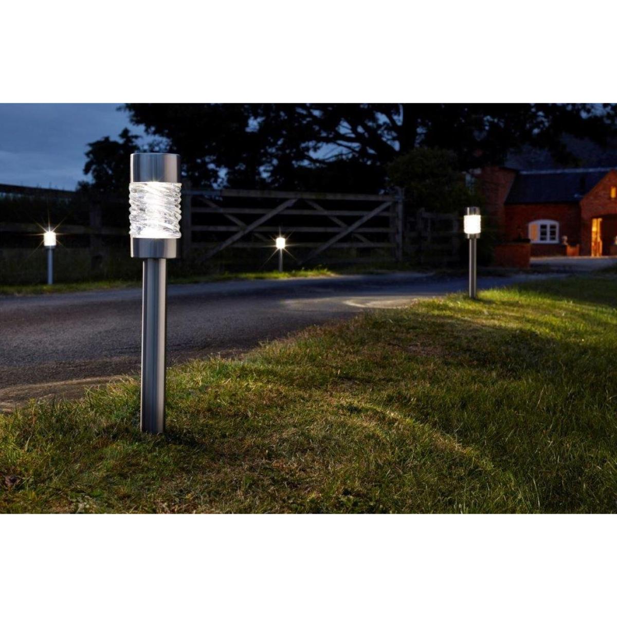 Brighten up your garden with this stylish set of three Martello 5. L solar stake lights. Made from brushed stainless steel with a glass lens, each light delivers a cool white glow at 5 lumens. Ideal for paths, borders and driveways, they automatically light up at dusk and charge during the day. Easy to install with no wiring required, just stake into the ground and enjoy instant ambience. Features: Designer faceted glass lenses that optimise light dispersal Glass tops are removable for use as tabletop lanterns Up to 6 hours run time Automatically illuminates during darkness 5 Lumen Super Bright lighting H 57cm