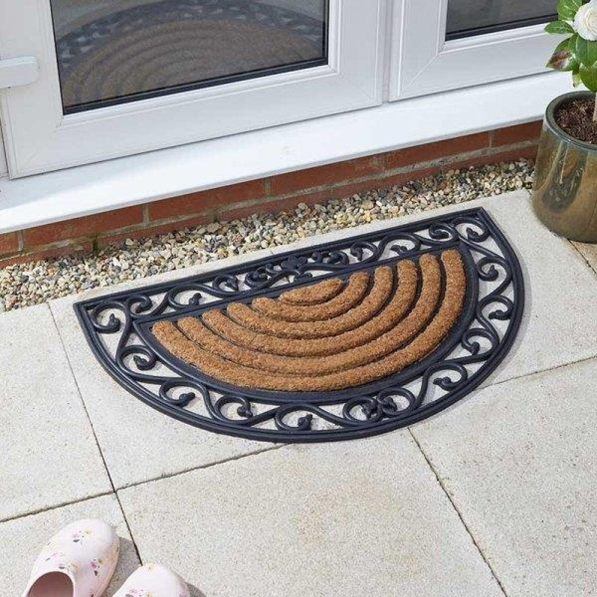 I love this half-moon doormat because it combines practicality with a touch of character, making it an effortless addition to both modern and traditional entrances. Its generous size (75x45cm) provides ample space for visitors to wipe their boots, and the dual-texture design is perfect for trapping dirt and moisture. It works particularly well in porches or front entrances where there's a need for durability and ease of maintenance. For styling, consider pairing it with similar black or natural-toned accessories, like outdoor lanterns or planters, to create a cohesive look. To keep it looking its best, position it in a sheltered spot to prevent excessive wear from harsh weather.