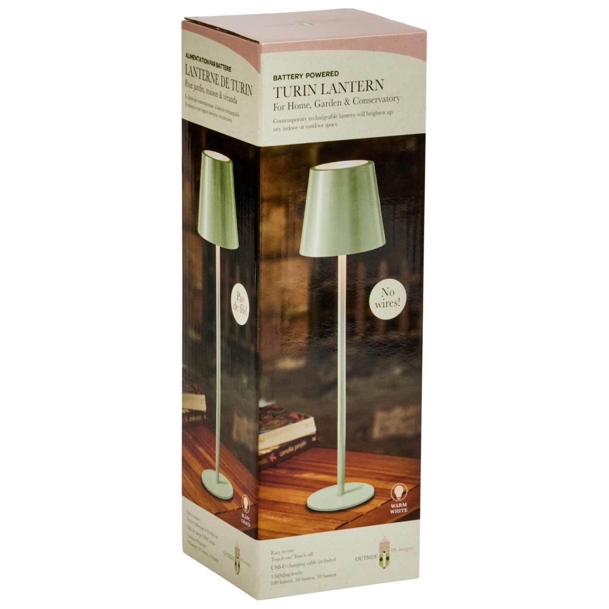 Modern Rechargeable Lantern – Smart Garden Turin Lamp in Sage Green Illuminate your space with this contemporary rechargeable battery lantern, designed to bring a warm, inviting glow to any indoor or outdoor setting. Whether you're creating ambience on a patio or lighting up a cosy reading nook, this lantern is as practical as it is stylish. Contemporary rechargeable battery lantern will brighten up any indoor or outdoor space Battery/USB powered Easy to use: Touch on / Touch off 3 lighting levels: 100 lumen, 50 lumen, 10 lumen USB-C charging cable included Dimensions:Height 33cm x  Diameter 10cm