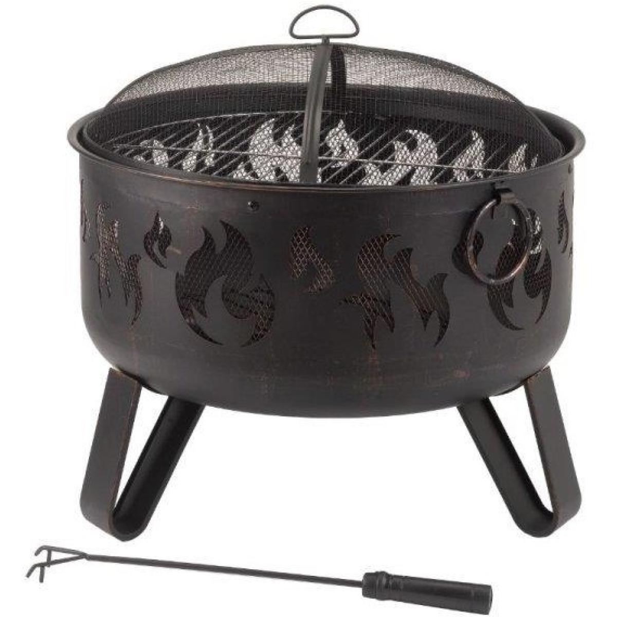 Keep the cold at bay with this striking flame design deepbowl firepit. Striking centre piece for any outdoor space.  Hard wearing powder coated steel with hand-painted brushed bronze effect finish.  Chrome plated grill for barbeque-style cooking.  Fuel grate increases airflow, keeping flames burning for longer.  Three leg design provides stability and increases airflow for heat dissipation.  For use with untreated wood, small dry logs or wood briquettes.  Use lumpwood charcoal when cooking on a firepit.   Easy-lift handles and safety tool included.  Quick and easy self-assembly.  Full instructions included.  Assembled dimensions: H58cm x W61cm x D61cm. *All measurements are approximate.
