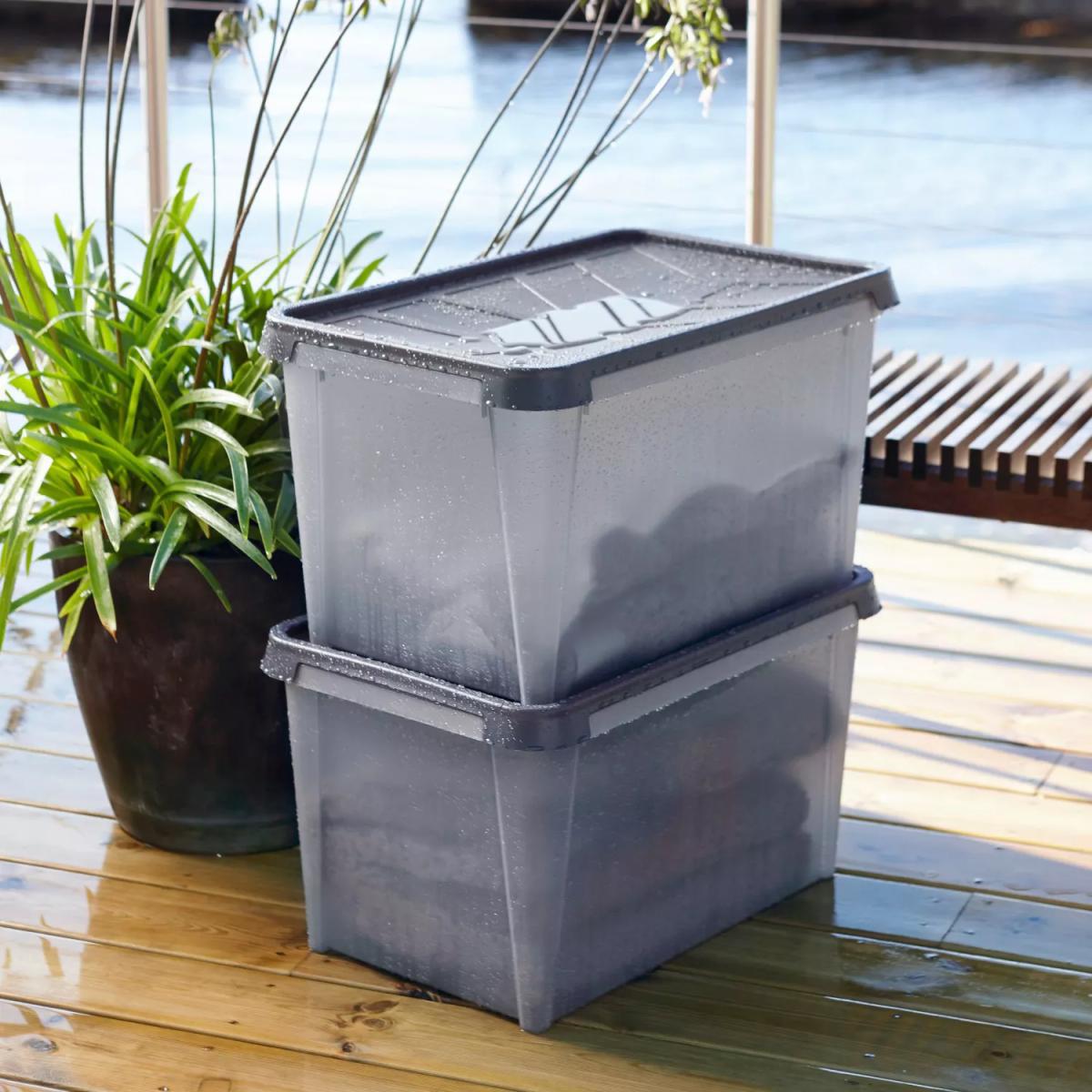 This stackable storage box is completely watertight (IP64) to keep out damp, dust, dirt and, bugs. Great for the garage, the loft, or when camping or caravanning. Can withstand temperatures from -40°C to 70°C and food approved. Dimensions: 33. L: Outer, L50 x W40 x H27cm. Inner, L41 x W30.5 x H23.5cm 45. L: Outer, L60 x W40 x H35cm. Inner, L49 x W29.5 x H31.5cm
