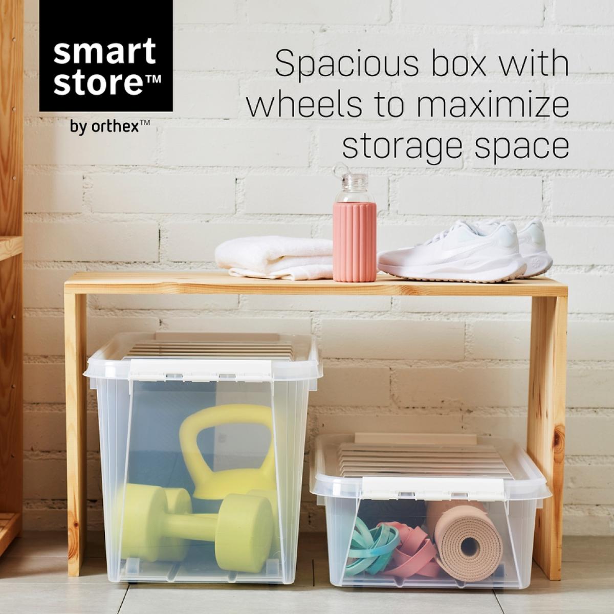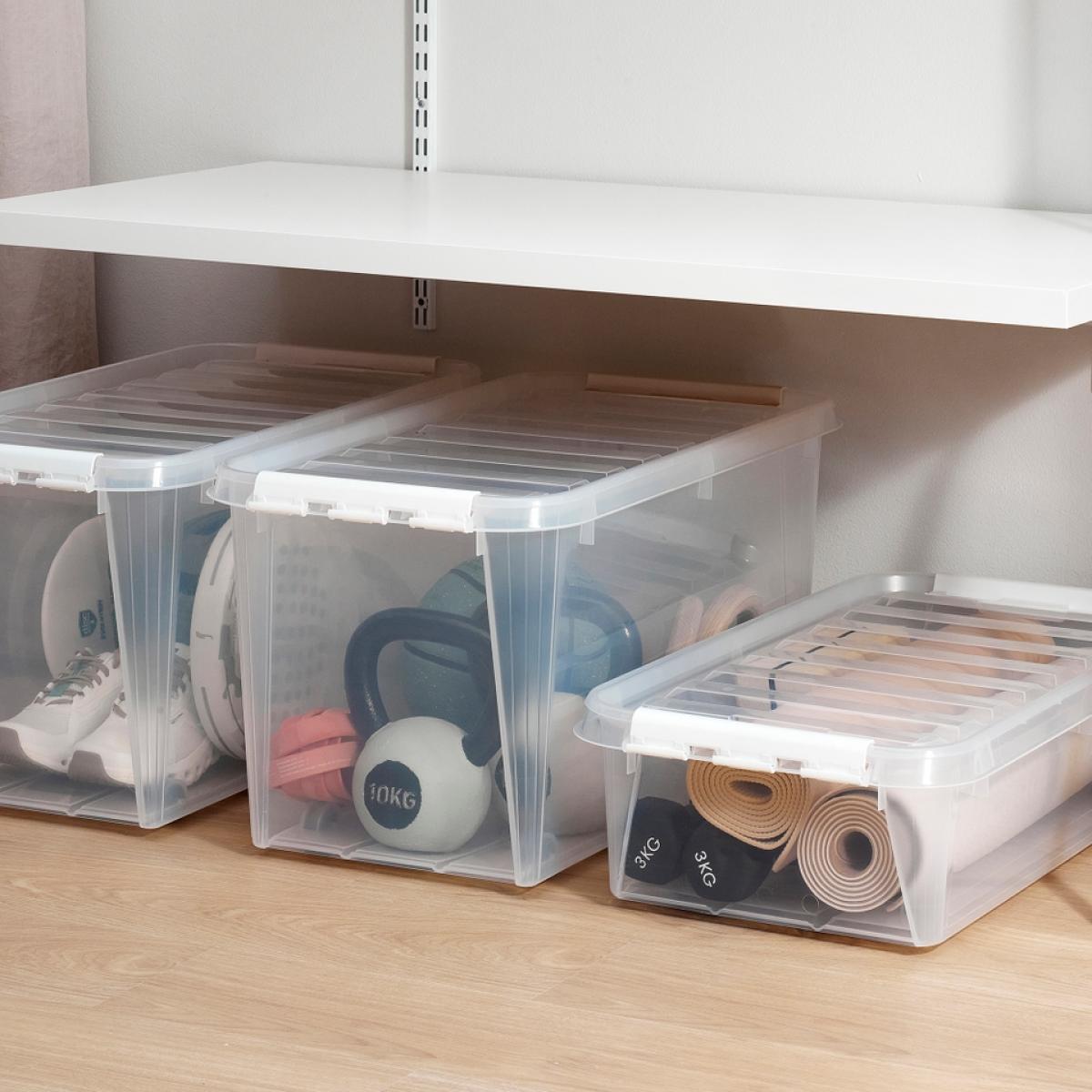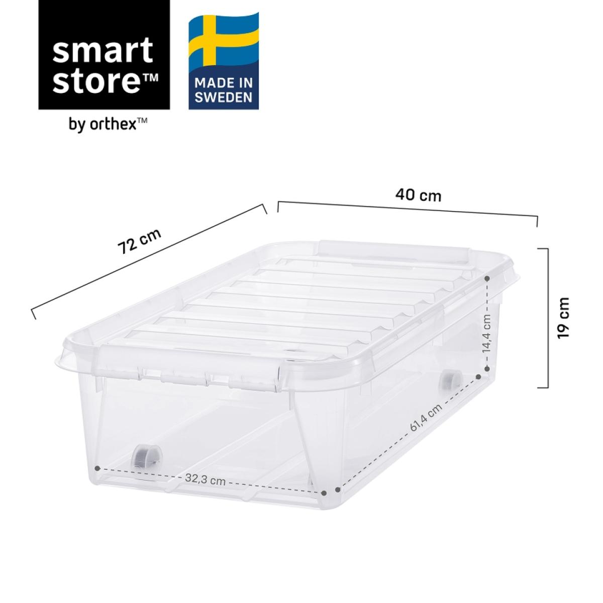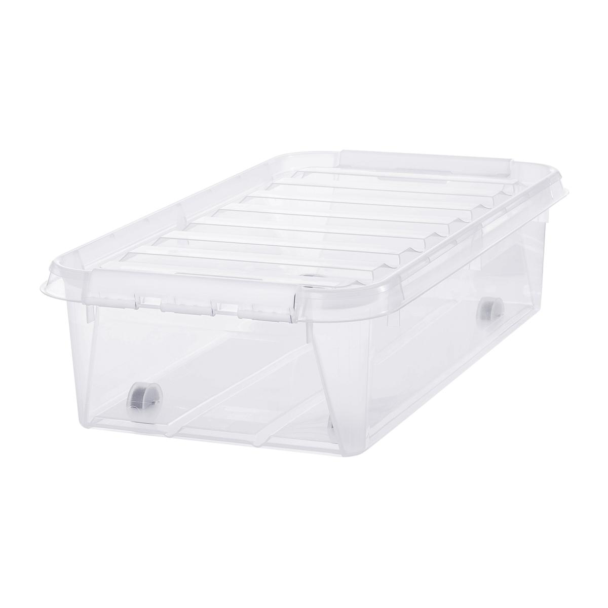 A spacious low storage box with wheels for your all-round storage requirements under, ideally under the bed. It is the ideal size for storing extra blankets, cushions, pillows and quilts. The boxes nest without lids and you can stack them with the lids on. The sturdy clips keep will keep the lid firmly in place. The clips are strong and are made of recycled plastic.