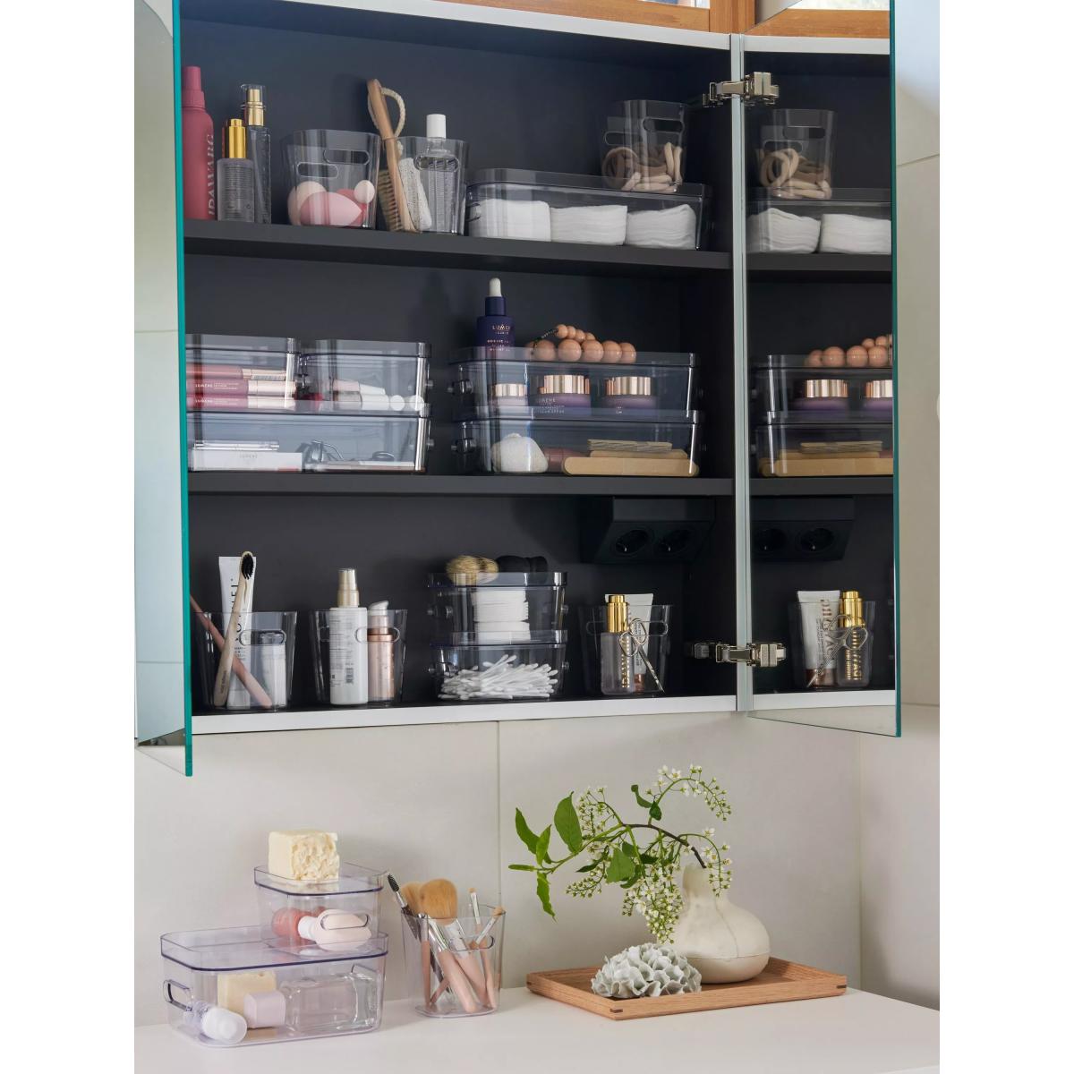 I love this little clear storage box for its versatility and neat organisation potential. Its transparent design makes it easy to identify contents at a glance, which works well in both modern and minimalist interiors as well as in utilitarian spaces like offices or craft rooms. I’d suggest using it for organising small items such as jewellery, office supplies, or kitchen bits. Practical styling tips include stacking a few for maximising space or pairing it with matching containers in different sizes for a cohesive look. Its compact size also makes it ideal for desktop or bedside table storage, keeping essentials tidy without cluttering the surface.