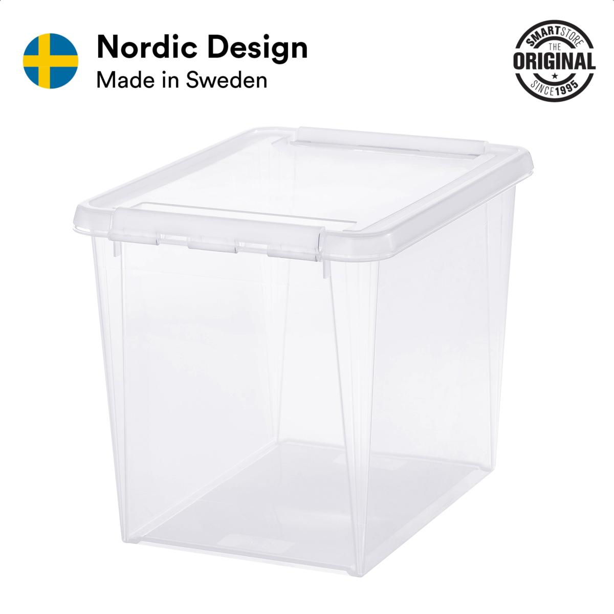 Simplify your storage needs with the Smart Store Home 25. L Set of 3 Boxes in Clear. Designed with a 10-year guarantee and strong clip closures, these transparent boxes offer secure organization. With a total capacity of 75 liters (3 x 25 liters), this set provides ample space for storing a variety of items in your home.
