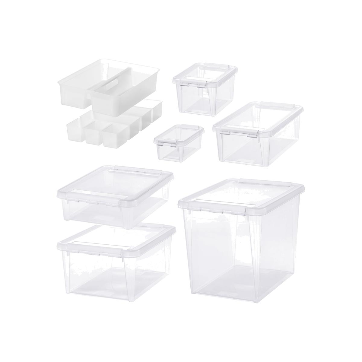 Experience comprehensive organization with the Smart Store Home Bundle Set of 8 Assorted Boxes in Clear. Backed by a 10-year guarantee and featuring strong clip closures, this set offers a range of box sizes to accommodate various storage needs. With these versatile boxes, you can keep your belongings well-organized and easily accessible.