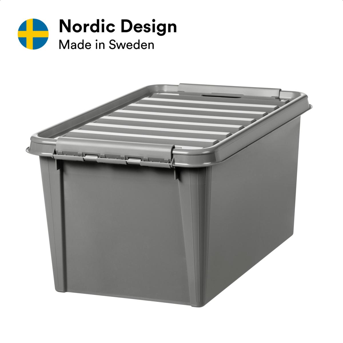 Maximize your storage capabilities with the Smart Store Recycled 47. L Set of 3 Boxes in Grey. Built to last with a 10-year guarantee and strong clip closures, these boxes are perfect for organizing your belongings. With a total capacity of 141 liters (3 x 47 liters), this set offers spacious storage options for your convenience.