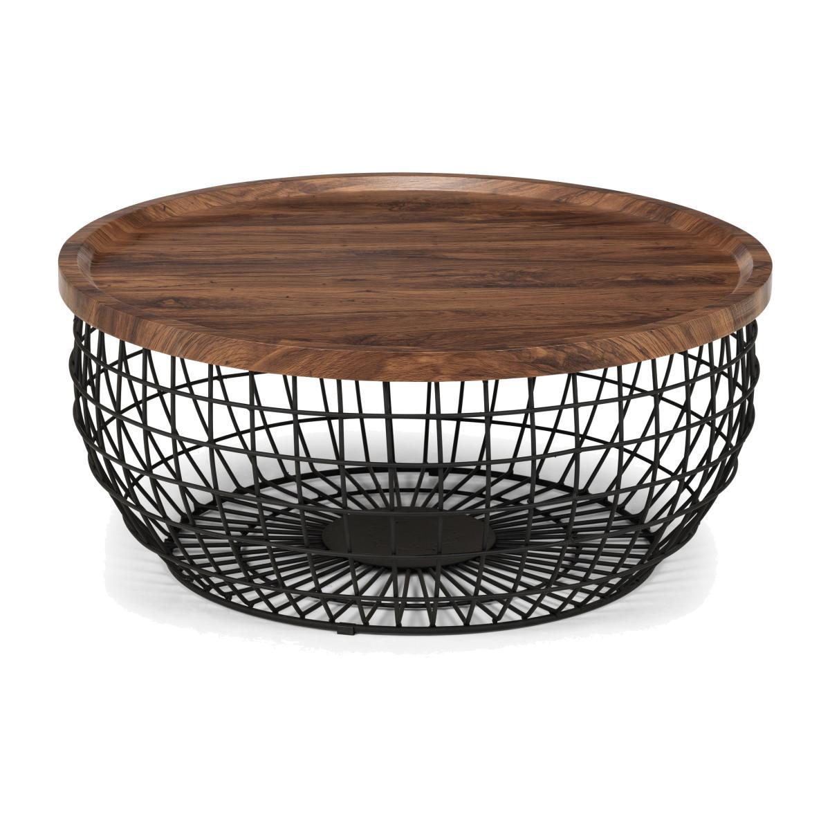 This coffee table is perfect for adding an elegant yet modern touch to your home. This coffee table has a walnut top with a black wire base that boasts an industrial look. This table has a raised lip around the top to prevent anything easily falling off. Other matching furniture is also available. This coffee table is perfect for storing blankets, book or any other bits and bobs.