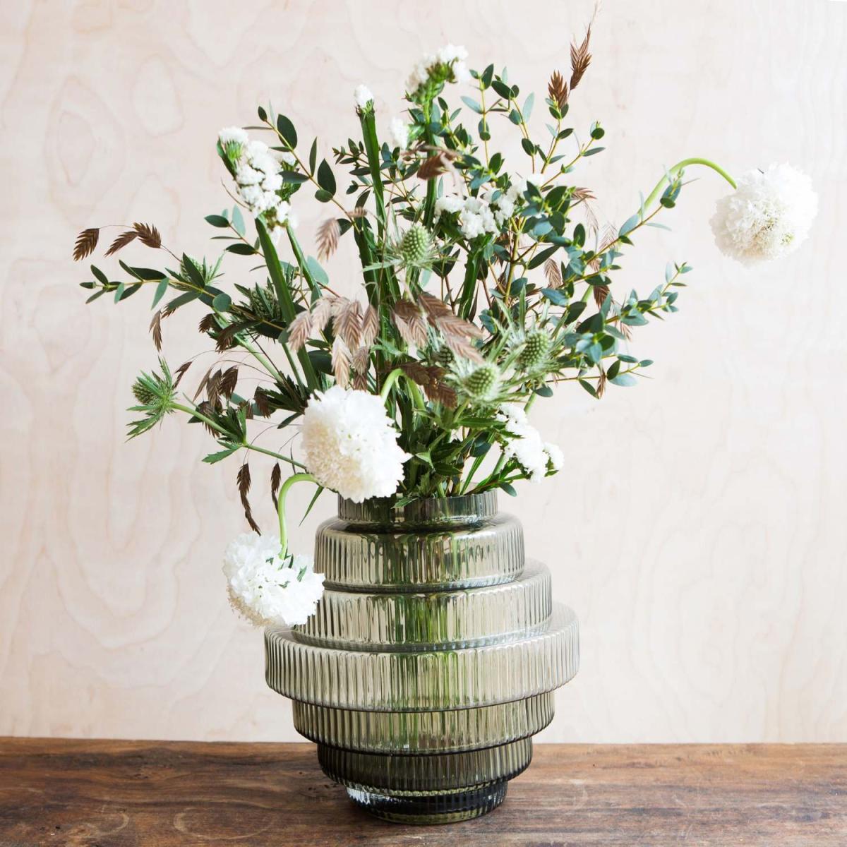 Crafted in a smoke green hue, this grooved vase is as aesthetic as it is functional. In a tiered, concentric and sculptural design, this generous vase would suit long stemmed botanicals and large blooms. H24 x Diameter 22cm. Made from glass. The exact size, colour and shape may vary.