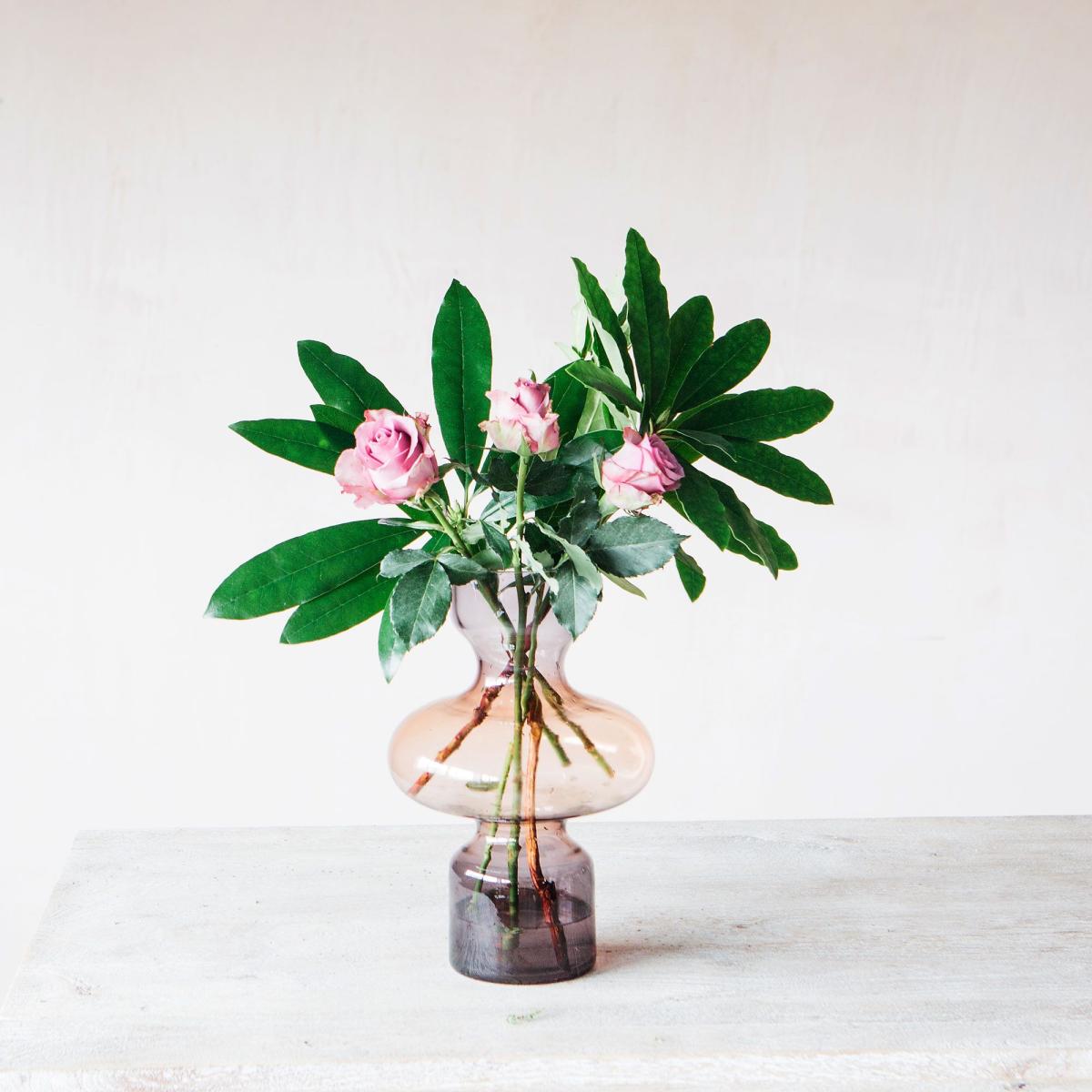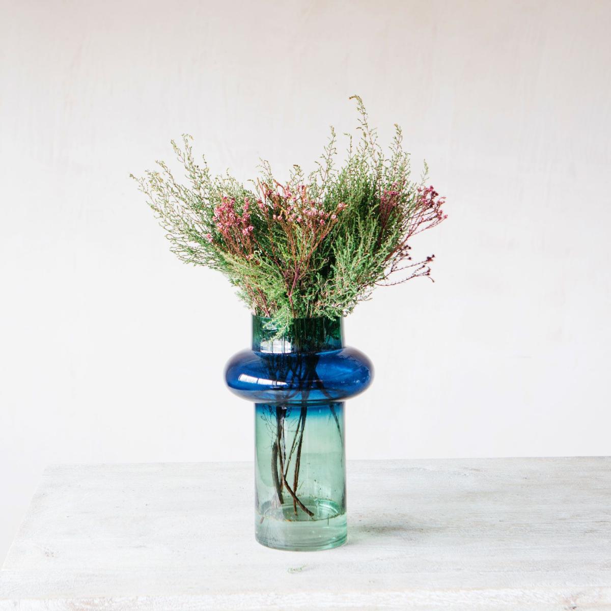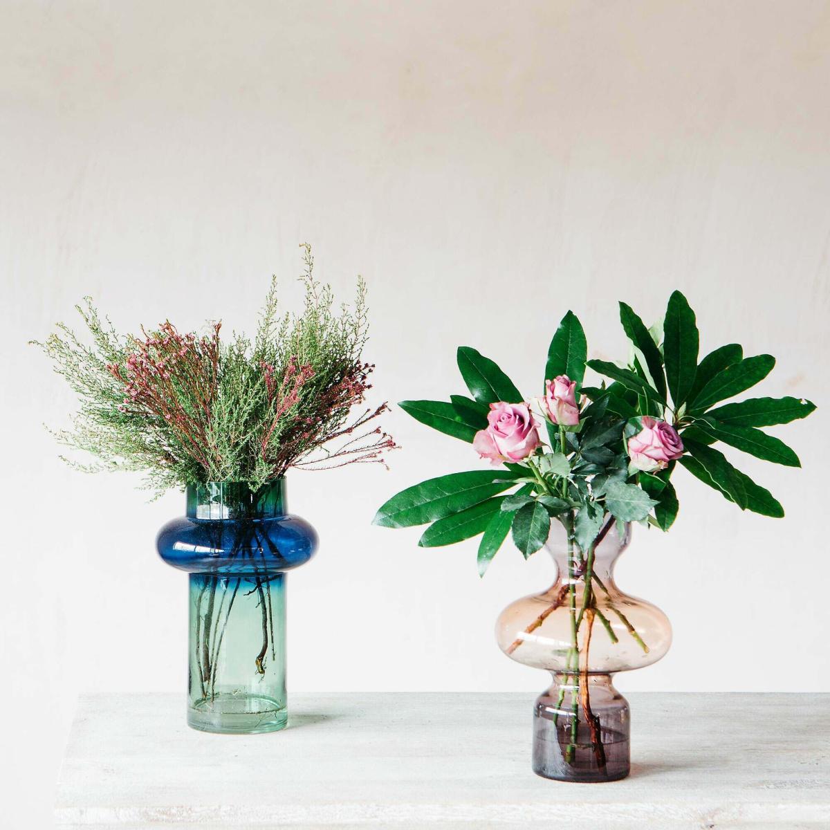 A retro-inspired glass vase with a unique shape and two-tone ombre design. Perfect for displaying your floral arrangements and available in two colours.