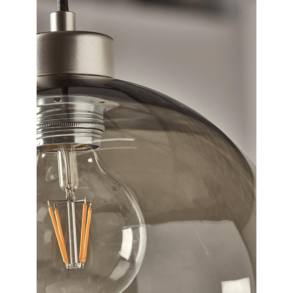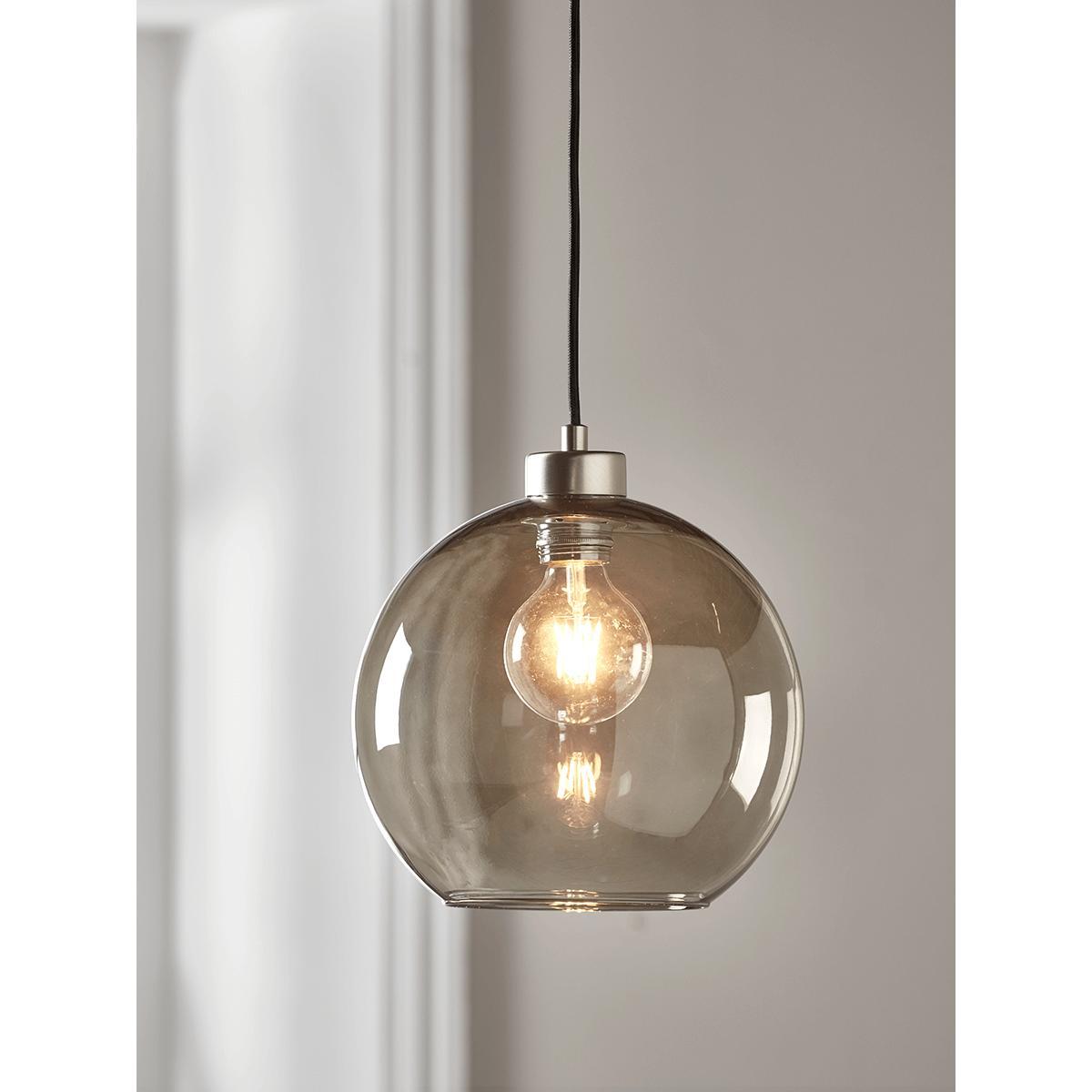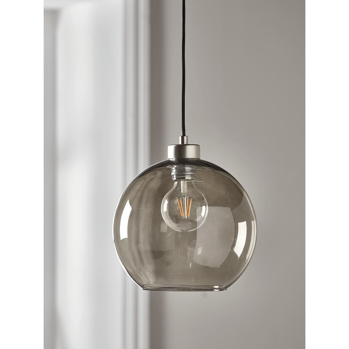 Perfectly domed, with a simple brushed silver fitting to the top, our simple, Scandinavian style pendant light will create an atmospheric glow in any space. Each piece is crafted from smoky grey glass, with an opening to the bottom and a black plastic flex.