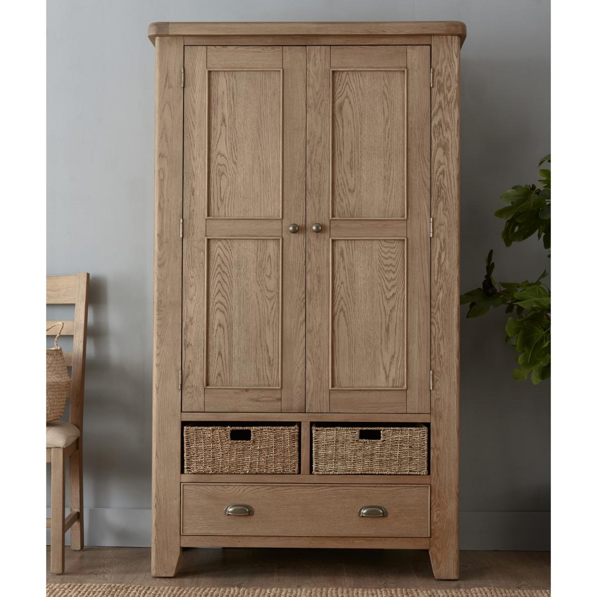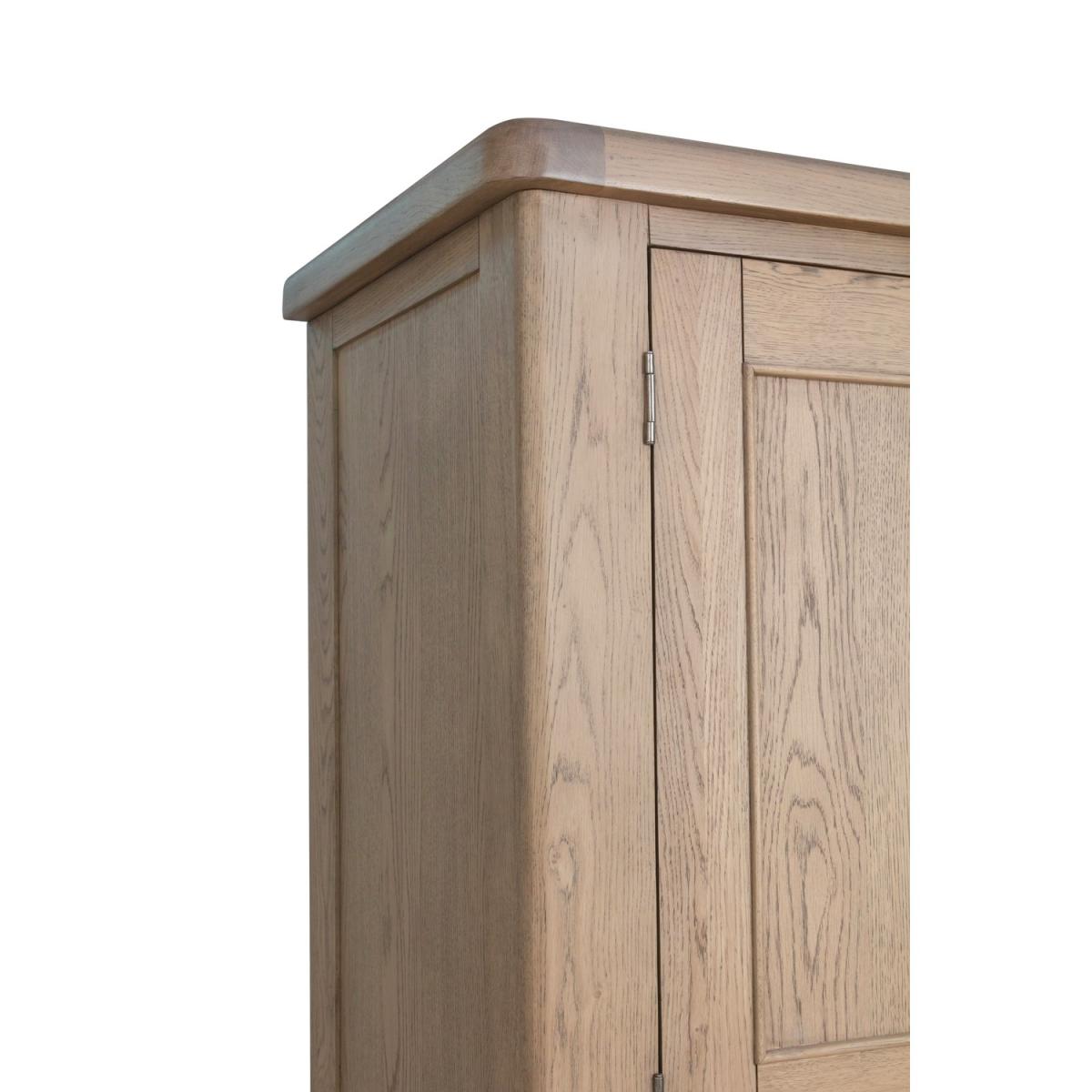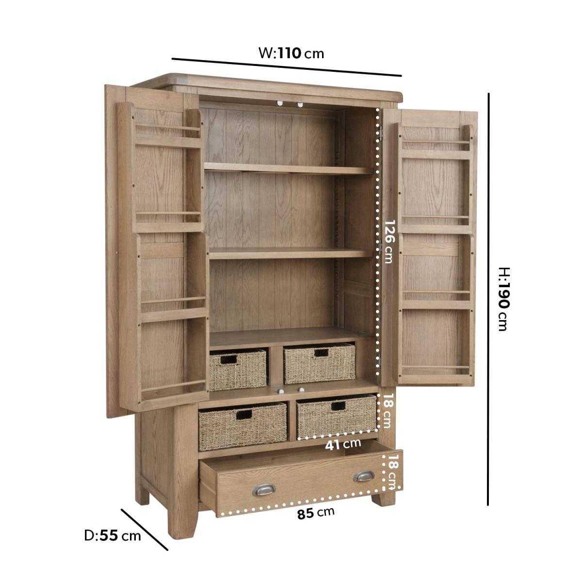 Dimensions:W110 x D55 x H190 cm Complete your kitchen or dining room with the Pegasus larder. With plenty of storage space to store kitchen essentials,it has atimeless style that'll suit any interior. The structure and shelf frames are made of solid wood and the surfaces such as side panels are made of a high quality real oak veneer. Features: 4 Wicker storage drawers Door mounted shelving space Adjustable shelving Magnetic door catches Assembly not required